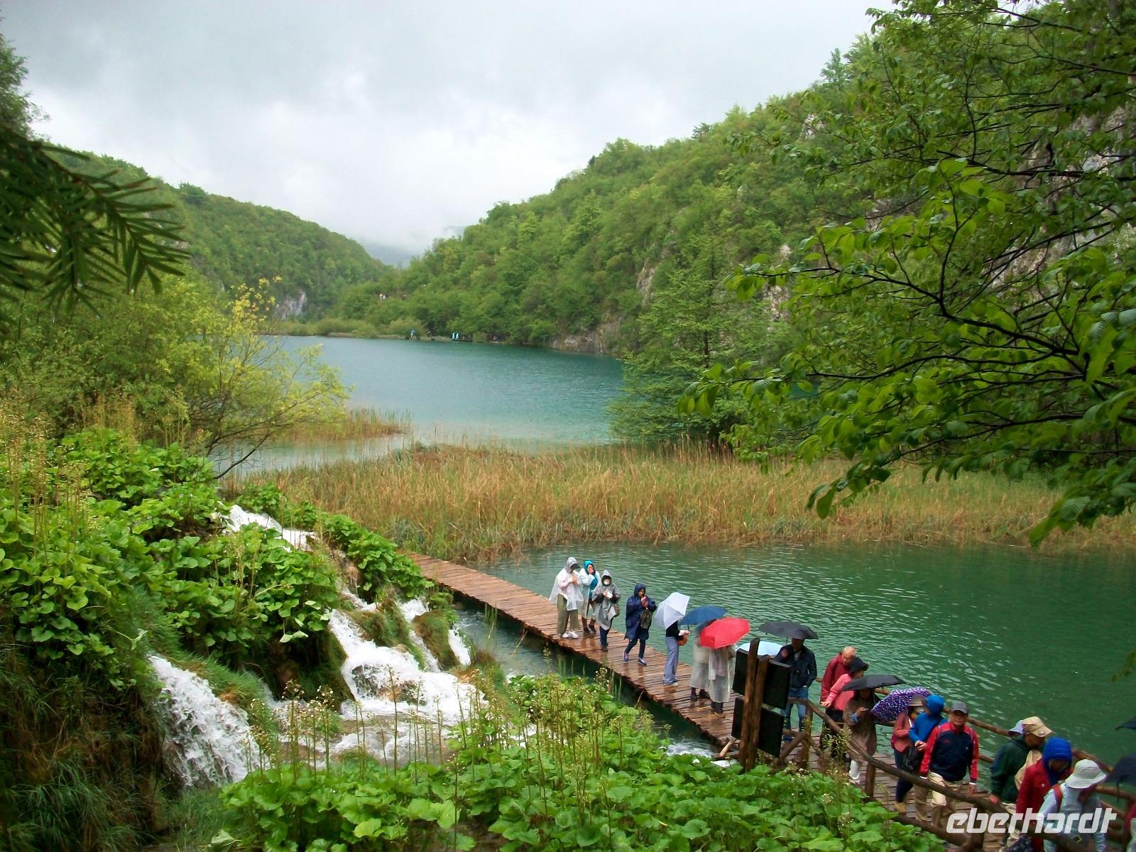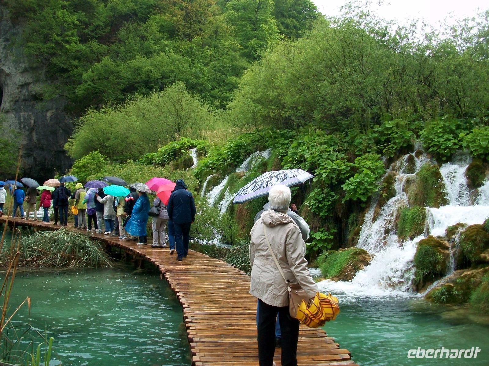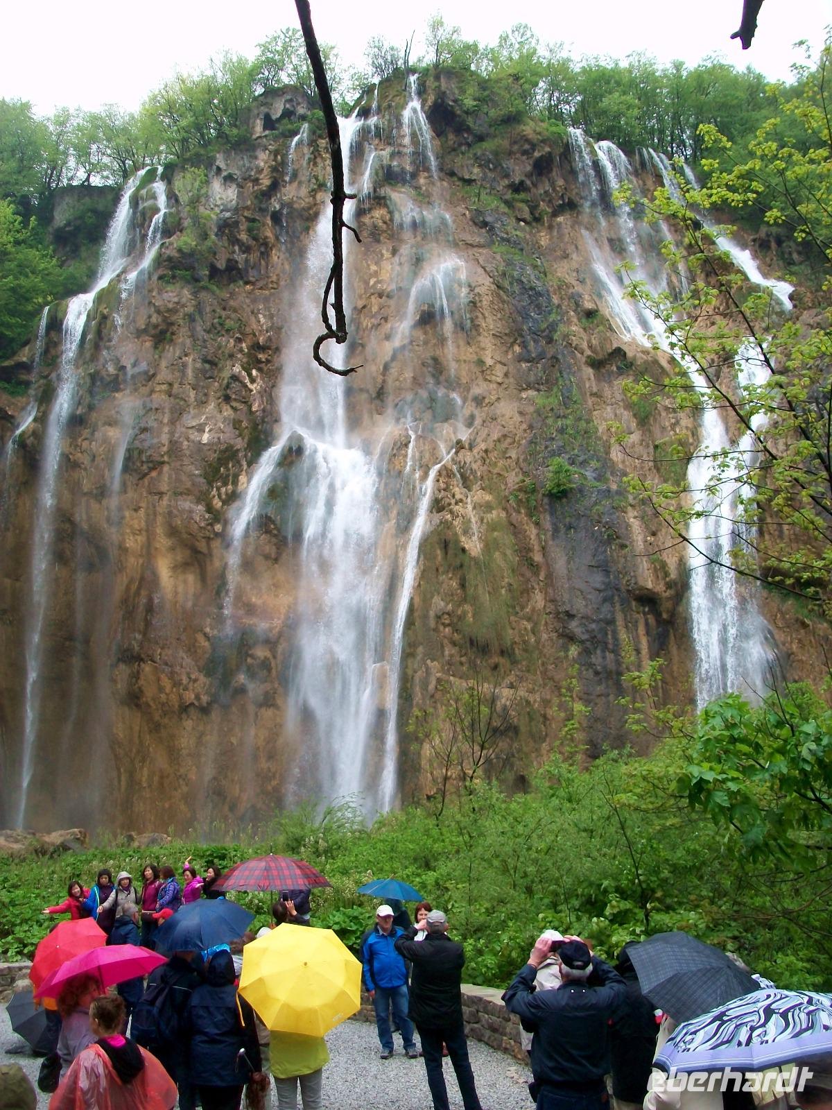 Die Regenschirme bleiben aufgespannt als wir gleich zu Anfang unserer Runde an den Plitwitzer Seen vom Aussichtspunkt den Großen Wasserfall bewundern können. Der Weg senkt sich ab und wenig später stehen wir dann zu Füßen dieses Naturereignisses; von fast 80 Metern fällt das Wasser rauschend herab, atemberaubend!