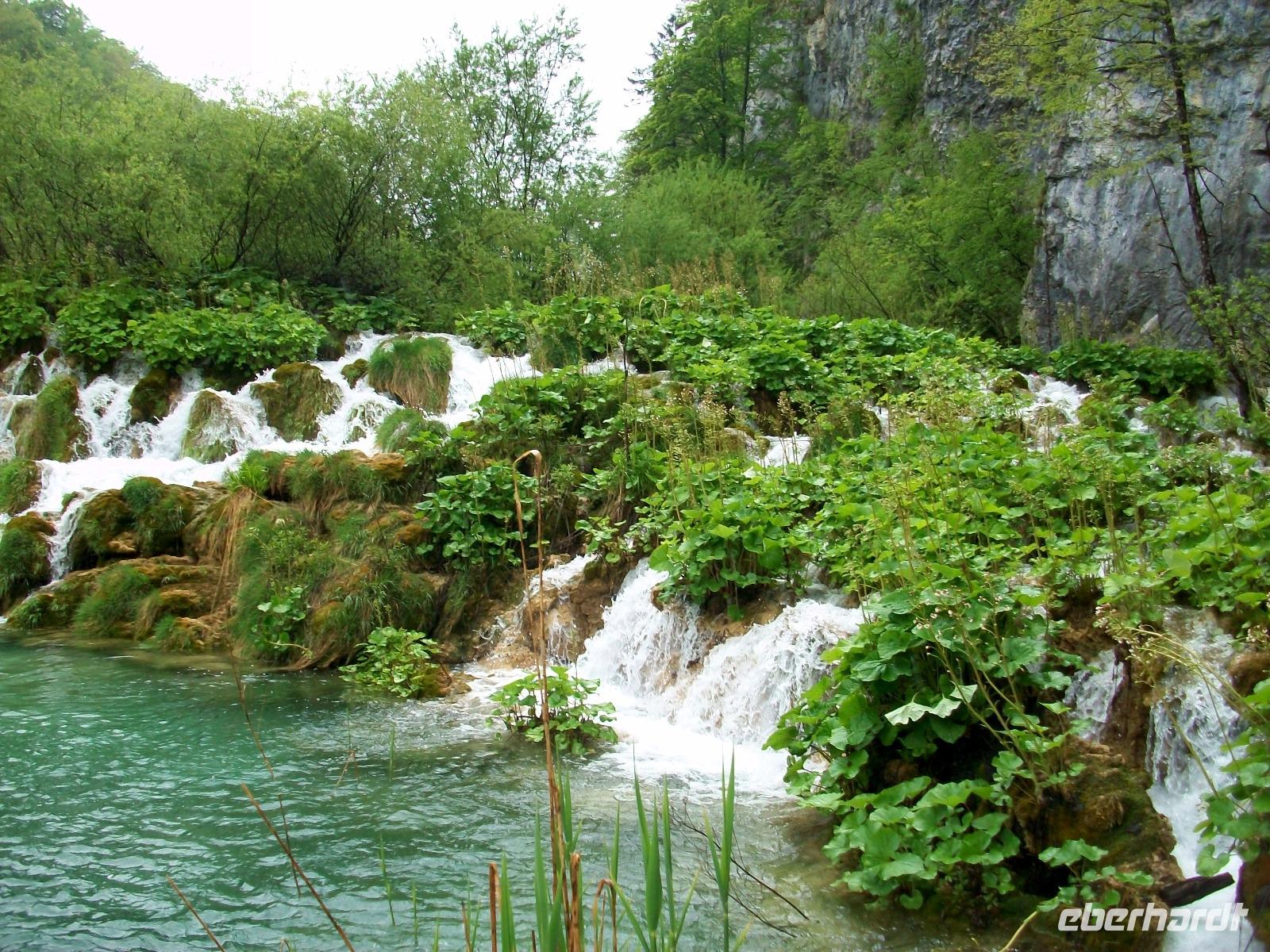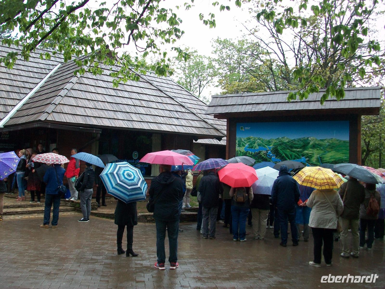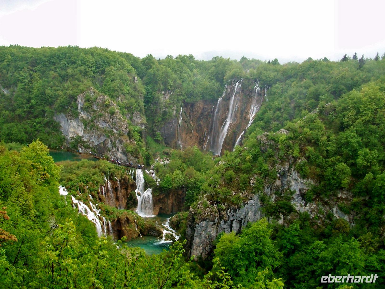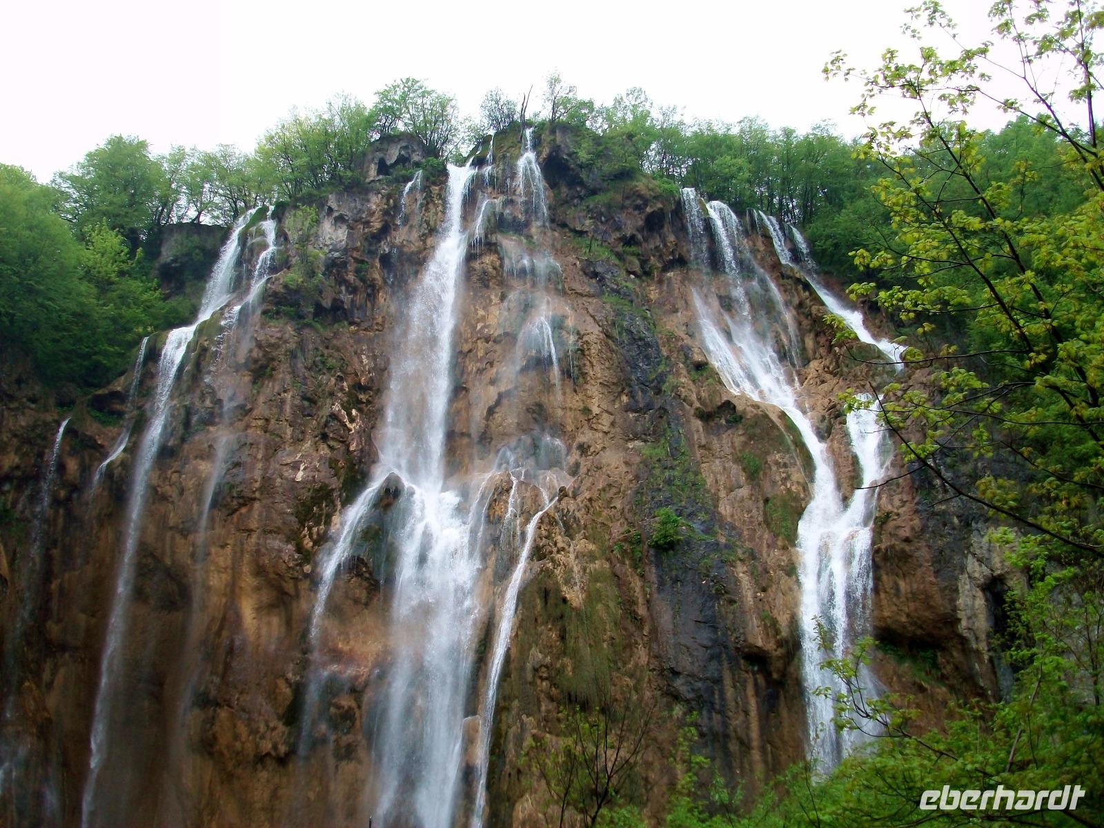 Die Regenschirme bleiben aufgespannt als wir gleich zu Anfang unserer Runde an den Plitwitzer Seen vom Aussichtspunkt den Großen Wasserfall bewundern können. Der Weg senkt sich ab und wenig später stehen wir dann zu Füßen dieses Naturereignisses; von fast 80 Metern fällt das Wasser rauschend herab, atemberaubend!