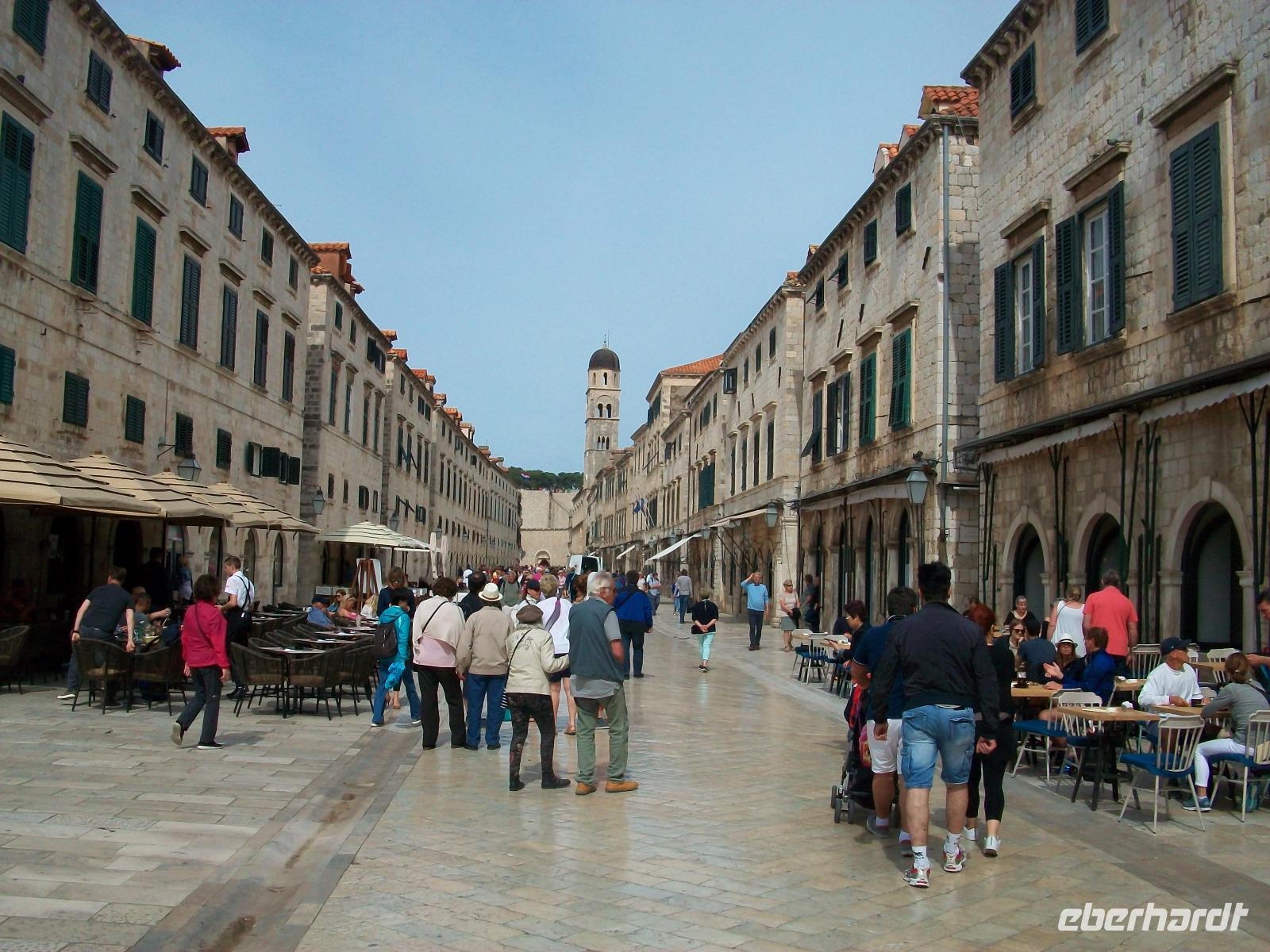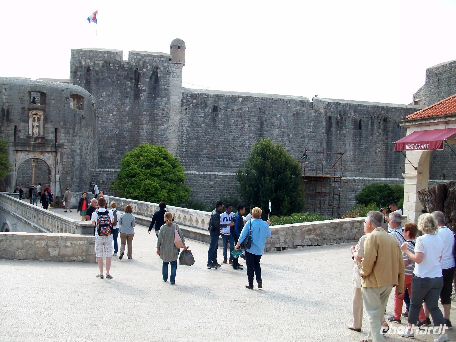 Am Platz Pile erwartet uns Antea, sie wird uns an diesem Vormittag in die Geheimnisse der alten Ragusa einweihen, so hieß Dubrovnik in der Vergangenheit. Durch das Haupttor und über eine Brücke gelangen wir zwischen die mächtigen Festungsmauern der Stadt. Staunend stehen wir vor diesen Zeugnissen aus Stein, gelangen hinunter zur Stradun und tauchen hier ein in das muntere Leben. Zunächst statten wir der Alten Apotheke einen Besuch ab, bewundern den wunderschönen Kreuzgang und das viele Grün in seinem Innenhof. Dann geht es kreuz und quer durch schmale Gassen über belebte Plätze und hinein in den Alten Hafen. Im Rücken den Uhrturm und voraus das Wasser auf dem die zahlreiche Ausflugsboote schaukeln, ein romantischer Ort!