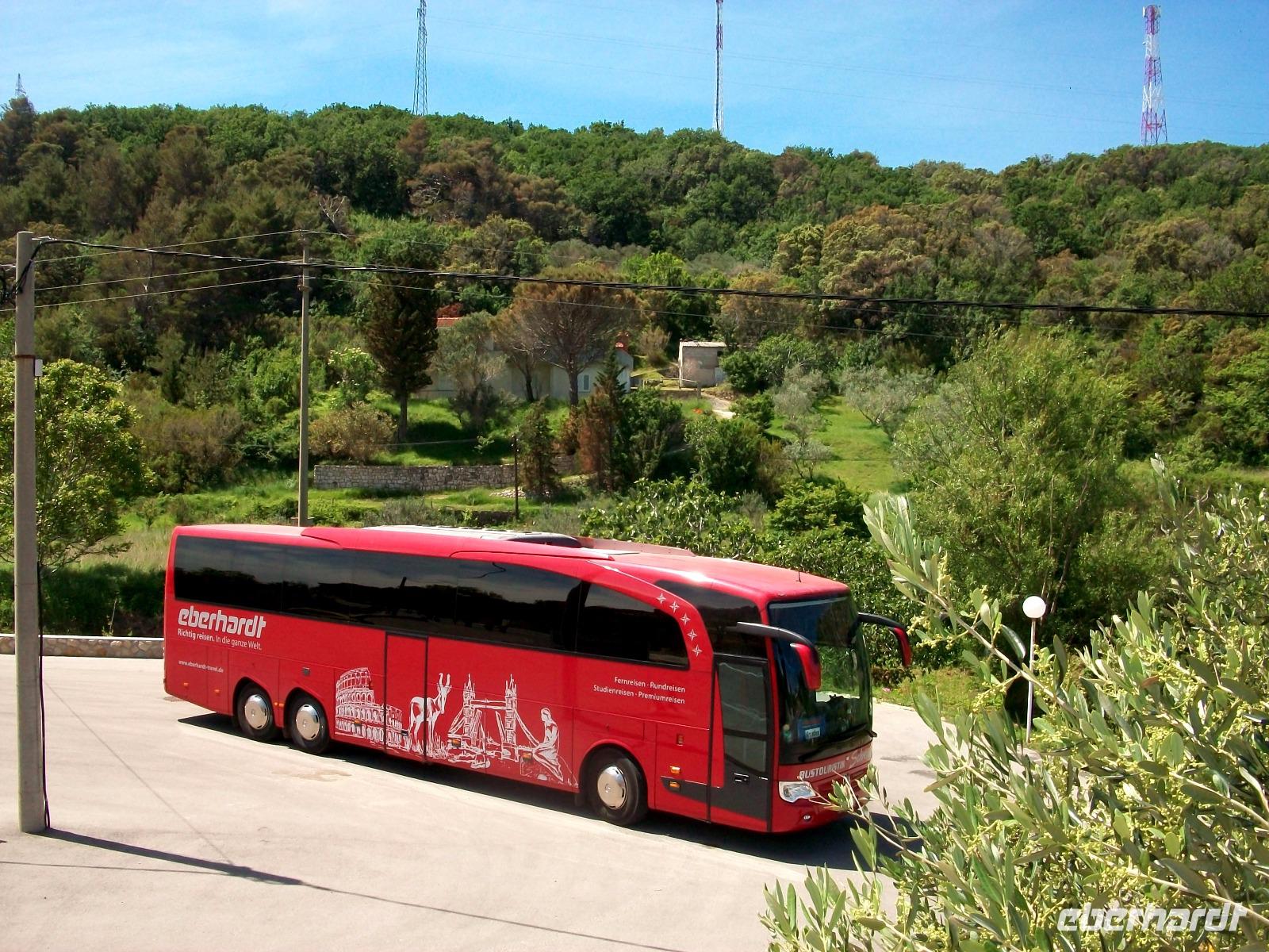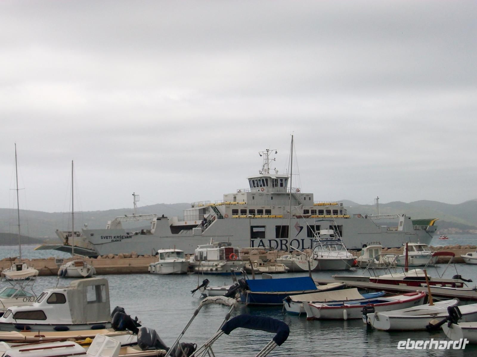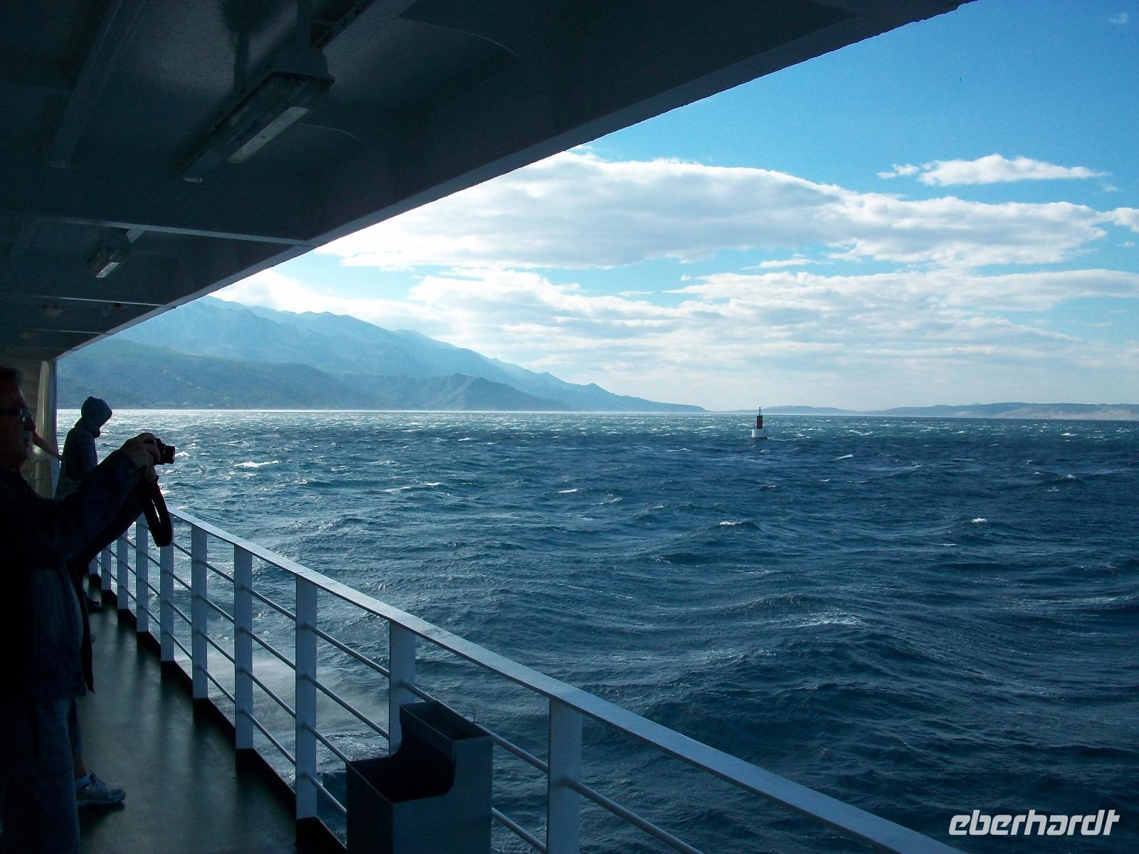 16.5.2017. Wir starten vom Hotel und stehen schon nach 20 Minuten Fahrt am Fährhafen. Bora, die Windsbraut, hat sich eingestellt und rüttelt am Bus. Glücklicherweise hat sie sich aber noch unter Kontrolle, die Fährüberfahrt wird zwar begleitet von manchem Windstoß aber es bleibt noch im Rahmen.