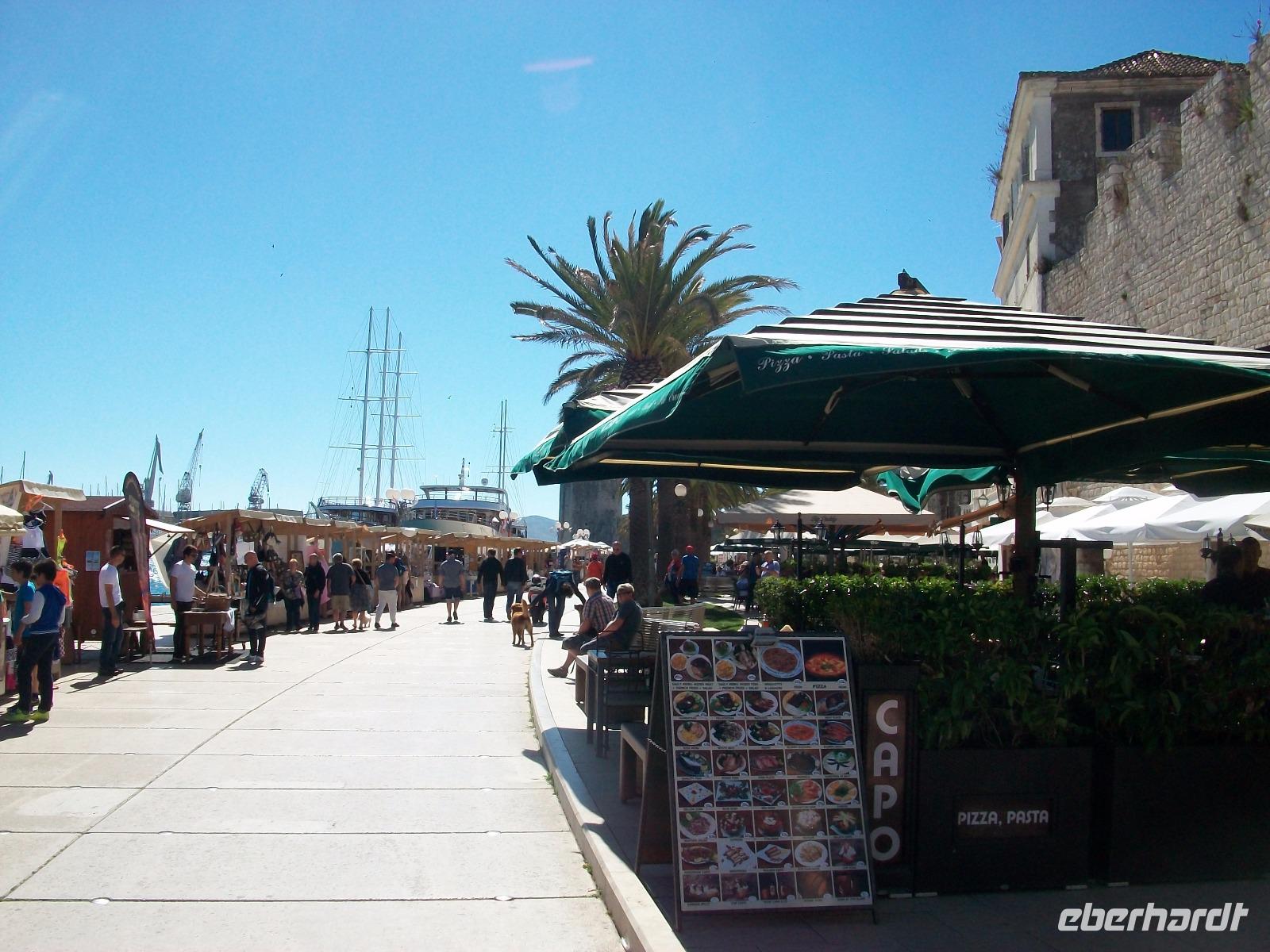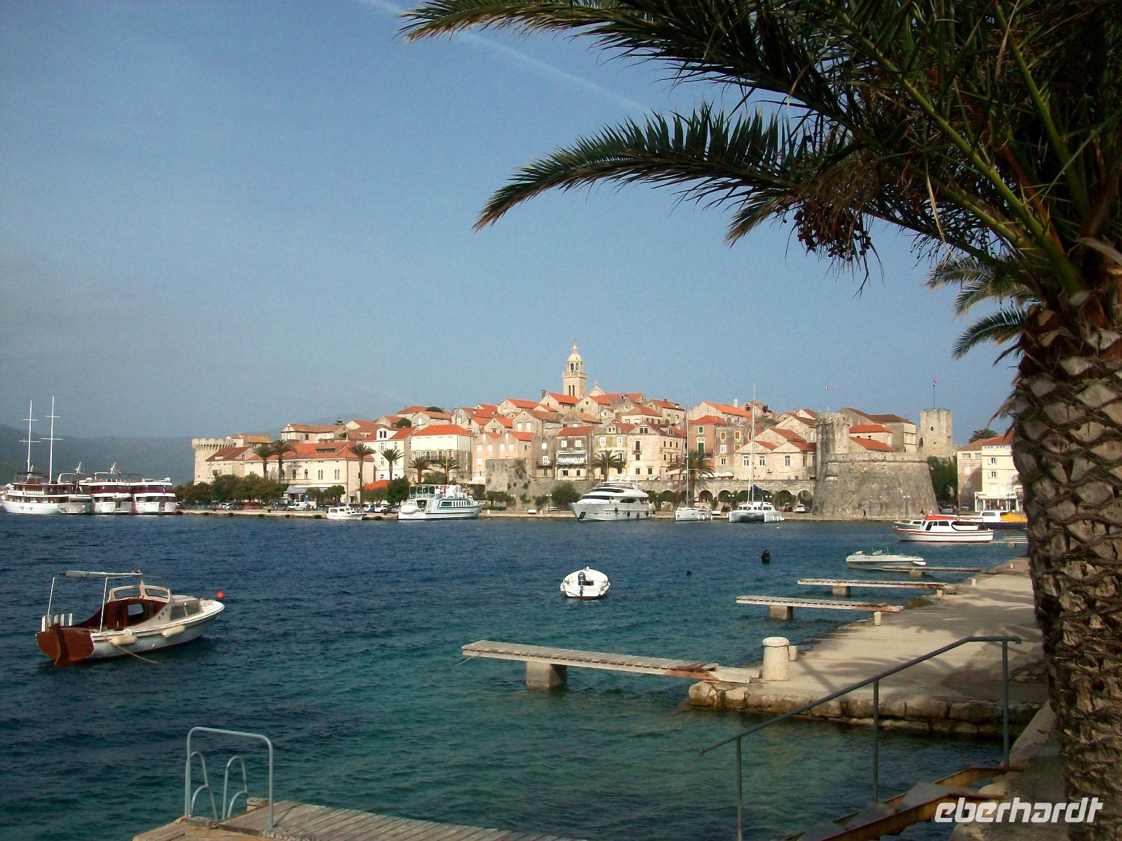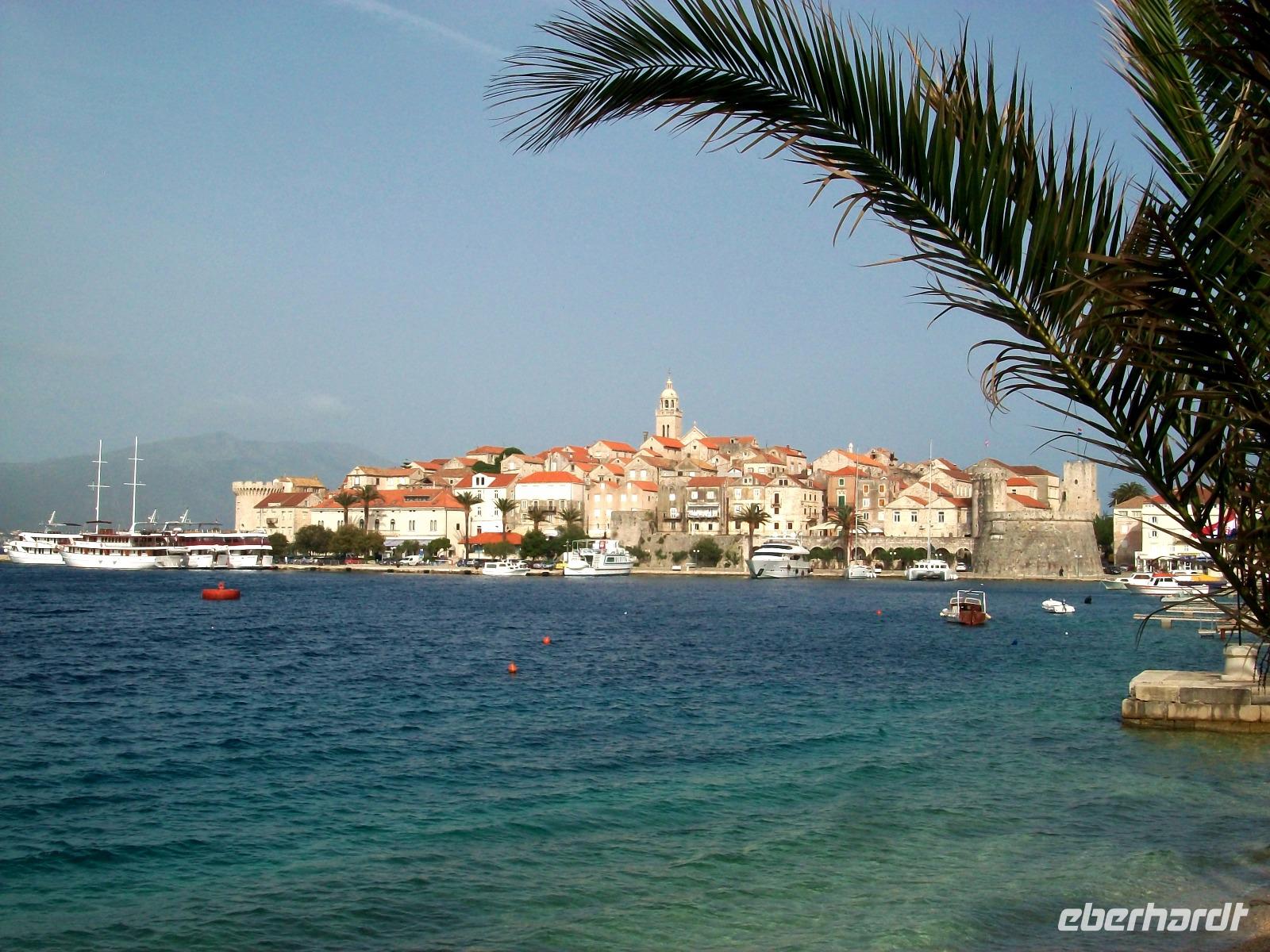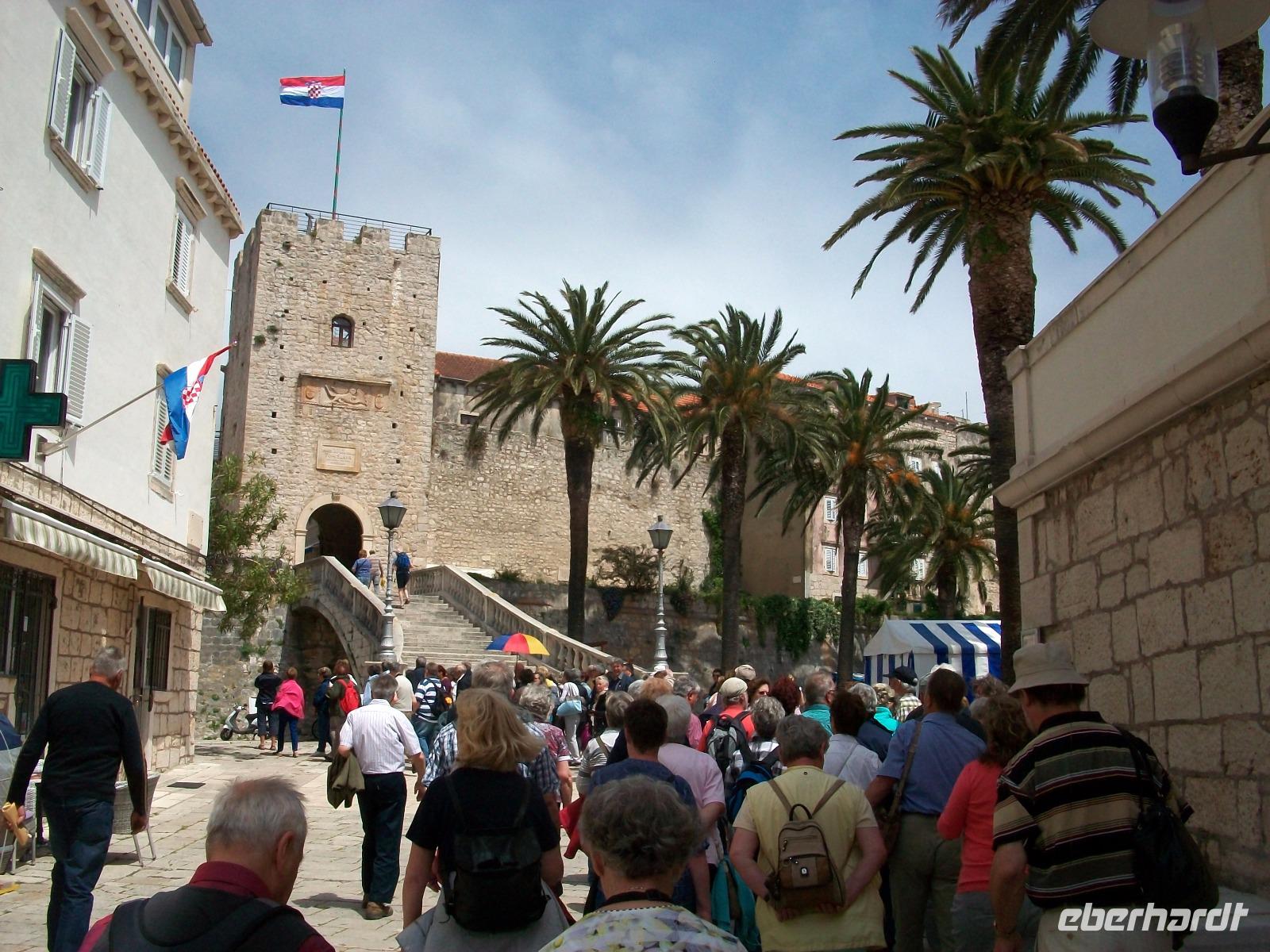 Wir werfen einen letzten Blick von der modernen Brücke auf Teile von Dubrovnik und nehmen nun Kurs auf den Ort Ston. Hier förderten die Ragusaner einst Salz und dieses Weiße Gold brachte der Republik gute Einnahmen. Wir genehmigen uns einen Stopp um bei den Salinen vorbeizuschauen und von hier unten die mächtigen Schutzmauern zu bestaunen. Dann geht die Fahrt weiter auf der Halbinsel Pelješac; entlang der Weingärten und einer üppig grünenden Natur, gelangen wir in den bekannten Urlaubsort Orebic. Bald sehen wir die Autofähre kommen und mit ihr schippern wir ganz gemütlich unserem heutigen Ziel, der Insel Korcula entgegen. Die Überfahrt ist kurz, die alten Mauern kommen uns näher und hier erwartet uns Neda, sie wird uns in der nächsten guten Stunde diesen schönen Ort zeigen.