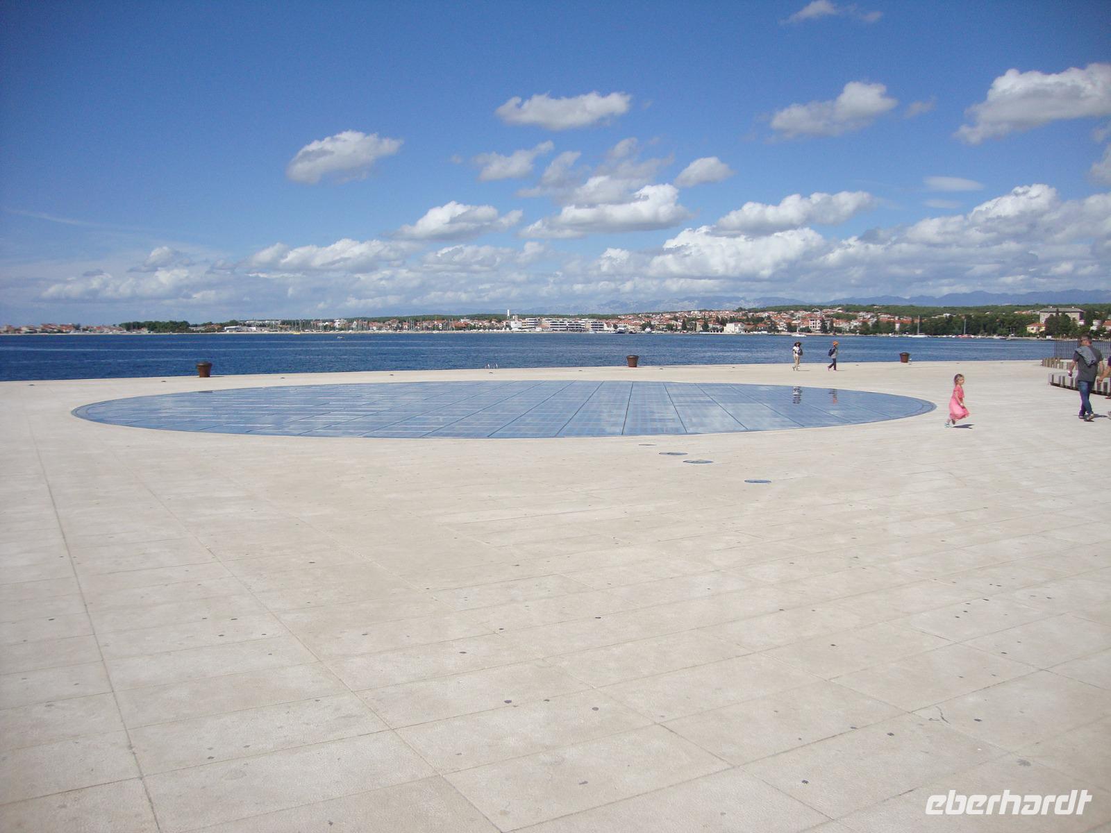 Nach dem erstklassigen Frühstück im Hotel "Ivan" begrüßen wir unsere Gästeführerin Marina, welche uns heute den ganzen Tag begleitet und Sie macht das wirklich ganz toll. In Lozovac befindet sich der Eingang zum Krka-Nationalpark, er beherbergt über 100 km² seine wilde Schönheit. Zuerst zwängt sich der Fluß durch enge Schluchten mit bis zu 200 m hohen Felswänden und Stromschnellen. Dann aber lässt sie ihre schäumenden Wassermassen über unzählige Kaskaden niederdonnern und überwindet den beträchtlichen Höhenunterschied von 300 m bis zu ihrer Mündung mit sieben Wasserfällen. Bei einem Rundgang mit Marina, die alles sehr gut erklärt, erleben wir das grandiose Naturschauspiel. Wir machen Rast am größten Wasserfall, hier stürzt das Wasser über 17 Travertinterassen 46 m in die Tiefe und bildet ein weites Bassin, in dem es sich herrlich baden lässt. Hier hat auch Winnetou seinen berühmten Kopfsprung gemacht. Marina fährt mit uns bis Zadar und an den mauern der Altstadt beginnt unser Rundgang. Zadar war schon über Jahrtausende ein begehrter Siedlungsplatz für Liburner und Römer, für Byzanz und Venedig. Wir erfahren viel zur Geschichte der Stadt, die früher Hauptstadt Dalmatiens war und heute die zweitgrößte mit 75000 Einwohnern ist. Das antike Zentrum bildet das römische Forum mit dem vorromanischen Rundbau Sveti Donat (heiliger Donatus) aus dem 9.Jh. Die Kathedrale der hl. Anastasia ist zwar baulich mit der Kirche Sveti Donat verbunden, der Eingang aber liegt um zwei Ecken. Der im 12./13.Jh. entstandene Bau beeindruckt durch seine Hauptfassade mit zwei übereinanderliegenden Rosetten und den Glockenturm. Ein Erlebnis für alle Sinne bieten zwei Installationen von Nikola Basic an der Uferpromenade. Die "Meeresorgel" verleiht mittels eines Rohrsystems, das in die Steinstufen eingelassen wurde, Wellen und Wind eine Stimme, lauter oder leiser je nach Strömung und Wellengang. Nahe daran fängt der "Gruß der Sonne" mit 300 mehrschichtigen, in einem Kreis mit 22 m Durchmesser angeordneten Glasplatten tagsüber das Licht der Sonne auf und gibt es abends mit besonderen Lichteffekten wieder ab. Ein wunderbares Schauspiel, wer so etwas erleben darf.