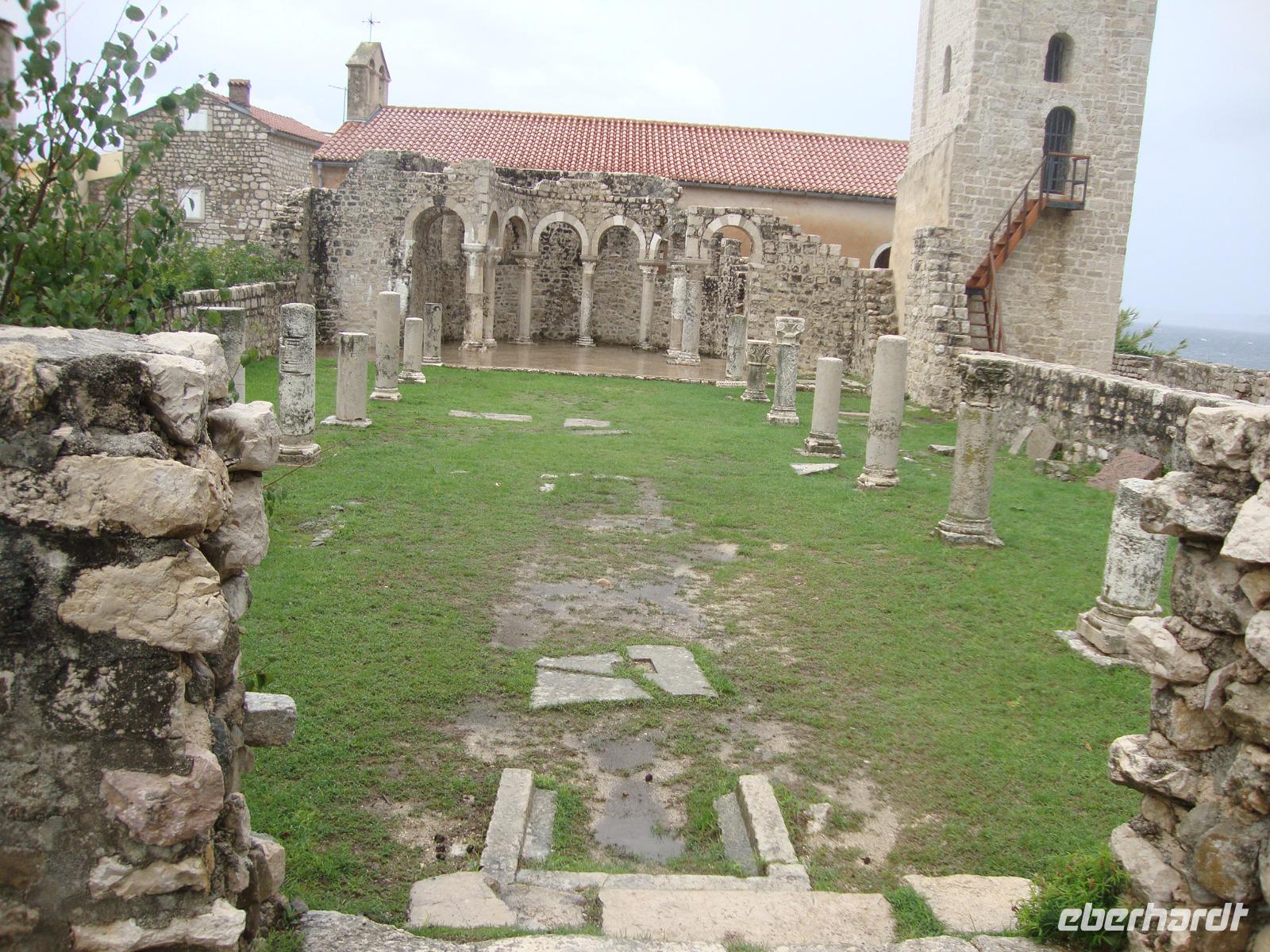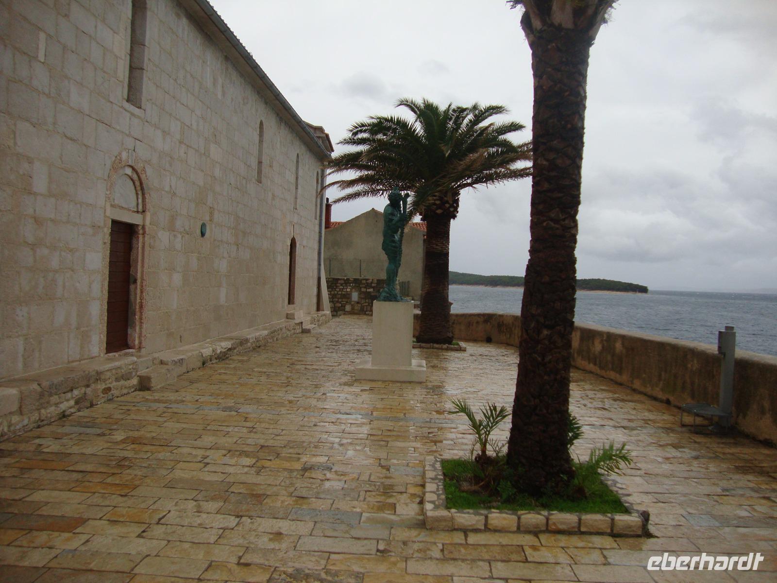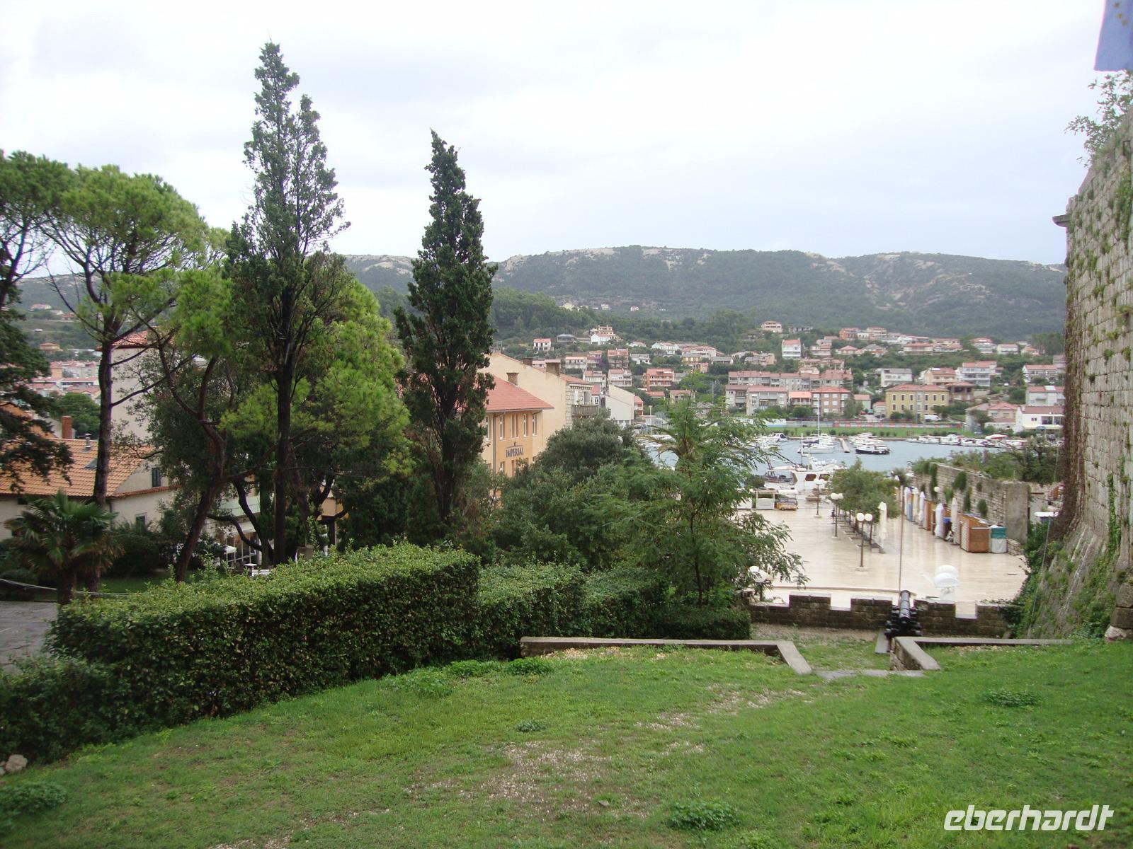 Nach dem Frühstück begleitet uns Bobana, unsere Gästeführerin auf Rab, zu einem Spaziergang durch die Gassen der Stadt. Für viele Besucher ist Rab die Perle der Kvarner. Fruchtbares Ackerland, Eichen -und Pinienwälder machen Rab zu einer der grünsten Inseln der Adria und zu einer der beliebtesten. Die über 2000 Jahre alte Hauptstadt reckt ihren Besuchern gleich vier imposante Kirchtürme entgegen. Wir mußten immer wieder einen trockenen Stand finden, da uns der heftige Regen begleitete. Aber Bobana machte das ganz geduldig und berichtete uns Interessantes zu Rab. Von der Insel stammt der Gründer der ältesten Republik der Welt, der Bischof und Pilger St. Marin. Anschließend unternahmen wir eine Inselrundfahrt bis nach Lopar. Die Meeresbucht San Marino ist so flach, das man lange braucht um bis zur Hüfte im Wasser zu stehen. Aber leider regnete es und niemand wollte aussteigen. So entschlossen wir uns, zu einem guten Mittagessen zu "Dionis" zu fahren. Es gab frischen Fisch und Fleisch und vorher natürlich den obligatorischen Begrüßungsschnaps. Diese Einkehr hat allen sehr gut gefallen, jeder hatte nur lobende Worte. Am Nachmittag konnten alle Gäste ihre Freizeit individuell gestalten, zum Einkaufen für zu Hause den guten "Paski Sir" oder einen guten Tropfen von der Insel Rab. Am Abend trafen wir uns zum Büffet, welches wieder eine große Auswahl bot.