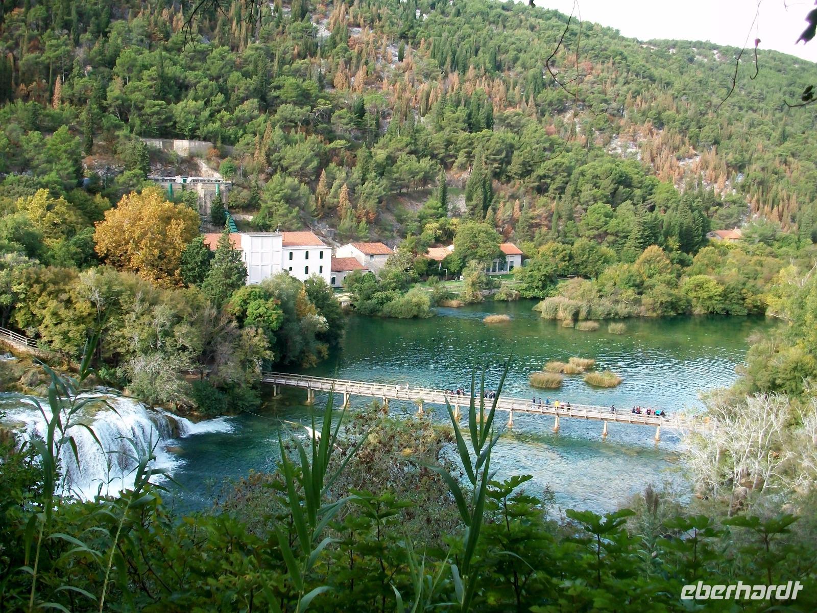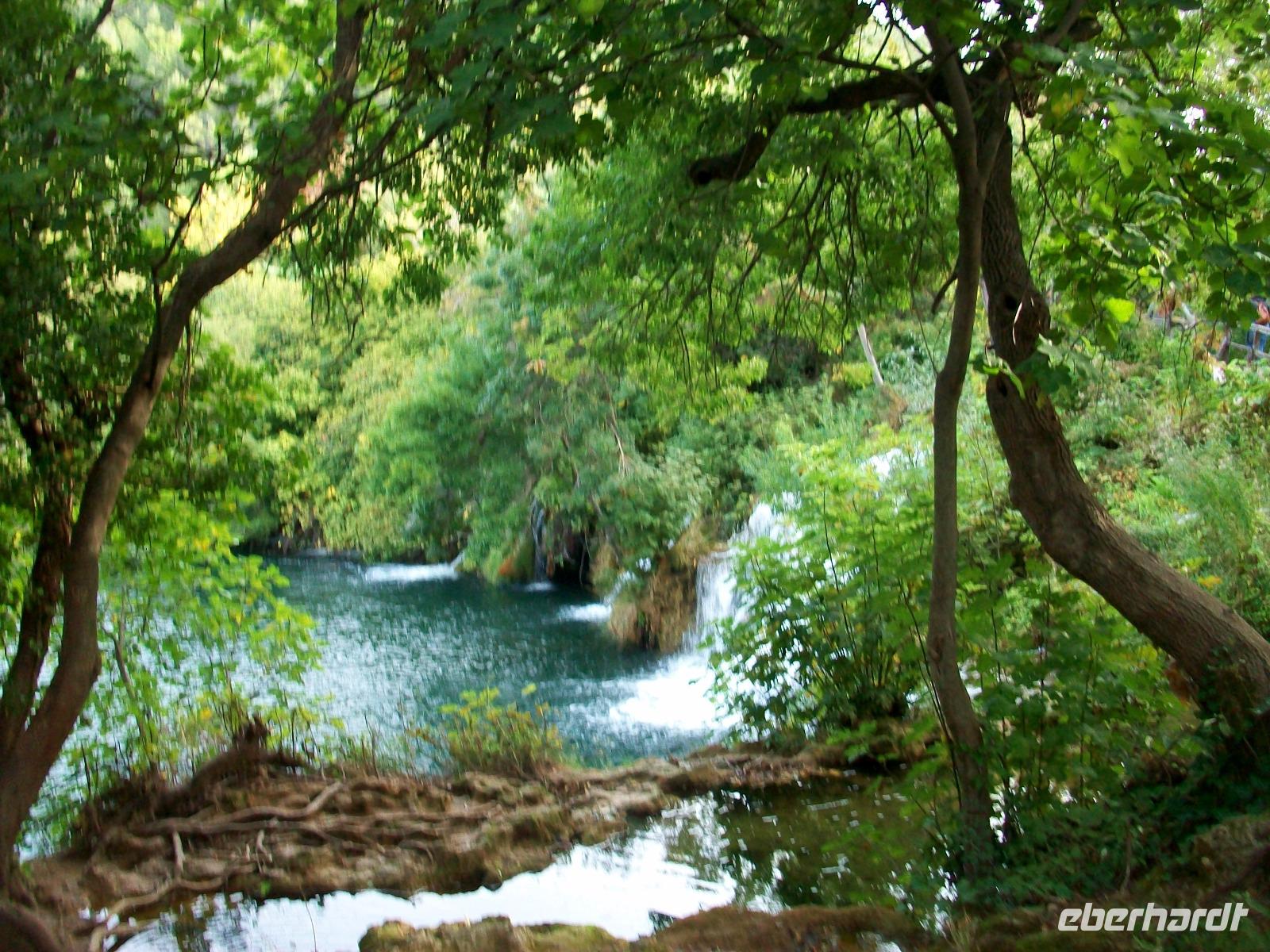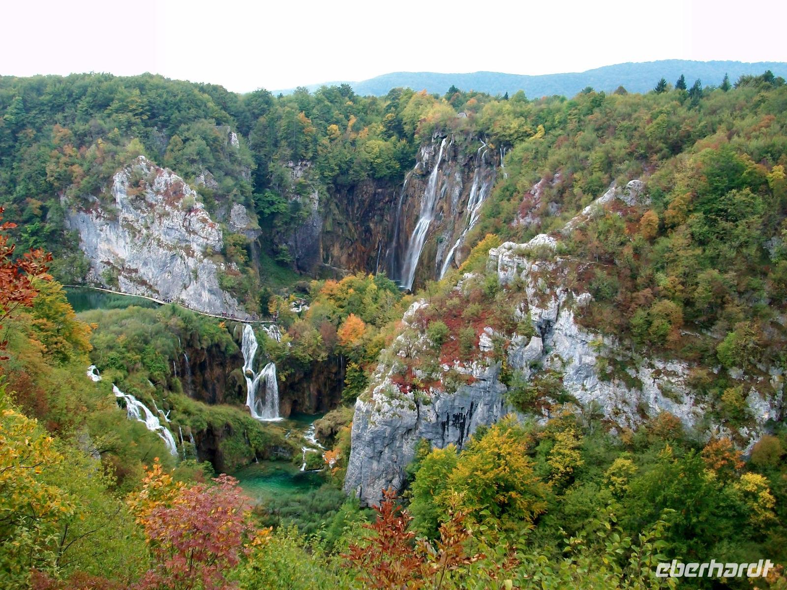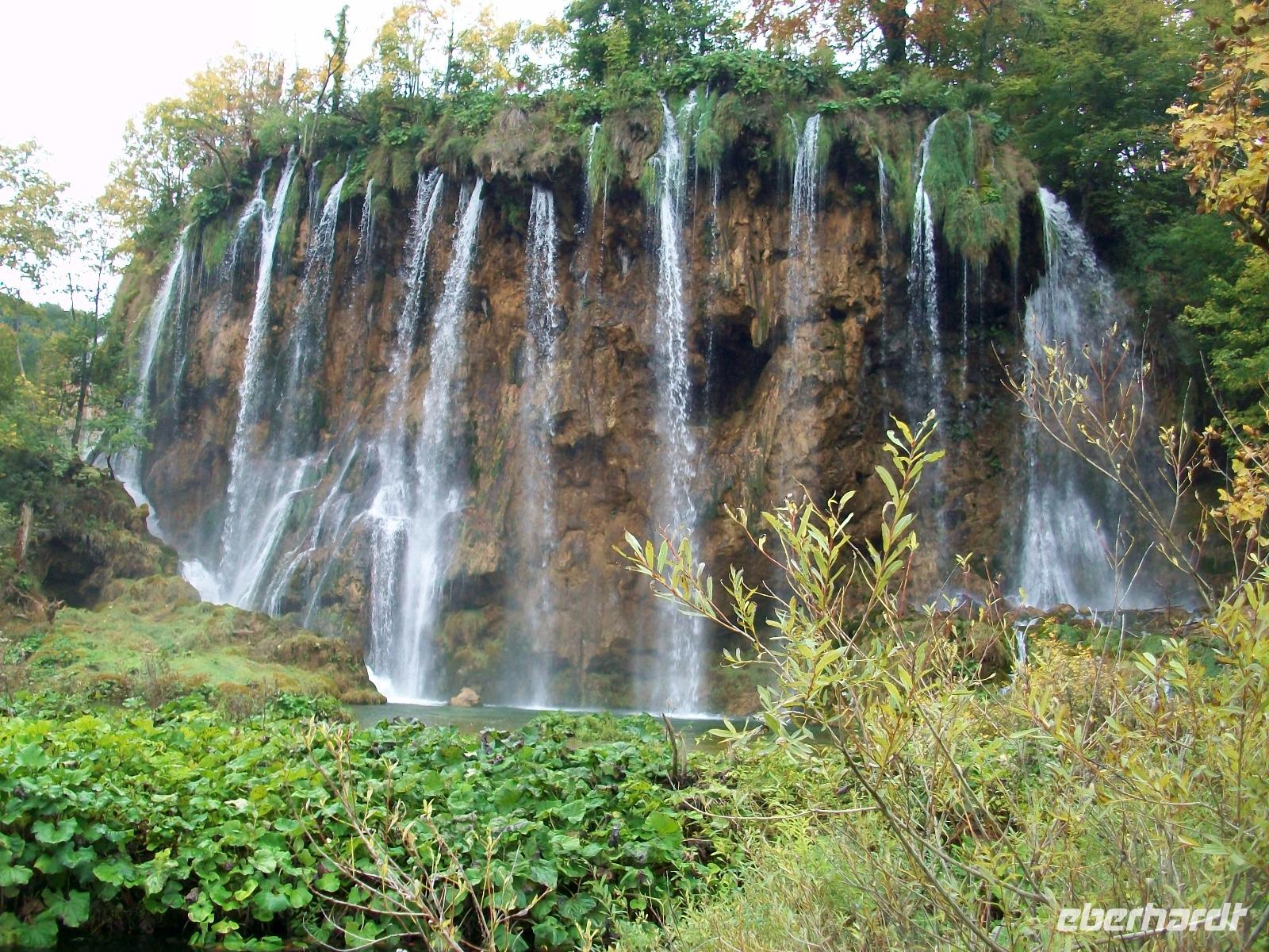 Nach einem kleinen Mittagsimbiss geht es los und mit Nikolina haben wir eine vorzügliche Parkführerin die uns nun durch dieses Karstphänomen begleiten wird. Von hoch oben schauen wir auf den großen Wasserfall dem unser erster Besuch gilt. Unten angelangt staunen wir über seine Wucht, fast 80 Meter sendet er das rauschende Nass zu uns herab.