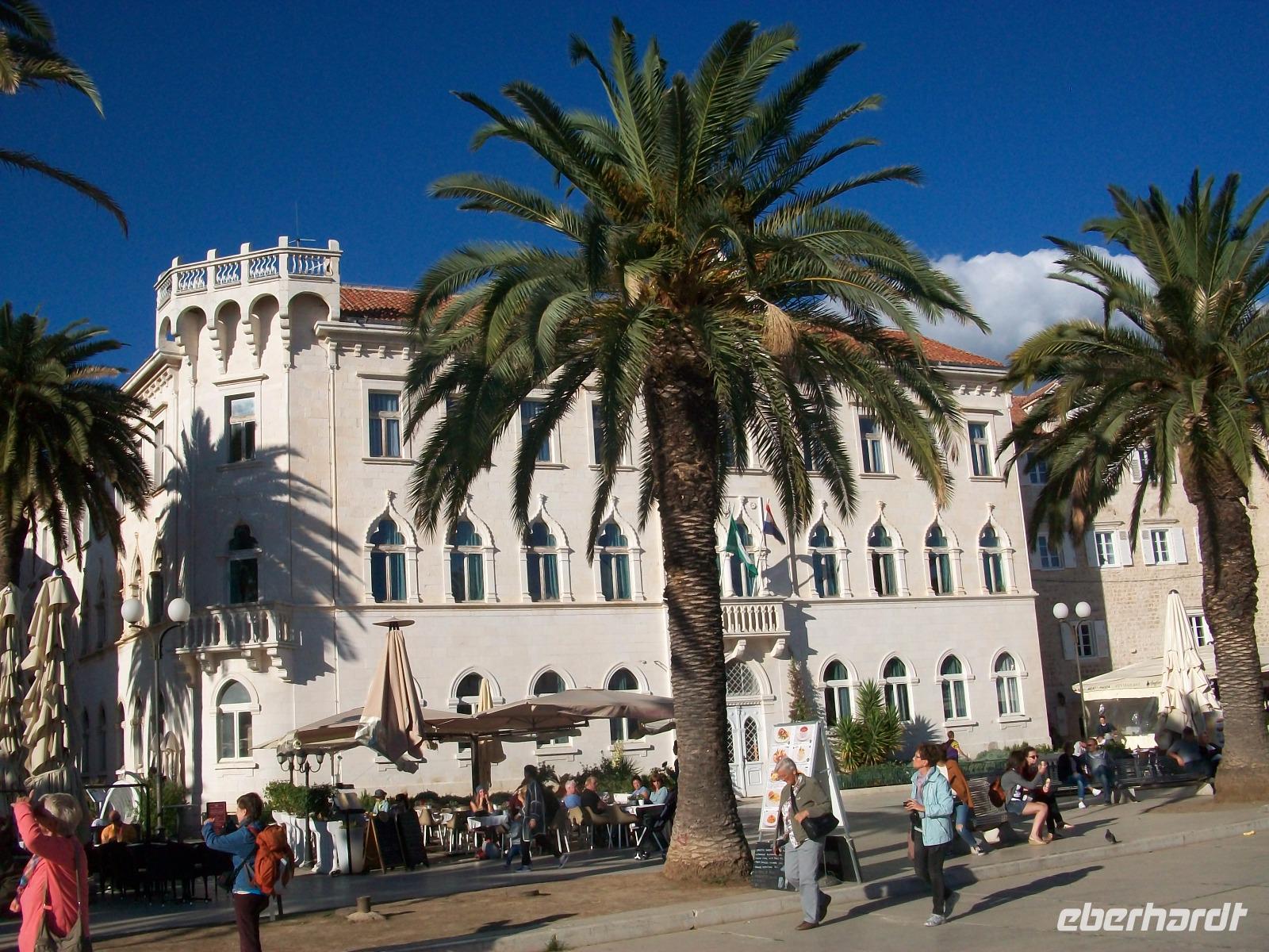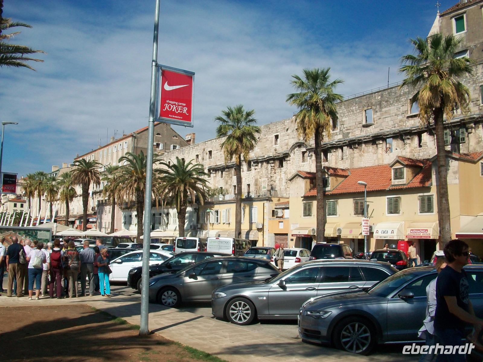 Doch lang ist unser Bleiben hier nicht, bald sind wir unten an der Küste angelangt; die tiefhängenden Wolken sind von der Sonne vertrieben und als wir in Split an der Riva unter Palmen stehen ist der Sommer zurück, kontrastreicher konnte der Tag nicht beginnen.