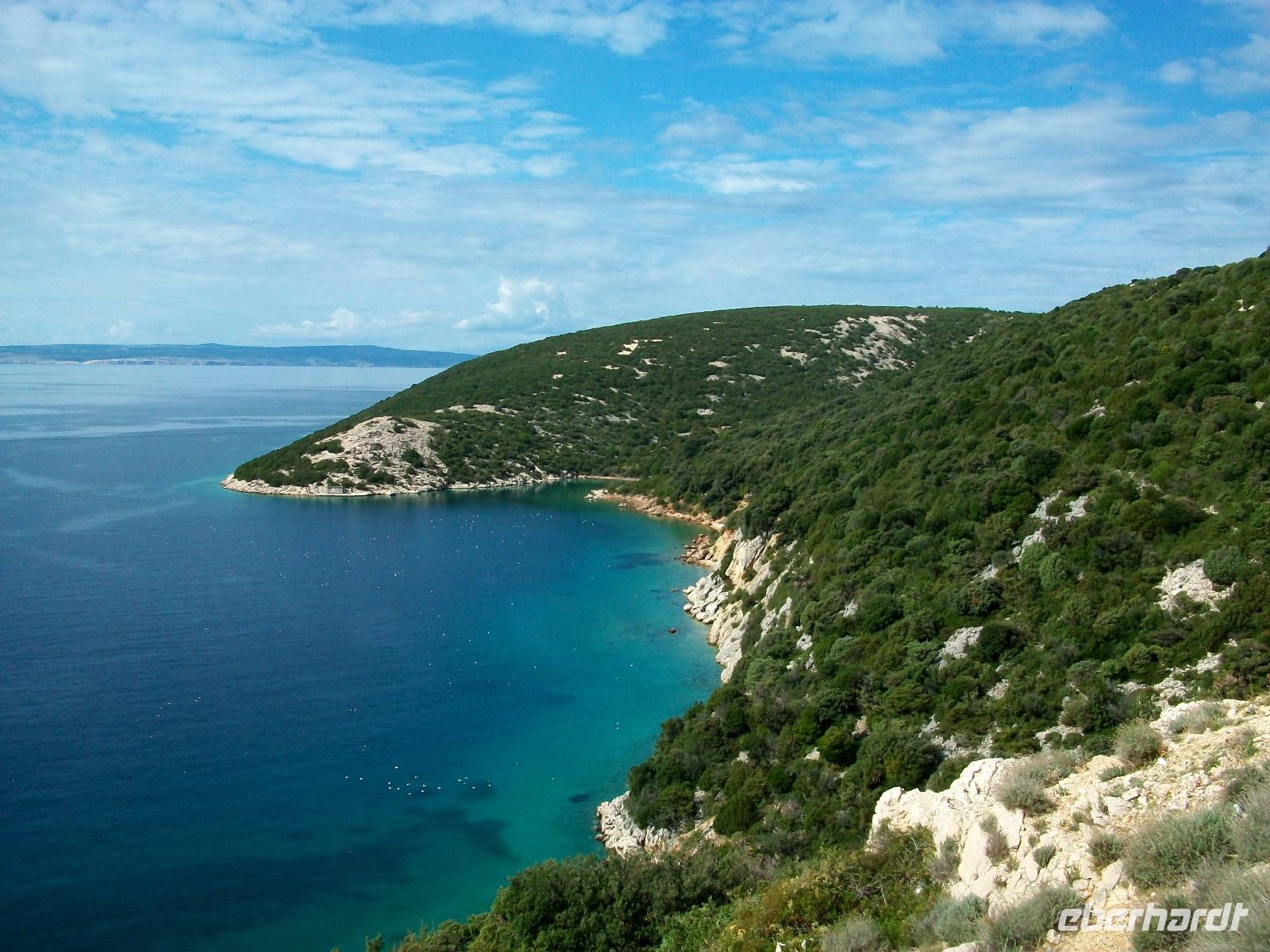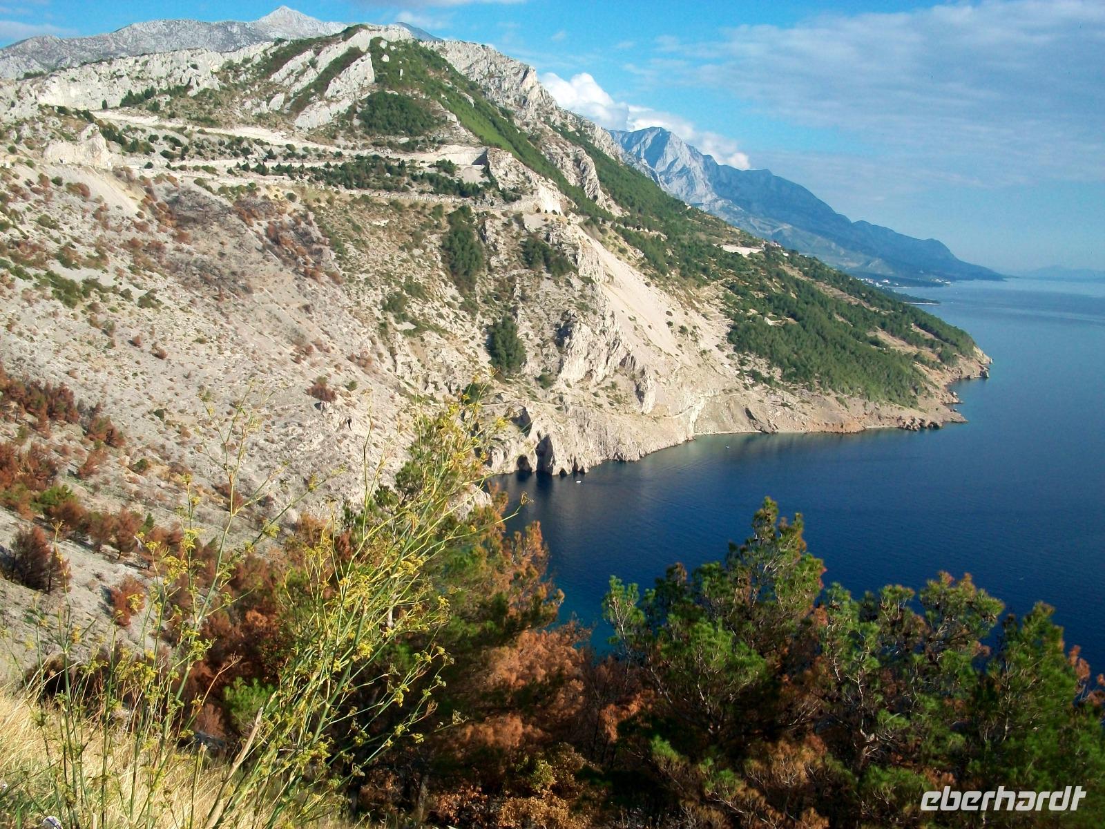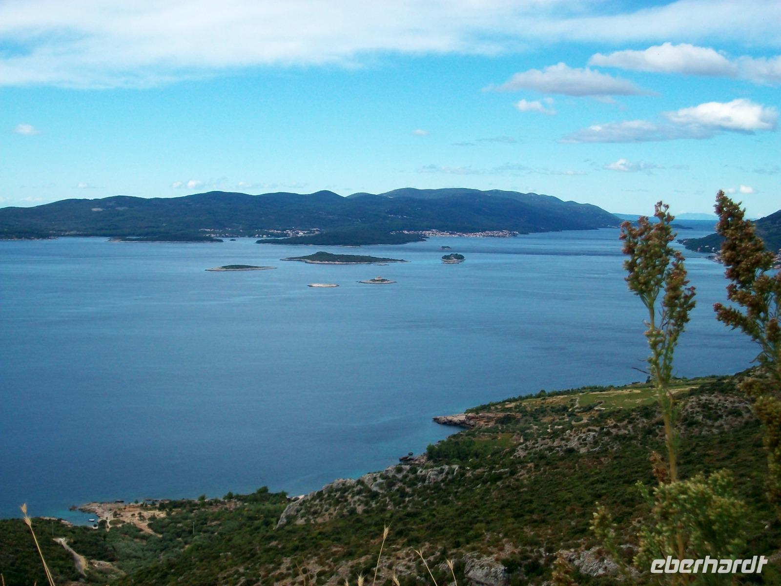 Am Nachmittag jedoch gelangen wir wieder hinunter zur Adria; die Straße führt uns mehrere hundert Meter über die Berge und vor uns hat sich ein wunderbares Panorama ausgebreitet. Das Meer mit den Inseln und die Küste mit den vielen Siedlungen erfreuen unser Auge aus der Vogelperspektive.