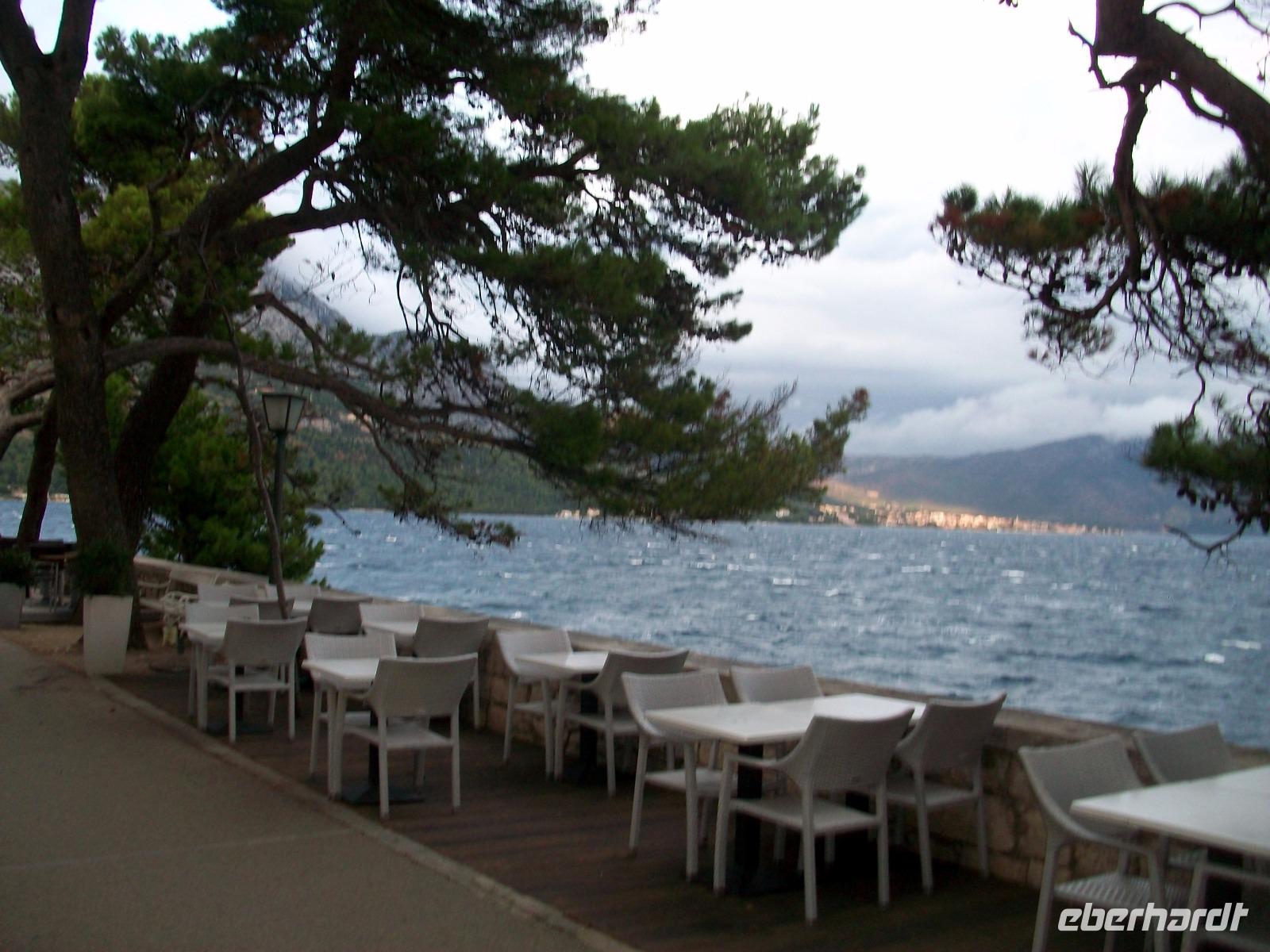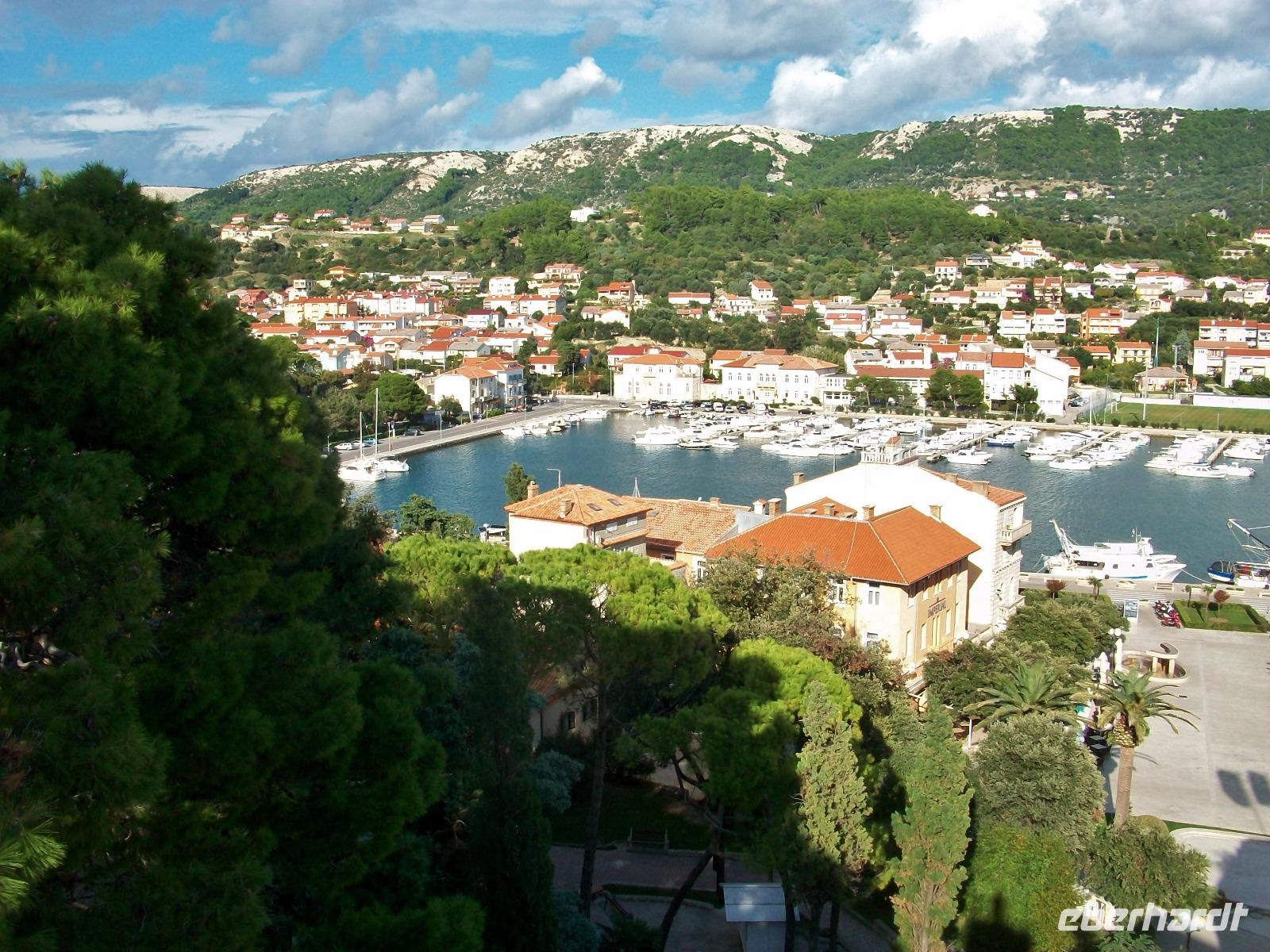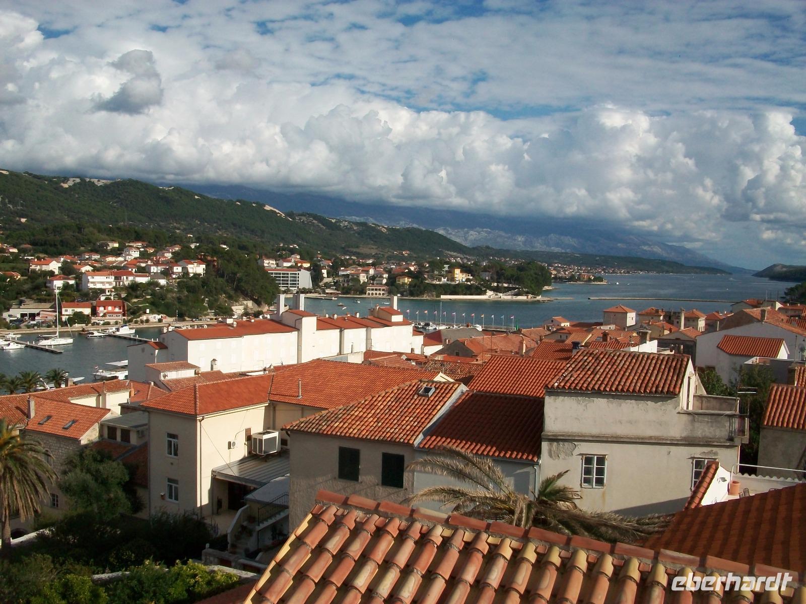 Am Nachmittag jedoch gelangen wir wieder hinunter zur Adria; die Straße führt uns mehrere hundert Meter über die Berge und vor uns hat sich ein wunderbares Panorama ausgebreitet. Das Meer mit den Inseln und die Küste mit den vielen Siedlungen erfreuen unser Auge aus der Vogelperspektive.