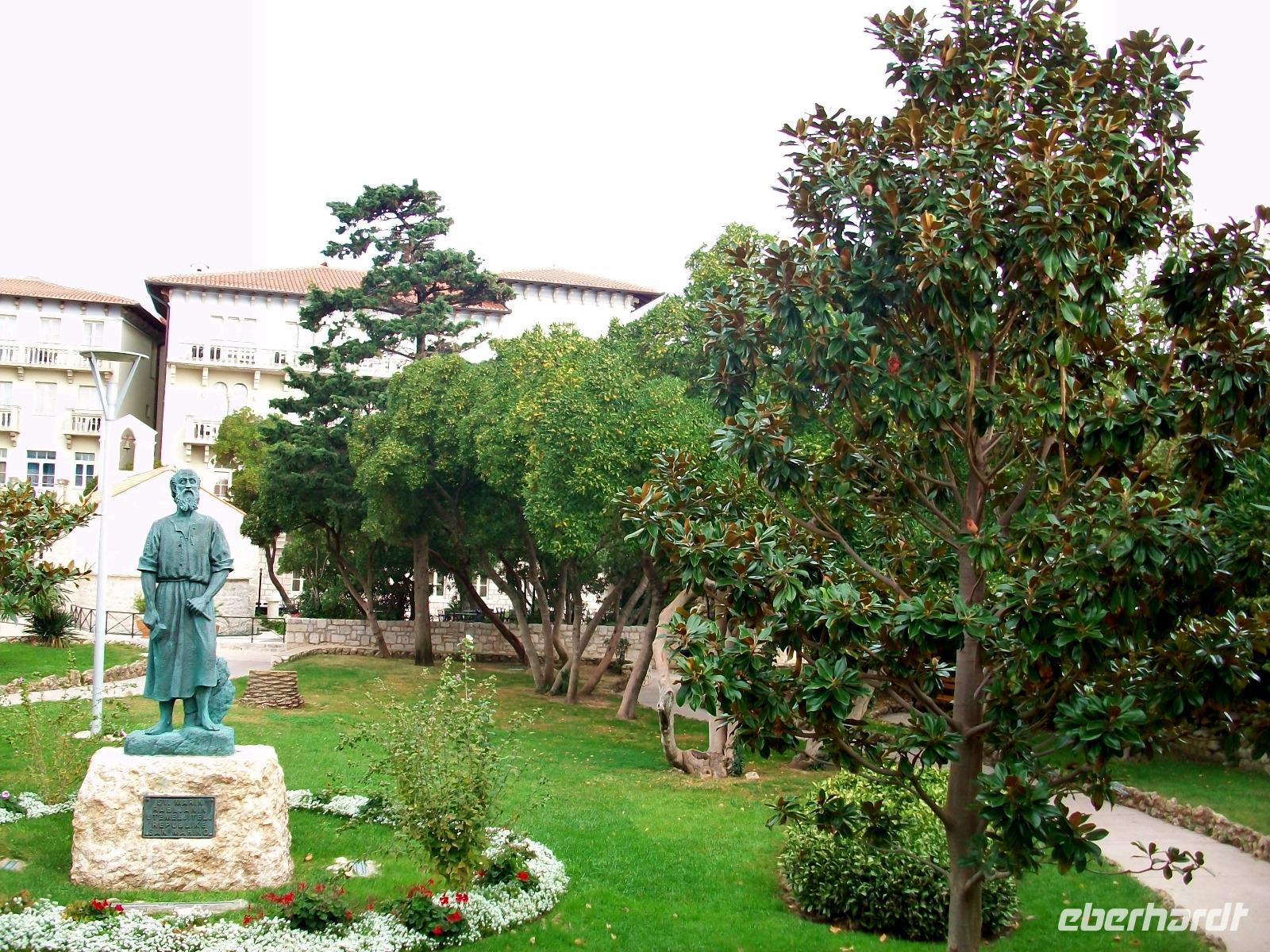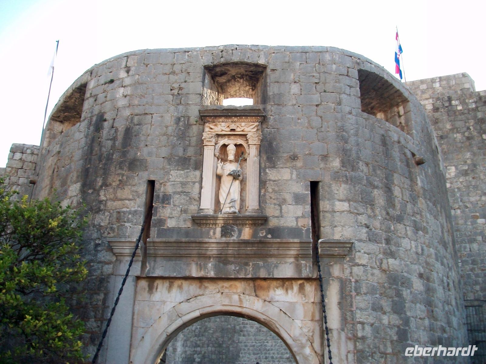 5.10.2017. Durch den schönen Park der unser Hotel auf der Halbinsel Lapad umgibt gelangen wir zum Linienbus. Zunächst sind wir hier noch allein, aber auf dem Weg zur Altstadt füllt sich der Bus bald mit Einheimischen und Touristen. Weit ist der Weg zum Pile nicht und nach einer Viertelstunde Fahrt stehen wir schon vor den mächtigen Mauern von Dubrovnik. Hier werden wir von Ivana freundlich begrüßt, sie wir uns nun auf sympathische Art ihre Stadt zeigen.