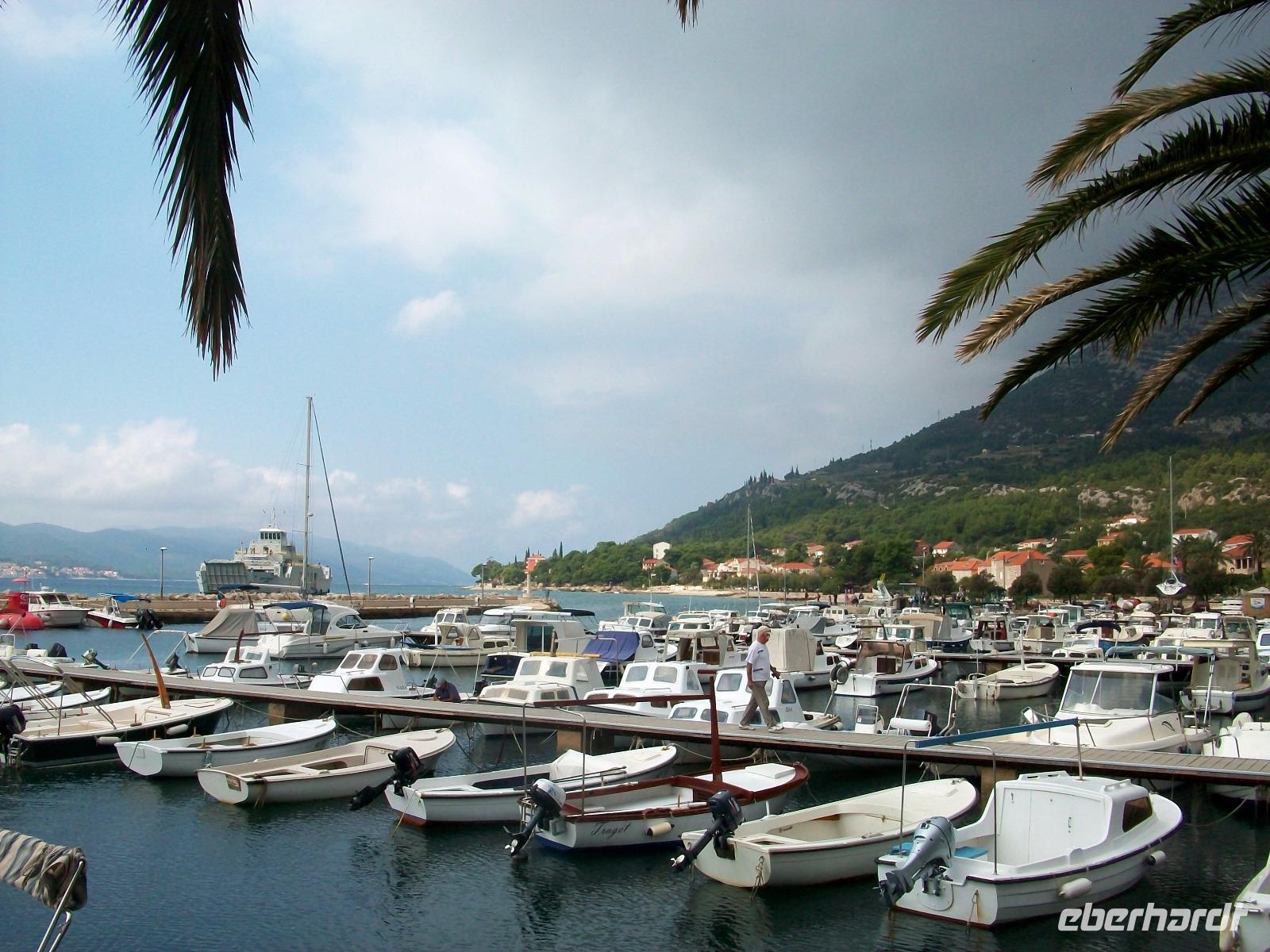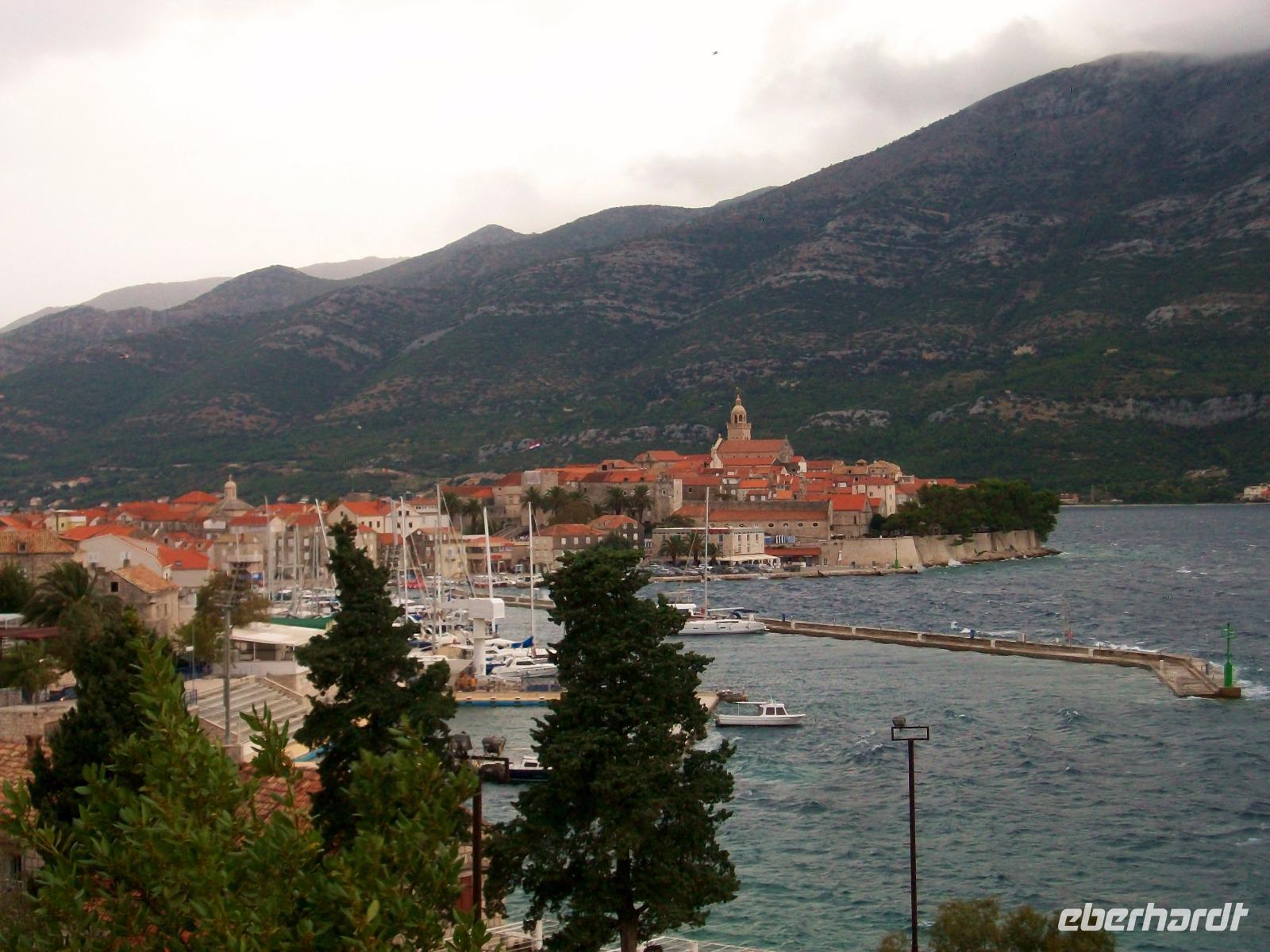 Dann setzen wir die Fahrt fort; entlang der Weingärten, hier reift ein edler Tropfen, geht die Tour weiter auf dieser grünen Halbinsel. Petrus hat nun doch Wolken gesandt und lässt es etwas tröpfeln. Doch das stört uns nicht und als wir in Orebic anlagen, lacht schon wieder Sonne. Nun steht eine kurze Fährüberfahrt an; oben von Deck sehen wir die alten Mauern von Korcula näher kommen, das ist unser heutiges Ziel.