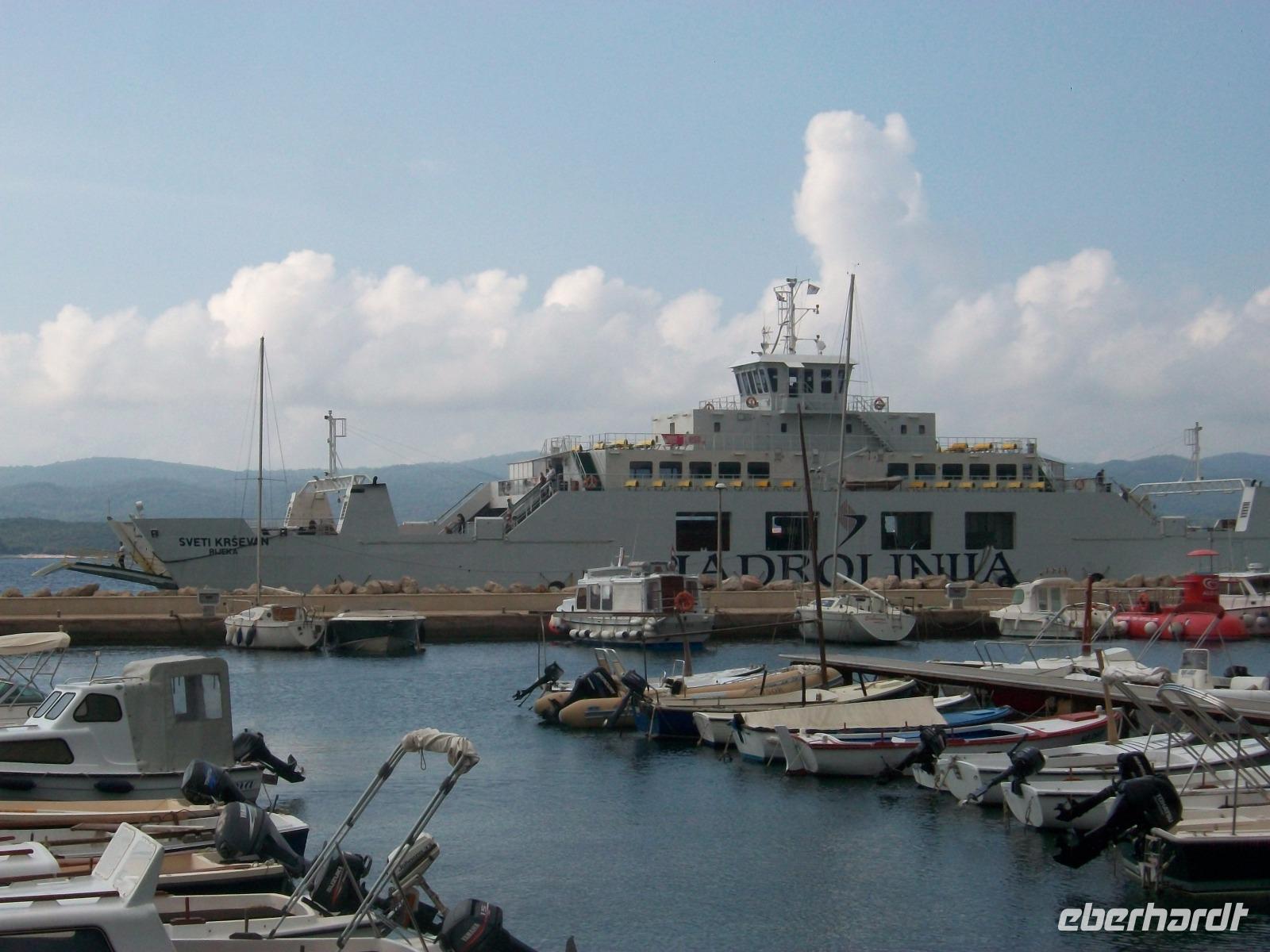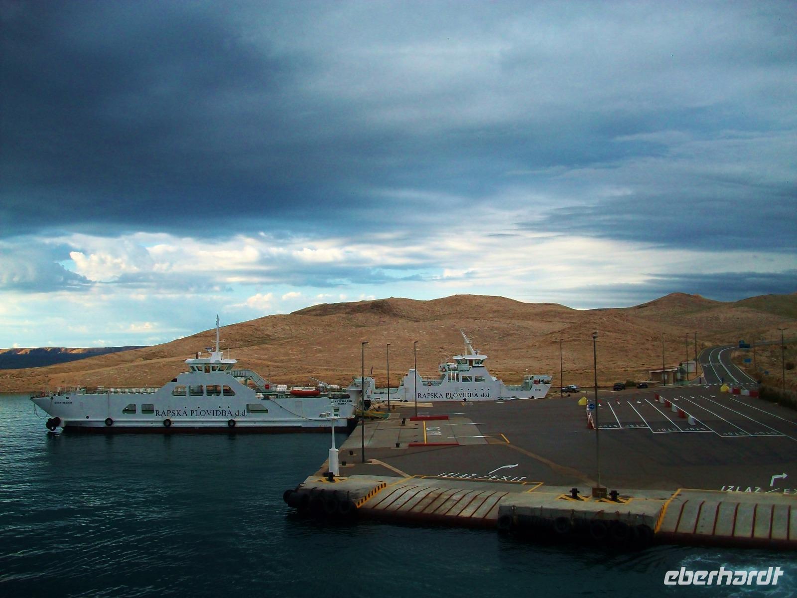10.10.2017. Über die Bergkette des Velebits haben sich Wolken gelegt und als wir dann mit der Fähre auf dem Weg zum Festland sind, hat sich eine drohende, dunkle Wolke über dem Wasser festgehangen aus der grelle Blitz zucken. Das ist aber so weit weg dass es für uns keine Gefahr darstellt, nur auf der Küstenstraße treffen uns einige Tropfen. Bald wagt sich aber die Sonne wieder heraus und bestrahlt die kahlen Inseln so dass sie mit dem tiefblauen Wasser einen eigenartigen Kontrast bilden.