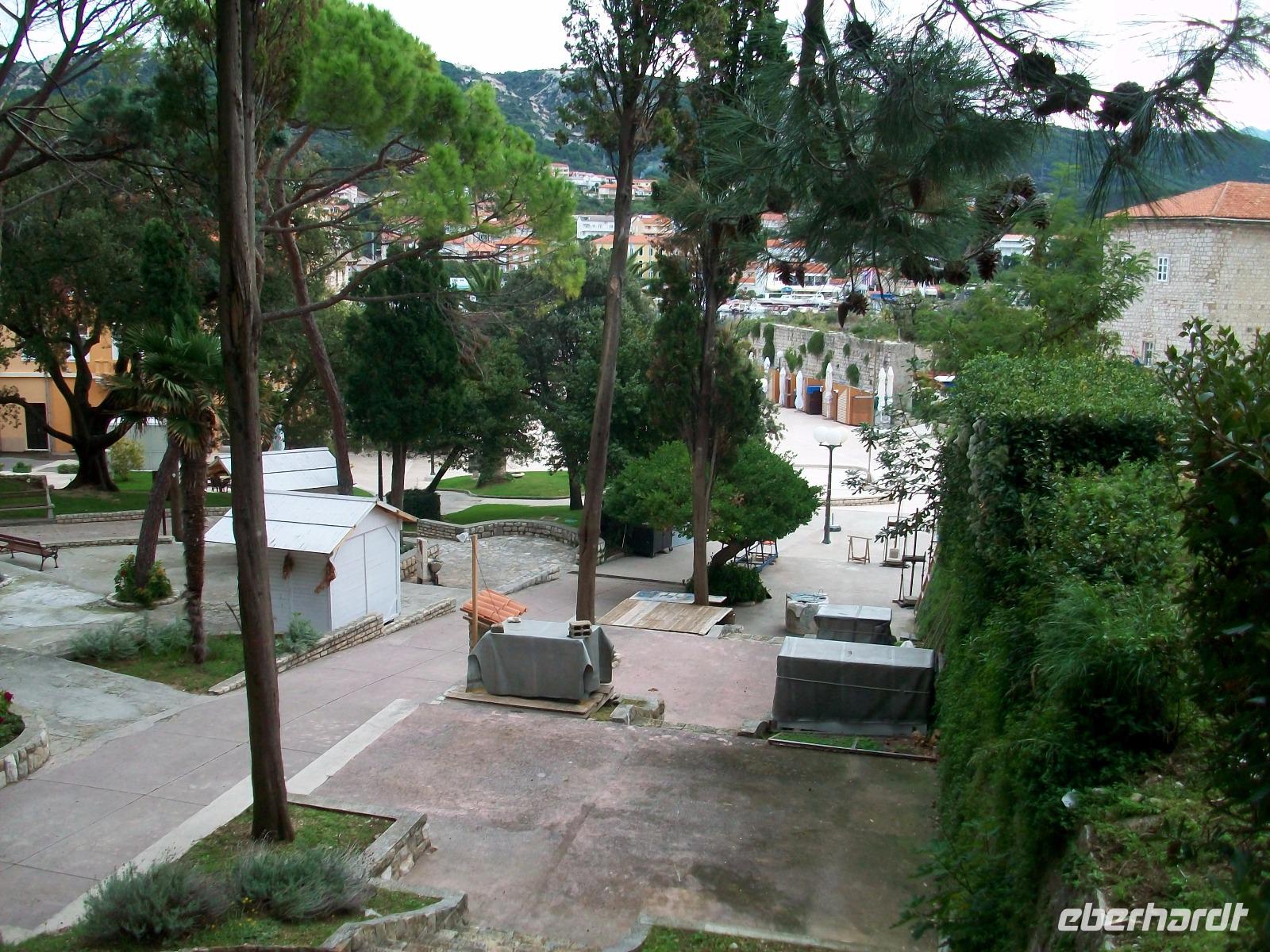 9.10.2017. Ein ruhiger und sonniger Tag liegt vor uns. Nach einem gemütlichen Frühstück im schönen Restaurant unseres Hotels holt uns Bobana ab, sie wird uns an diesem Tag ihre Heimat zeigen. Zunächst geht es zu Fuß durch den Park mit dem üppigen Grün der unser Hotel umgibt und von hier hinunter zum Hafen. Entlang der am Kai festgemachten Ausflugschiffe gelangen wir in die Altstadt. Über die Treppen die uns entlang der Schutzmauer führen geht es hinauf zur oberen Gasse; hier können wir die zahlreichen Wohnhäuser, aber auch die Kirchen und Klöster, in aller Ruhe bei diesem gemütlichen Spaziergang bewundern. An den Lücken wird dann der Blick auf das Meer und die Inseln im Hintergrund frei.