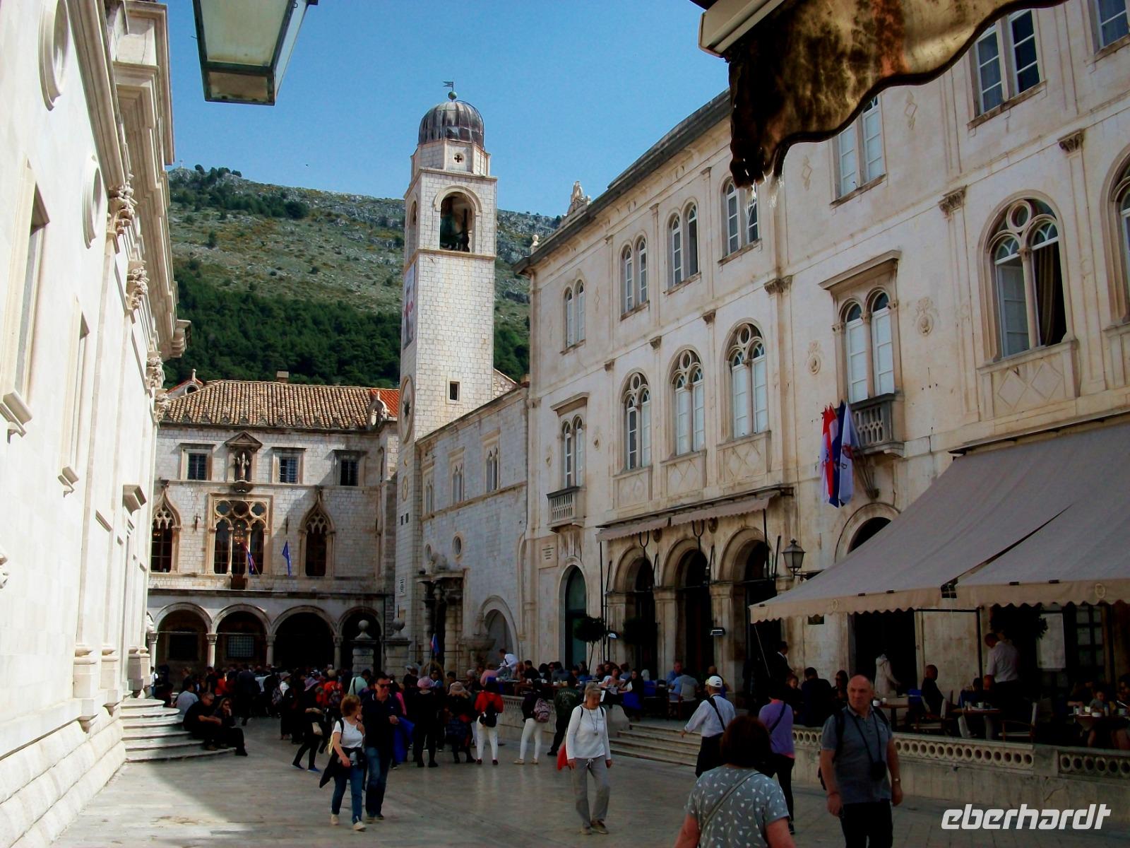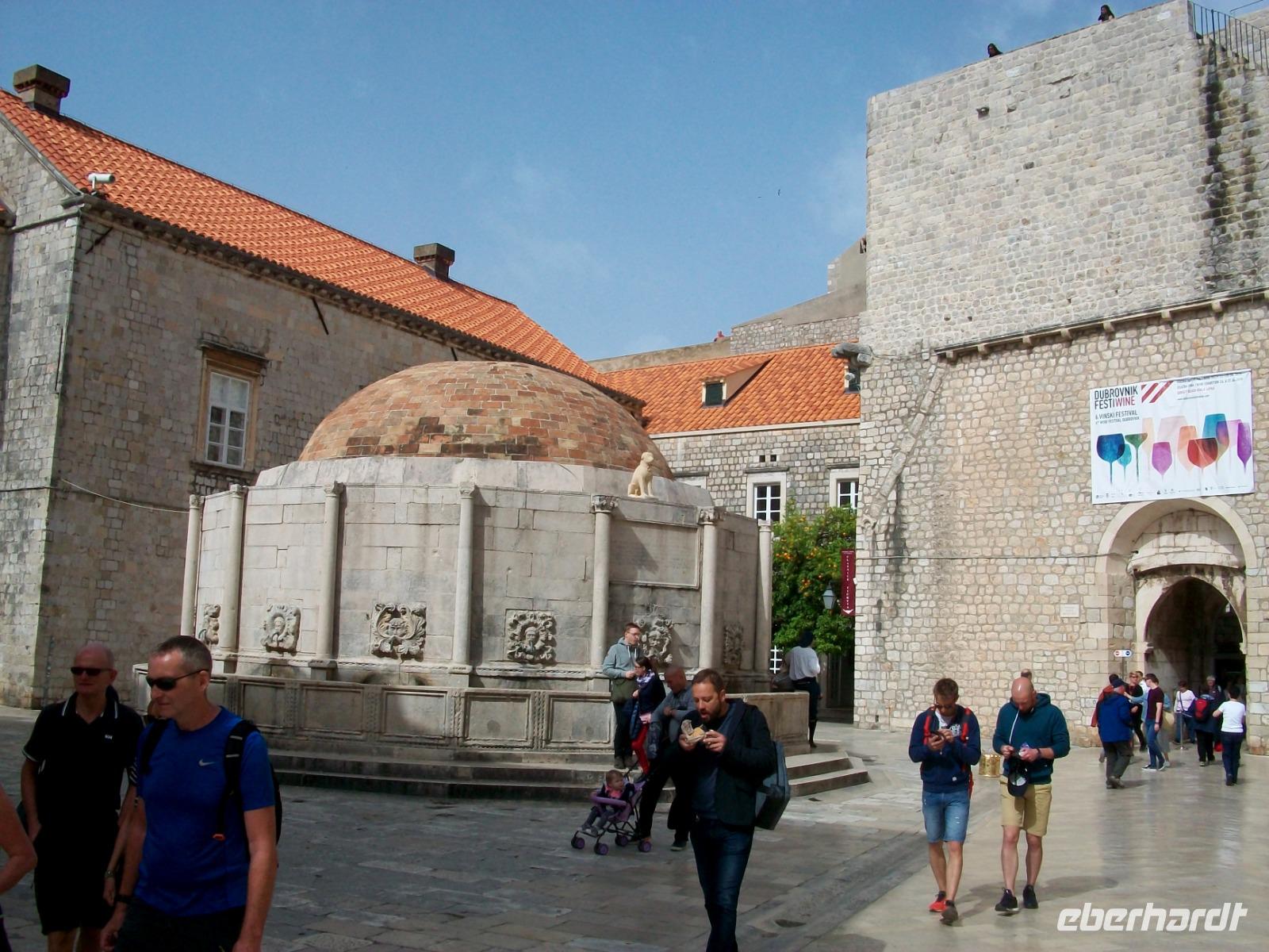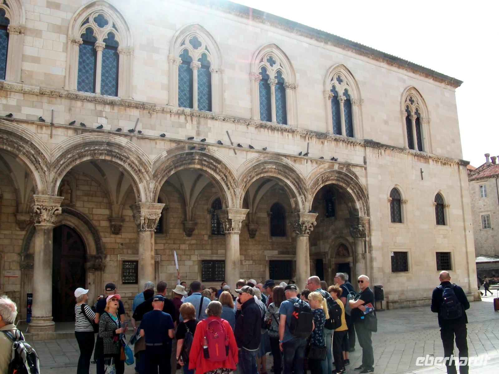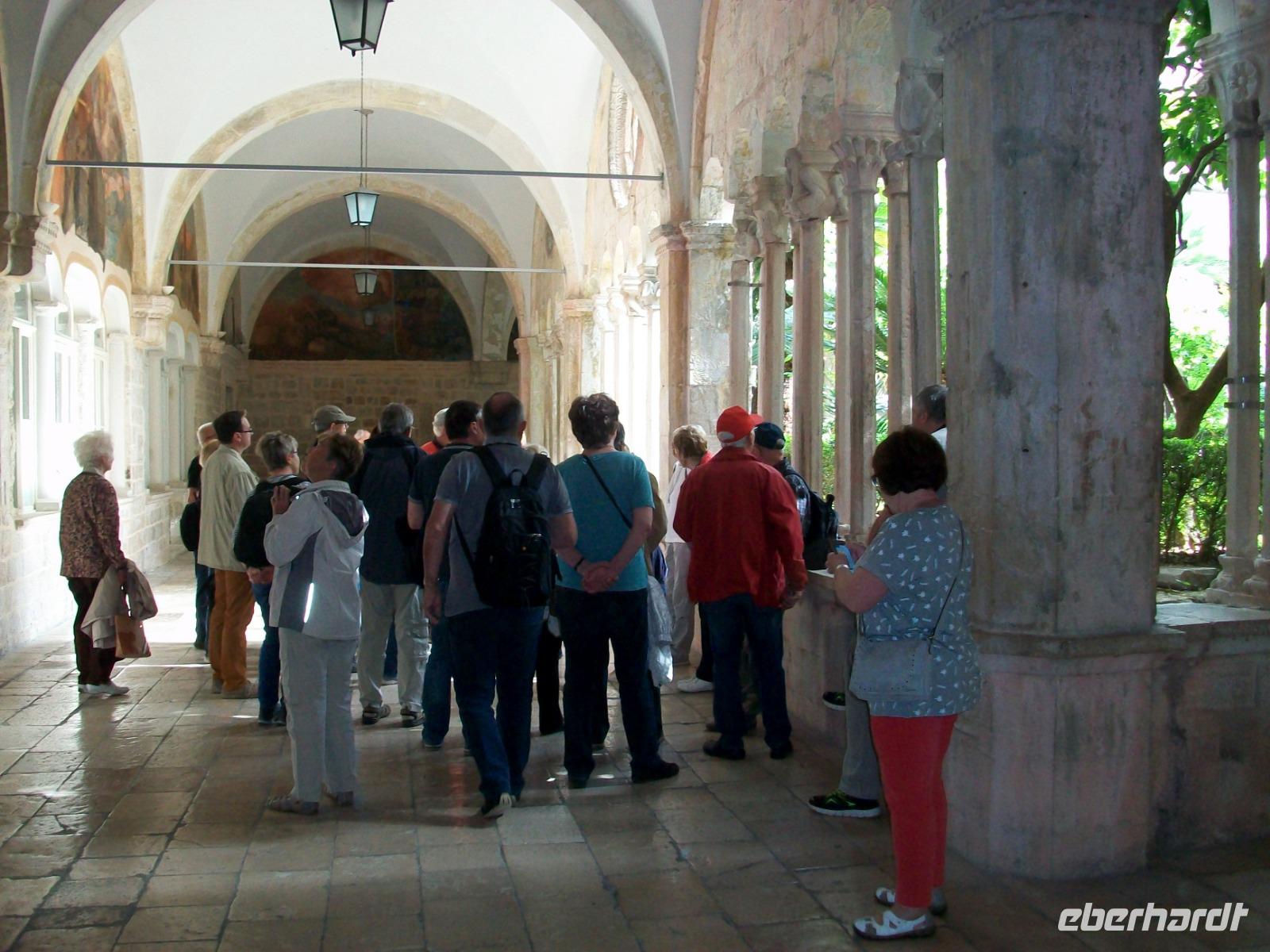 Am Vormittag hat sich Antea am Hotel eingestellt; sie ist unsere bewährte Führerin durch die historischen Mauern der alten Ragusa, so der frühere Name dieser Adriaperle und das schon seit vielen Jahren. Zunächst mischen wir uns aber unter die Einheimischen; mit dem Linienbus geht es in runden zehn Minuten zur Altstadt und fortan zu Fuß. Durch das mächtige Eingangstor gelangen wir bald zur Stradun, es ist die Hauptachse der Stadt. An diesem Vormittag werden wir zunächst noch von der Sonne verwöhnt; wir gönnen uns einen Abstecher in das Franziskanerkloster und bewundern eine der ältesten Apotheken von Europa. Danach geht es durch die schmalen Gassen der Stadt; vor der Blasiuskirche bewundern wir die Bauwerke die dieses Gotteshaus umrahmen und gelangen bald zur Kathedrale und dem Rektorenpalast, es war das einstige Machtzentrum dieser autonomen Republik. Antea entführt uns hier in die uralten Zeiten der Segelschiffe und des Handels, eine Welt die wir aus zahlreichen Filmen kennen, wir müssen nur die Phantasie spielen lassen. Das ist am Alten Hafen den wir am Schluss erkunden auch gar nicht so schwer. Hier verabschiedet sich Antea und allen bleibt nun bis zum Abendessen genügend Freizeit für eine leckeres Mittagessen, den Besuch der Stadtmauer oder anderen der zahlreichen Sehenswürdigkeiten dieser Stadt.
