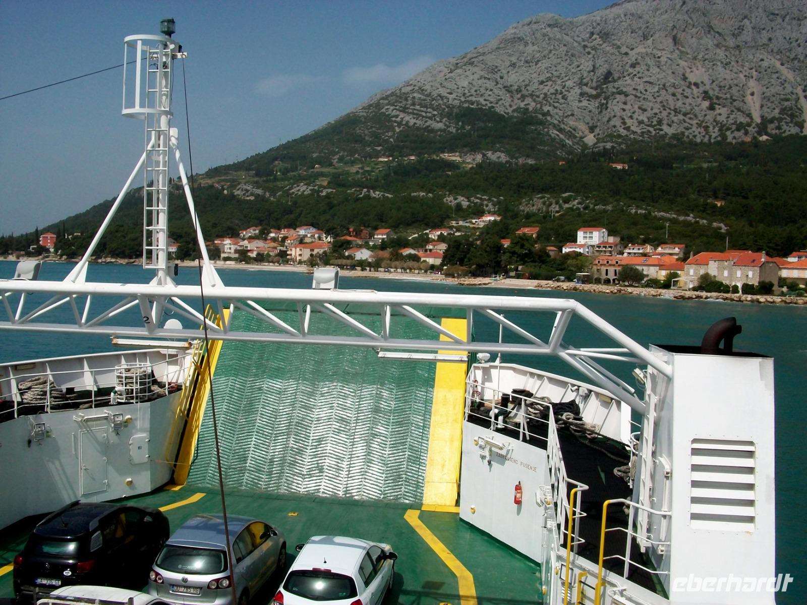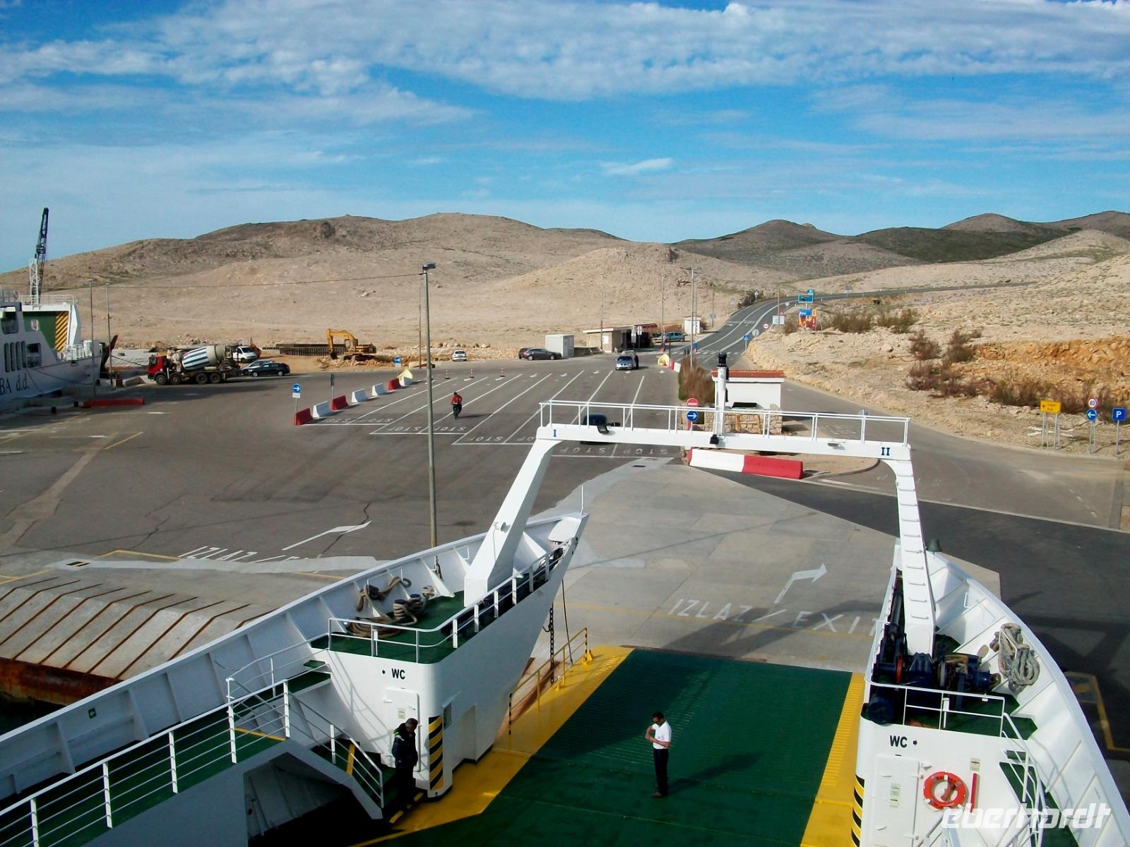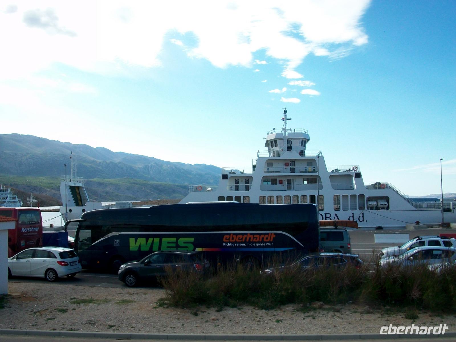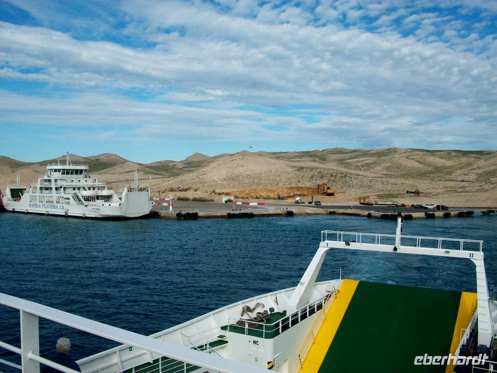 Gegen drei nehmen wir die Fahrt dann wieder auf; auf der Küstenstraße und zu Füßen der mächtigen Erhebungen des Velebitgebirges gelangen wir nach Stinica. Bald sehen wir die Fähre kommen, sie wird uns hinüber zu unserem nächste Ziel bringen, es ist die Insel Rab.