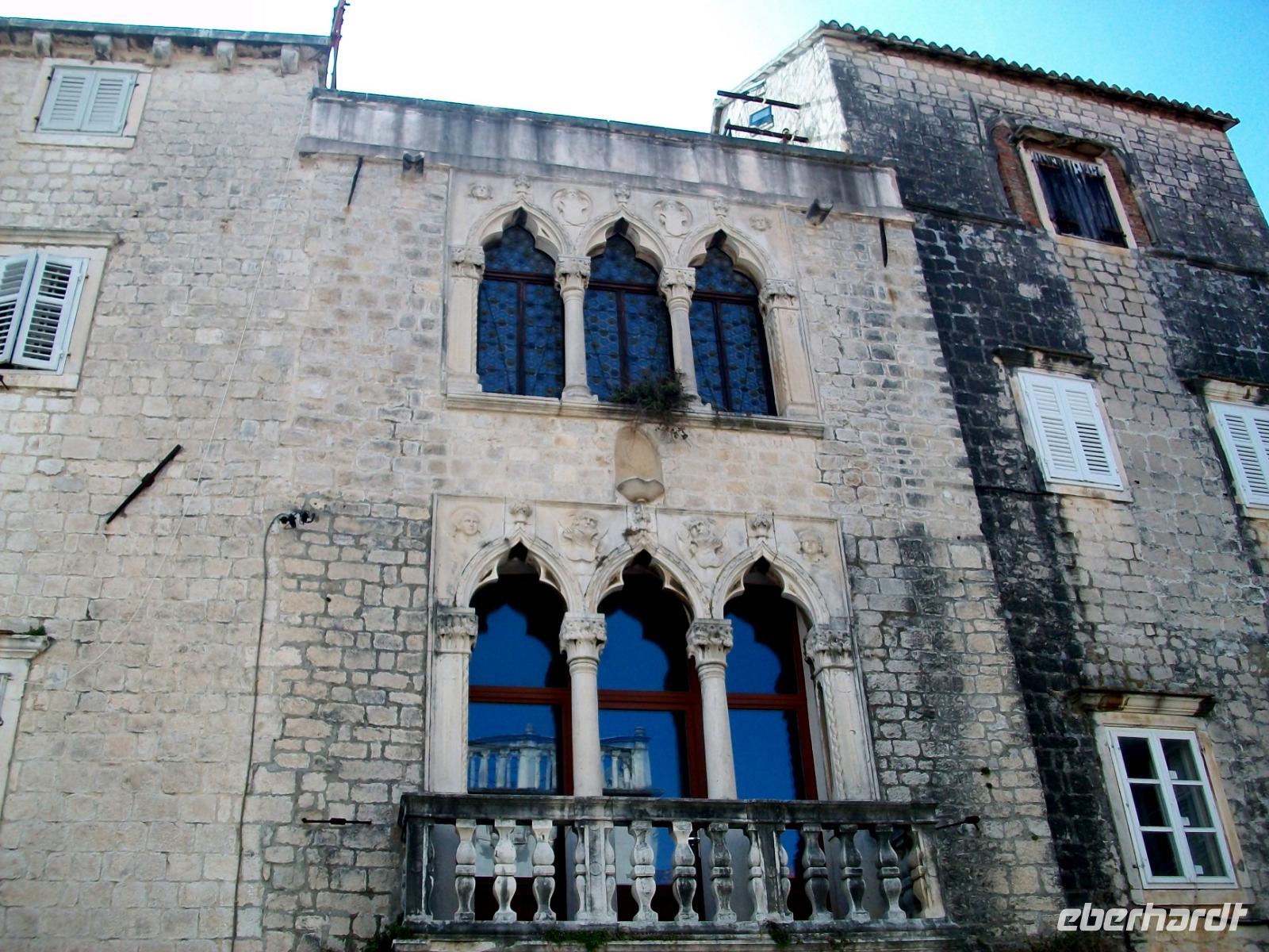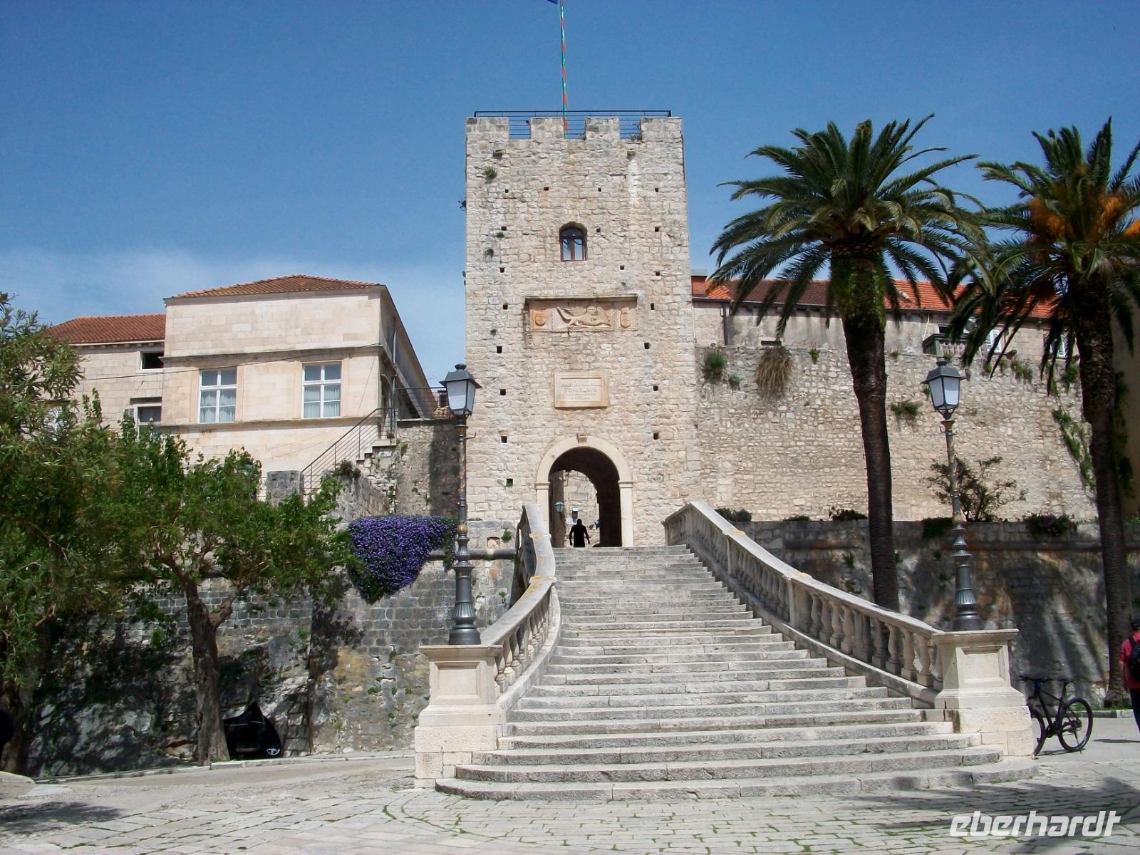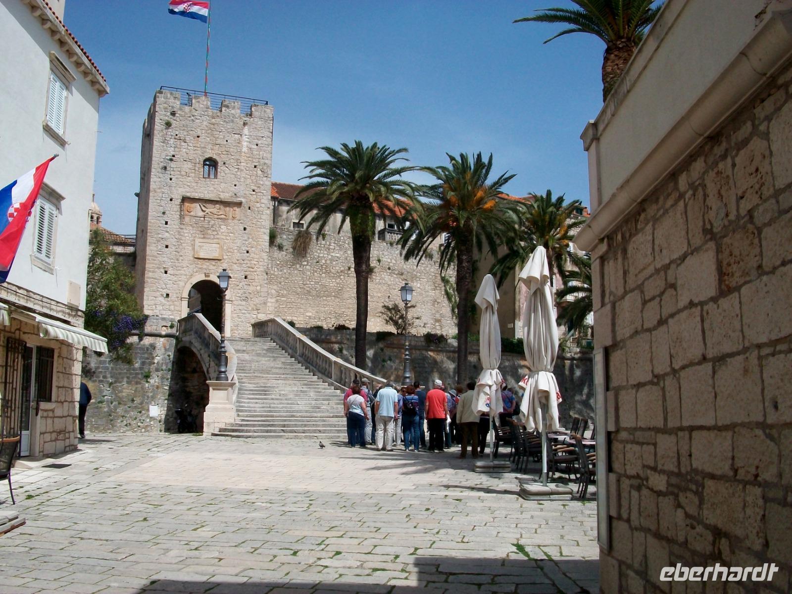 Dann geht es weiter; die Straße führt uns entlang der Weingärten, die Halbinsel Pelješac ist bekannt für einen guten Tropfen. Tief zu unseren Füßen erblicken wir bald den Ort Orebic, darüber die mächtige Erhebung des Heiligen Eliasberges. Unten im Ort angelangt können wir bald die Fähre nach Korcula besteigen und bei strahlendem Sonnenschein geht es hinüber zur Insel. Die Altstadt von Korcula gehört mit zu den schönsten Nestern die uns die Venezianer in Dalmatien hinterließen und mit Neda, unserer Führerin, sind wir bald in den schmalen Gassen der Stadt verschwunden. Wir erfahren etwas über das Treiben der Bruderschaften, genehmigen uns einen Museumsbesuch und schauen selbstverständlich auch in die einfache, aber schöne Kathedrale hinein.
