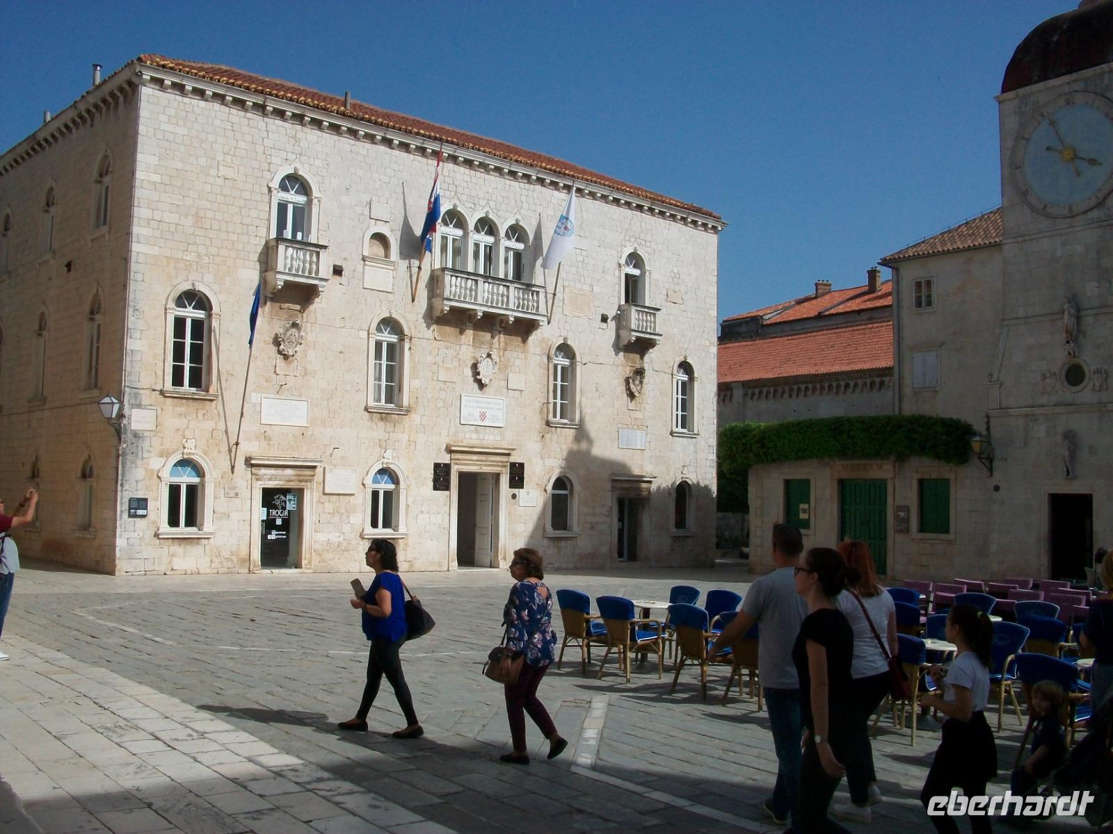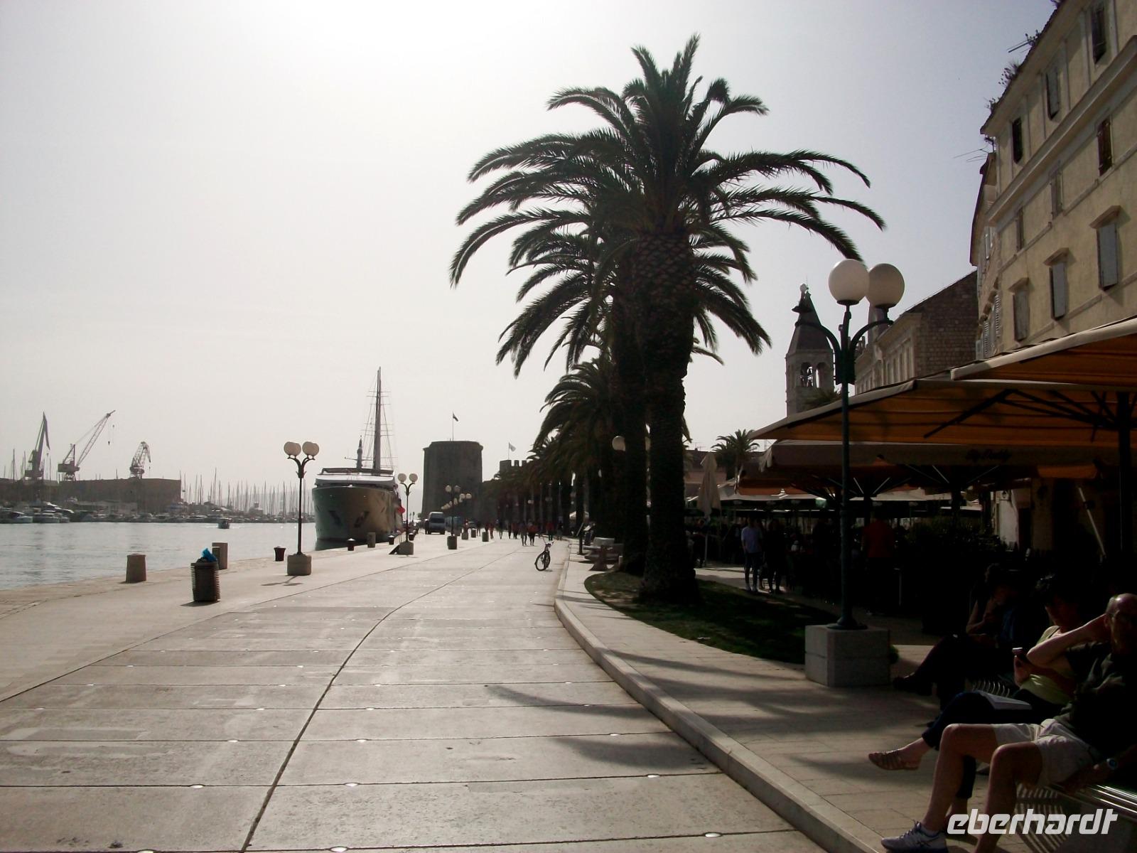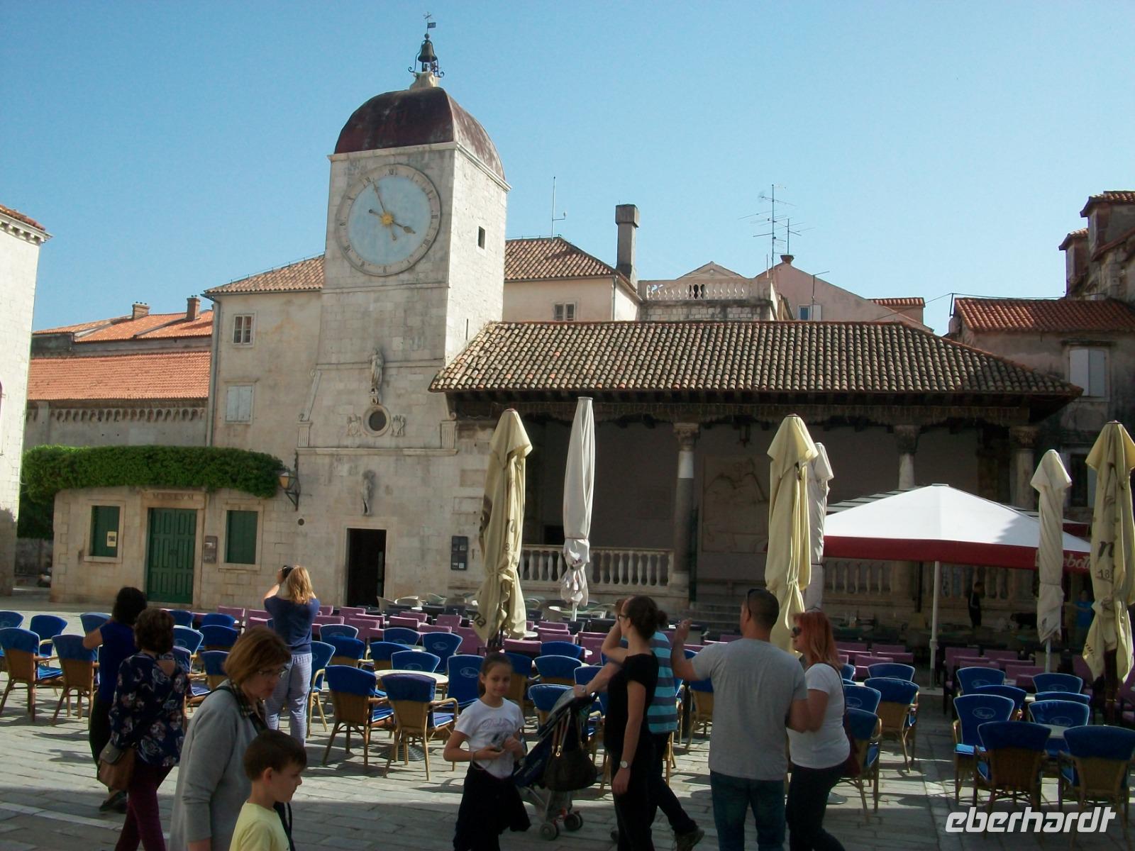 25.4.2019. Am Vormittag gelangen wir wieder hinüber zur Halbinsel; das Wetter hat sich recht gut gehalten und vom Aussichtspunkt aus nehmen wir Abschied von Korcula. Weingärten säumen unsere Bahn; bei Mali Ston sehen wir die Austernbänke und nach der Passage des Neretvadeltas führt uns der Weg hinauf zur Autobahn. Nun sehen wir die Erhebungen des Biokovo - Gebirges von der Rückseite; auf der anderen Seite eilen einsamen Ortschaften an den Fenstern vorbei, auch das sind interessante Impressionen welche unser Gastland zu bieten hat. Nach einer Mittagspause gelangen wir dann wieder zur Küste, von oben schweben wir buchstäblich nach Trogir ein; eine phantastische Kulisse breitet sich vor unseren Augen aus. Unten angelangt werden wir von Dijana erwartet, sie führte uns schon durch Split und mit ihrer temperamentvollen Art zeigt sie uns nun ein weiteres Welterbe: die Altstadt von Trogir.