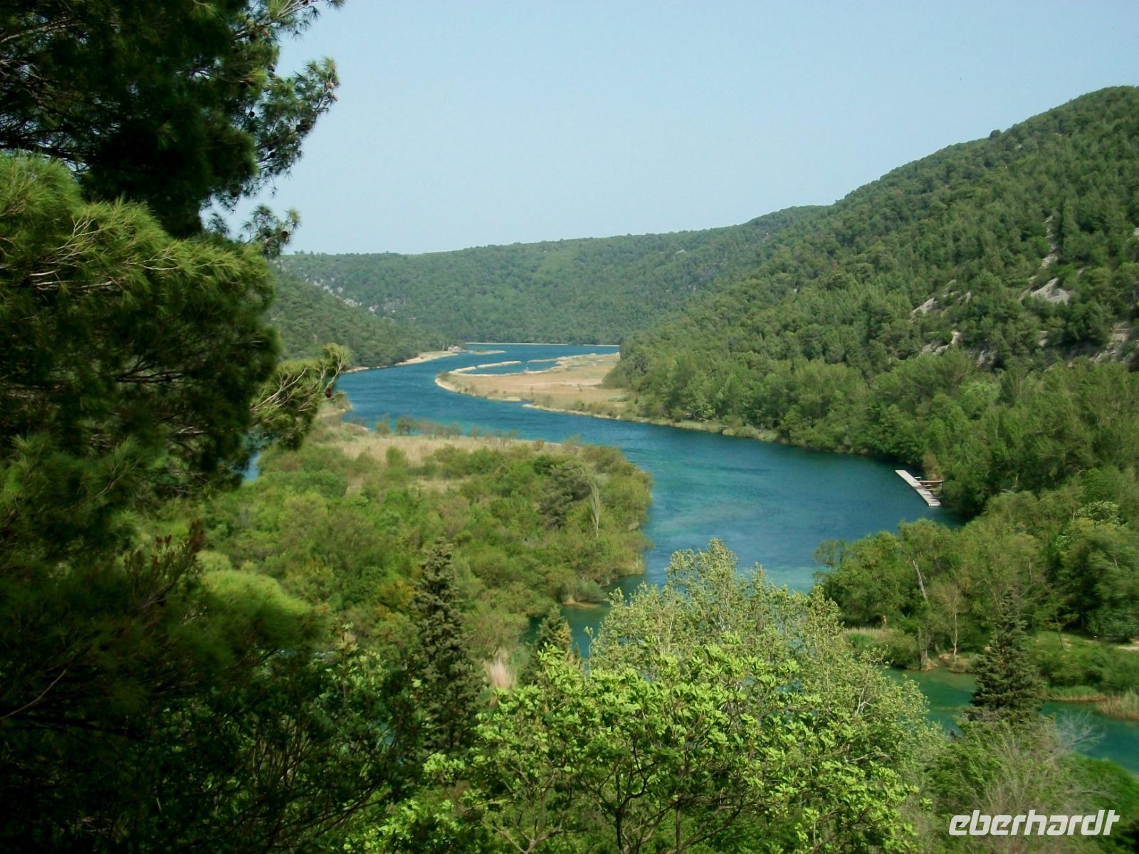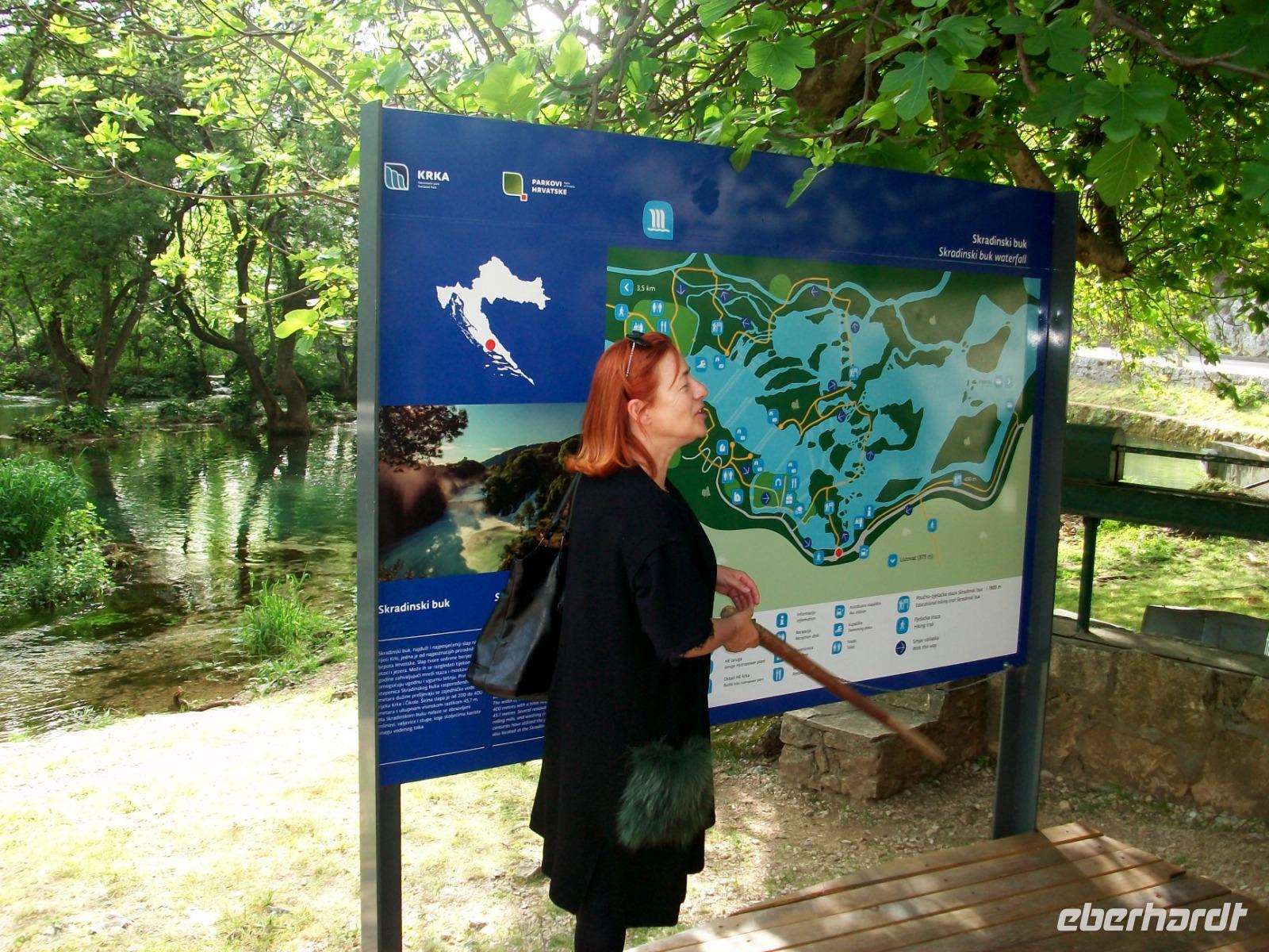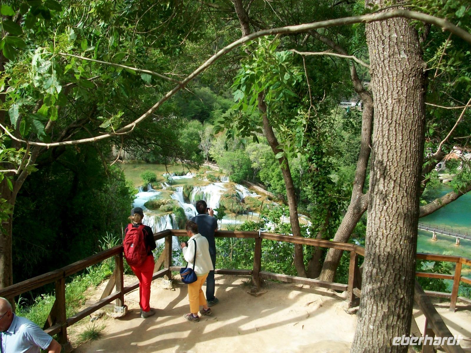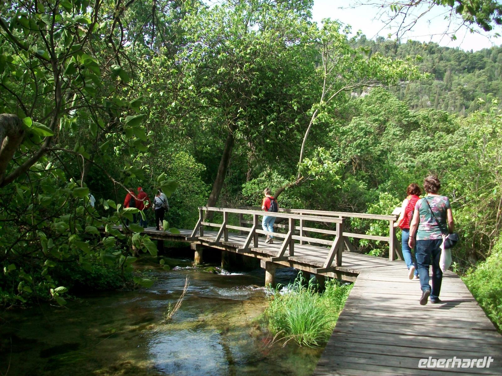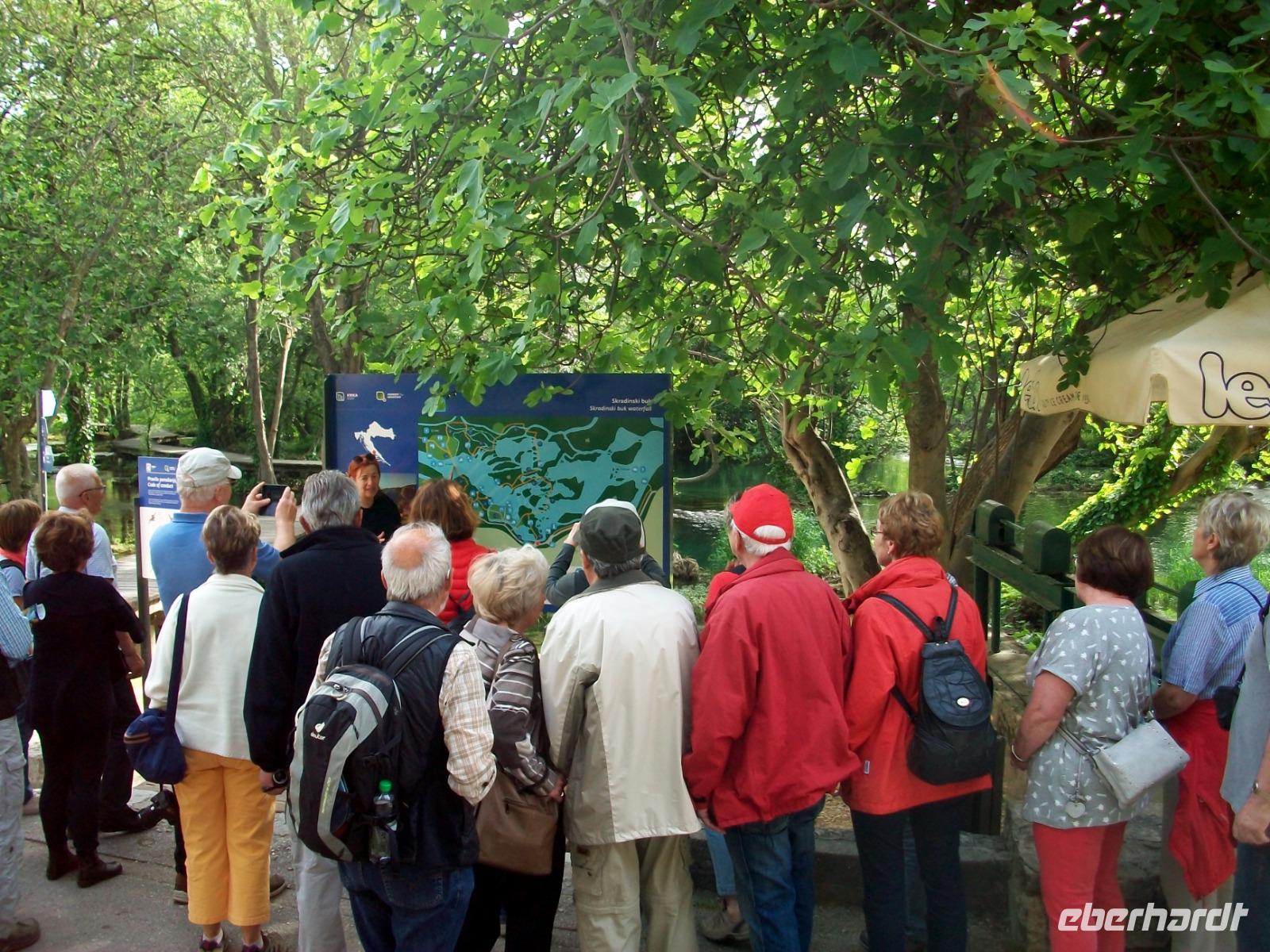 26.4.2019. Der Bus schlängelt sich die schmale Serpentinenstraßen hinab; unsere Augen erblicken eine pittoreske Seen- uns Flusslandschaft umgeben vom Grün zahlreicher Wälder. Wir sind in einem der größten Naturwunder Kroatiens, dem Krka - Nationalpark unterwegs. Bald sind wir unten angelangt und Irena, die Parkführerin, nimmt uns bei diesem Ausflug mit zu den fallenden Wassern dieses Karstflusses.