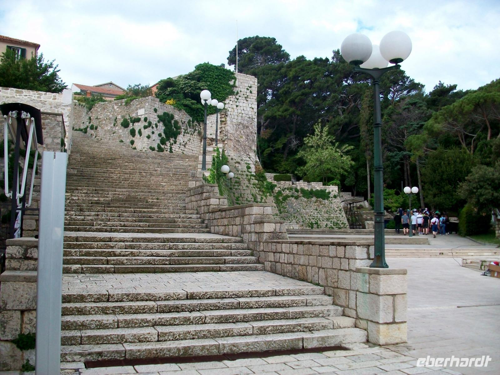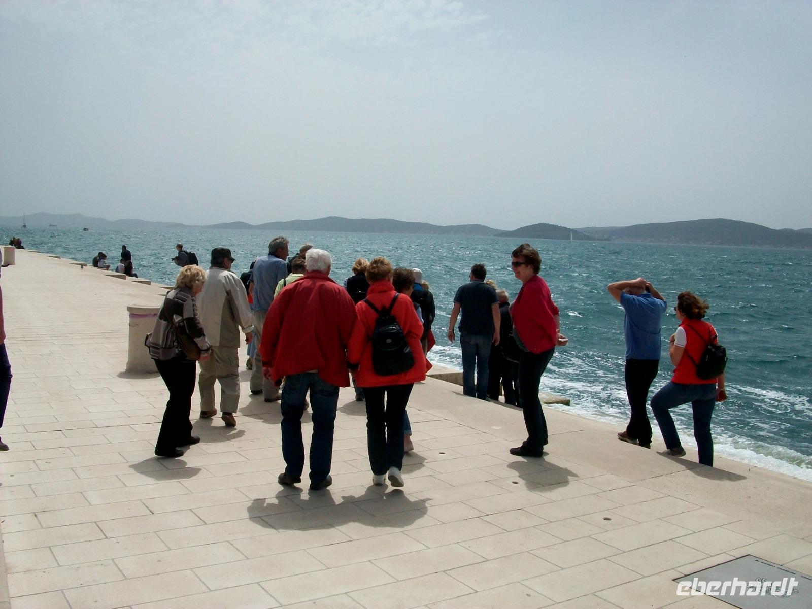 Gemütlichen Schrittes gelangen wir zu modernsten Attraktion der Stadt, es ist die Meeresorgel. Der Jugowind türmt Welle an Welle; er bringt mit rasantem Lauf dieses besondere Musikinstrument zum Erklingen, mächtige Töne sind hier zu hören die allein von Mutter Natur komponiert werden, faszinierend!