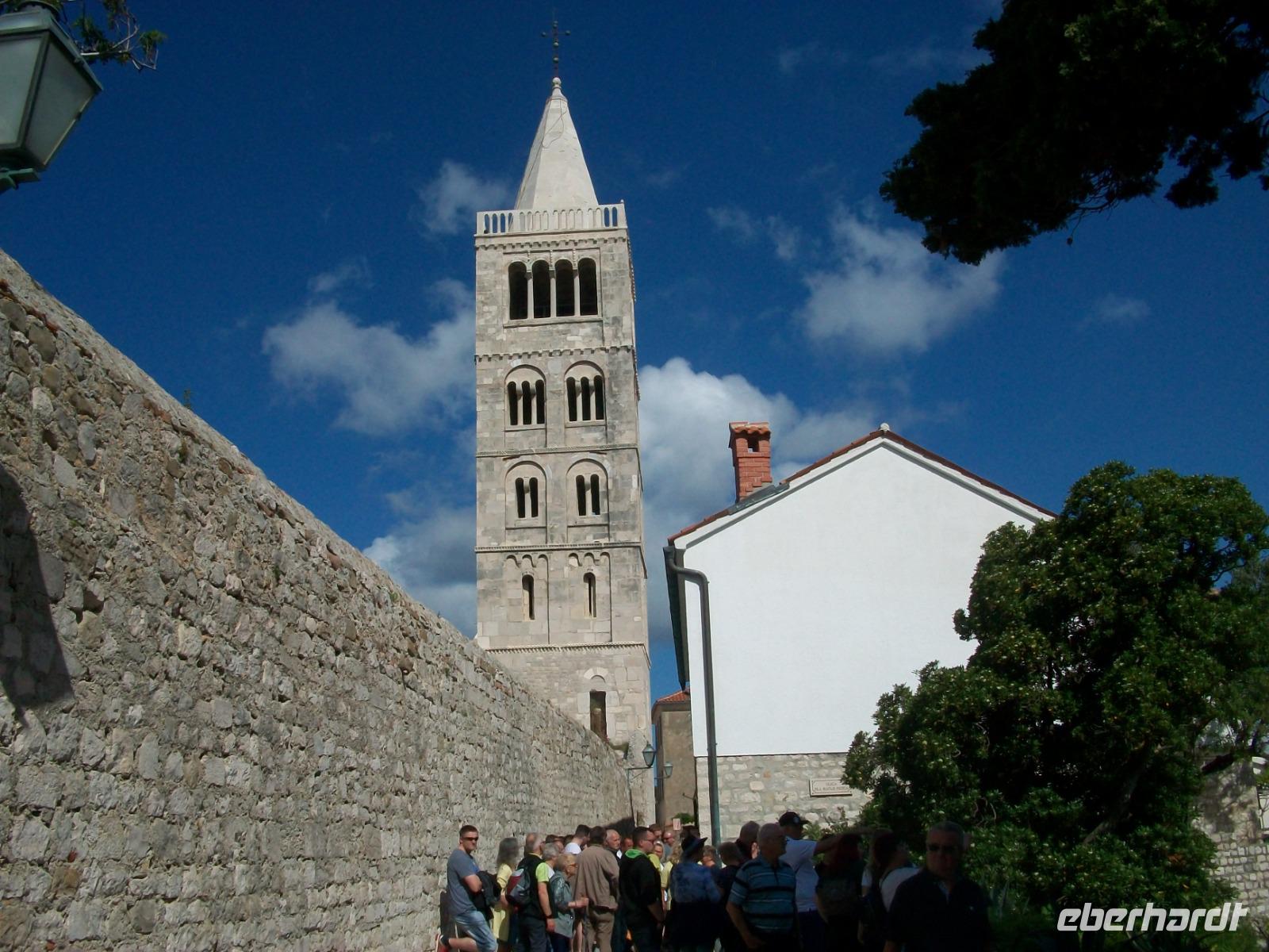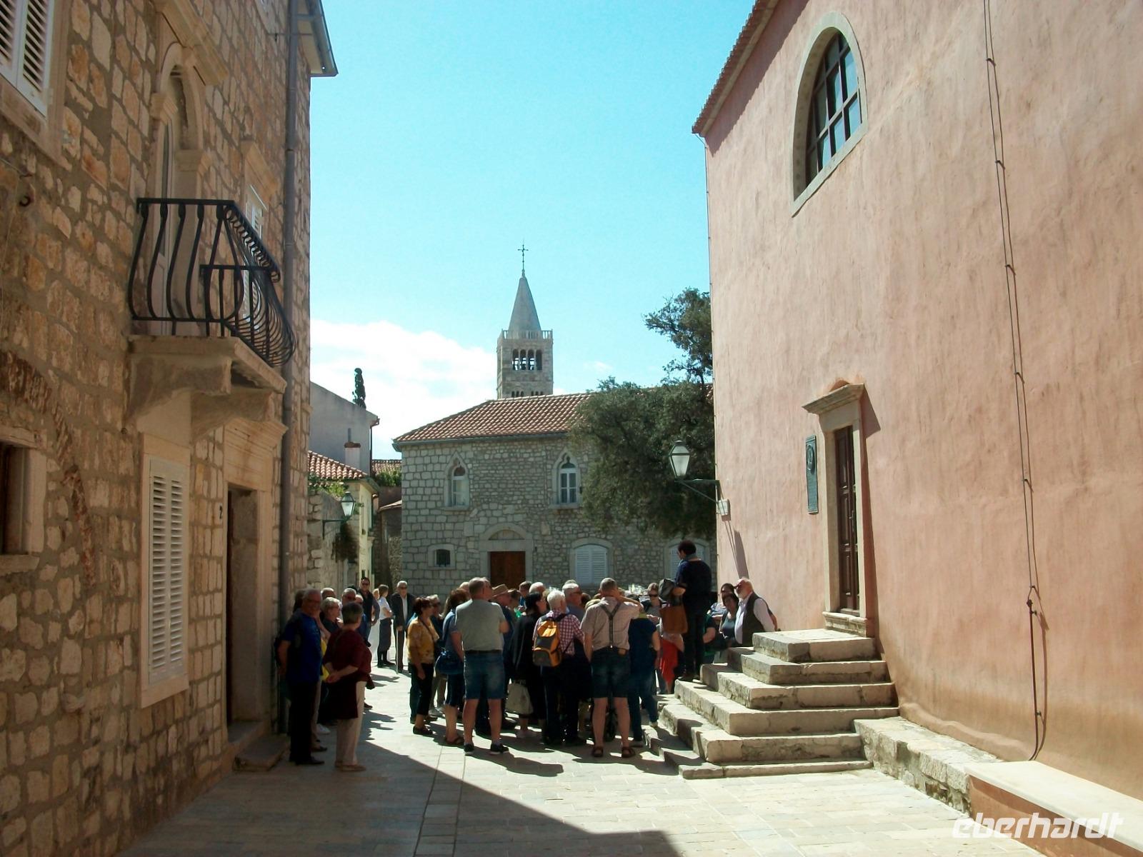 27.4.2019. So nannten die alten Römer diese Insel die ein üppiges Grün ihr Eigen nennen kann. Beim Frühstück sitzend sehen wir die wunderbare Kulisse der Altstadt mit ihren vier Kirchtürmen in der Morgensonne strahlen, das macht Appetit auf mehr! Pünktlich kommt Bobana zum Hotel, sie wird uns mir ihrer niveauvollen und sympathischen Art am heutigen Tag begleiten. Zunächst erkunden wir die Altstadt selbst. Ein schon gewohnter Anblick zeigt sich uns auch hier: malerische Gebäude aus längst vergangenen Zeiten, schmale, romantische Gassen und belebte Plätze. An diesem schönen, jedoch etwas kühlen Morgen, erschließen wir uns diese Perle des Kvarners. Wir lernen die zahlreichen kleinen Klöster und Kirchen kennen, steigen hinauf zur oberen Gasse und genießen, hoch über dem Wasser, einen schönen Ausblick auf die Inselwelt die Rab umgibt.