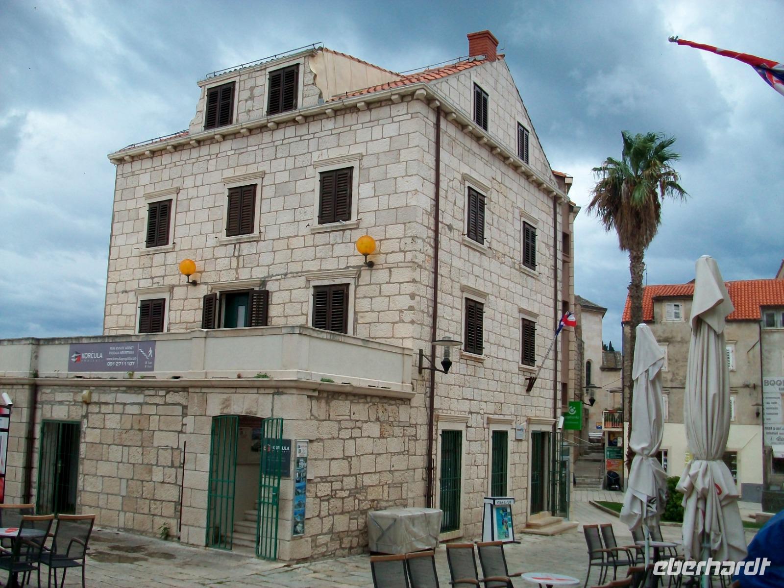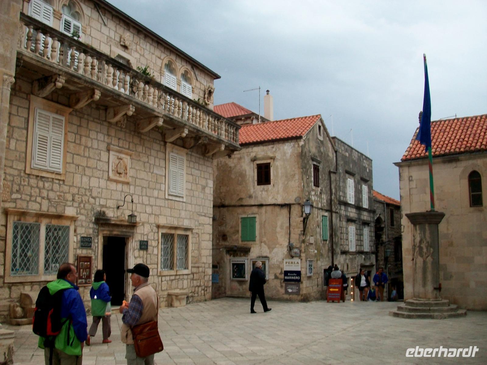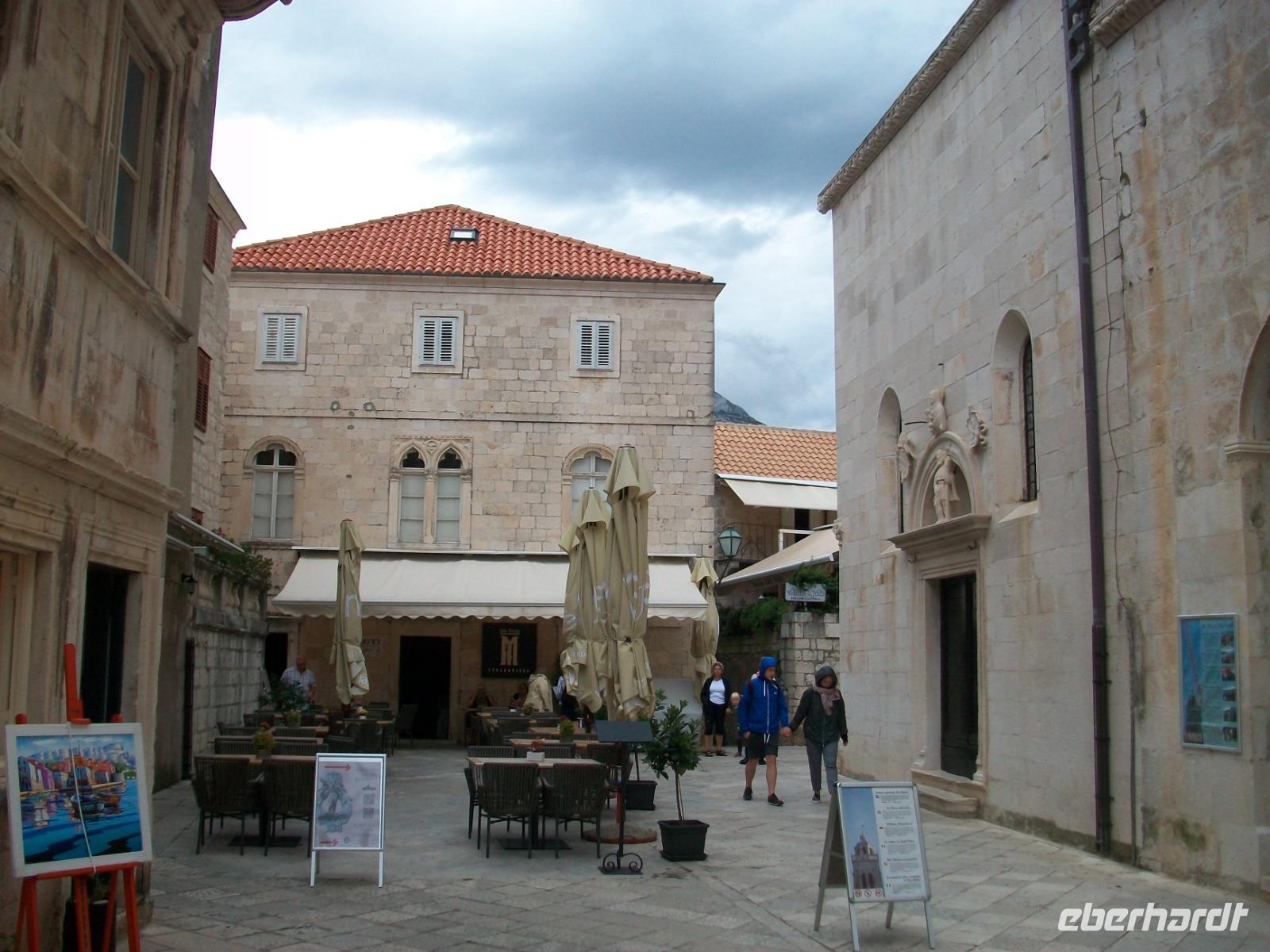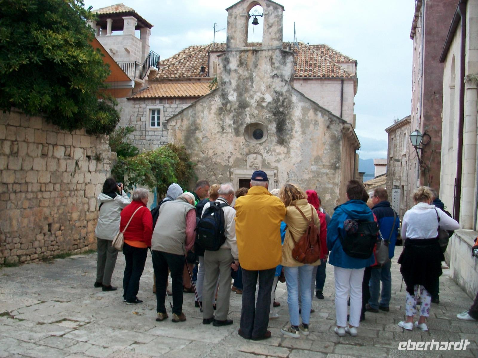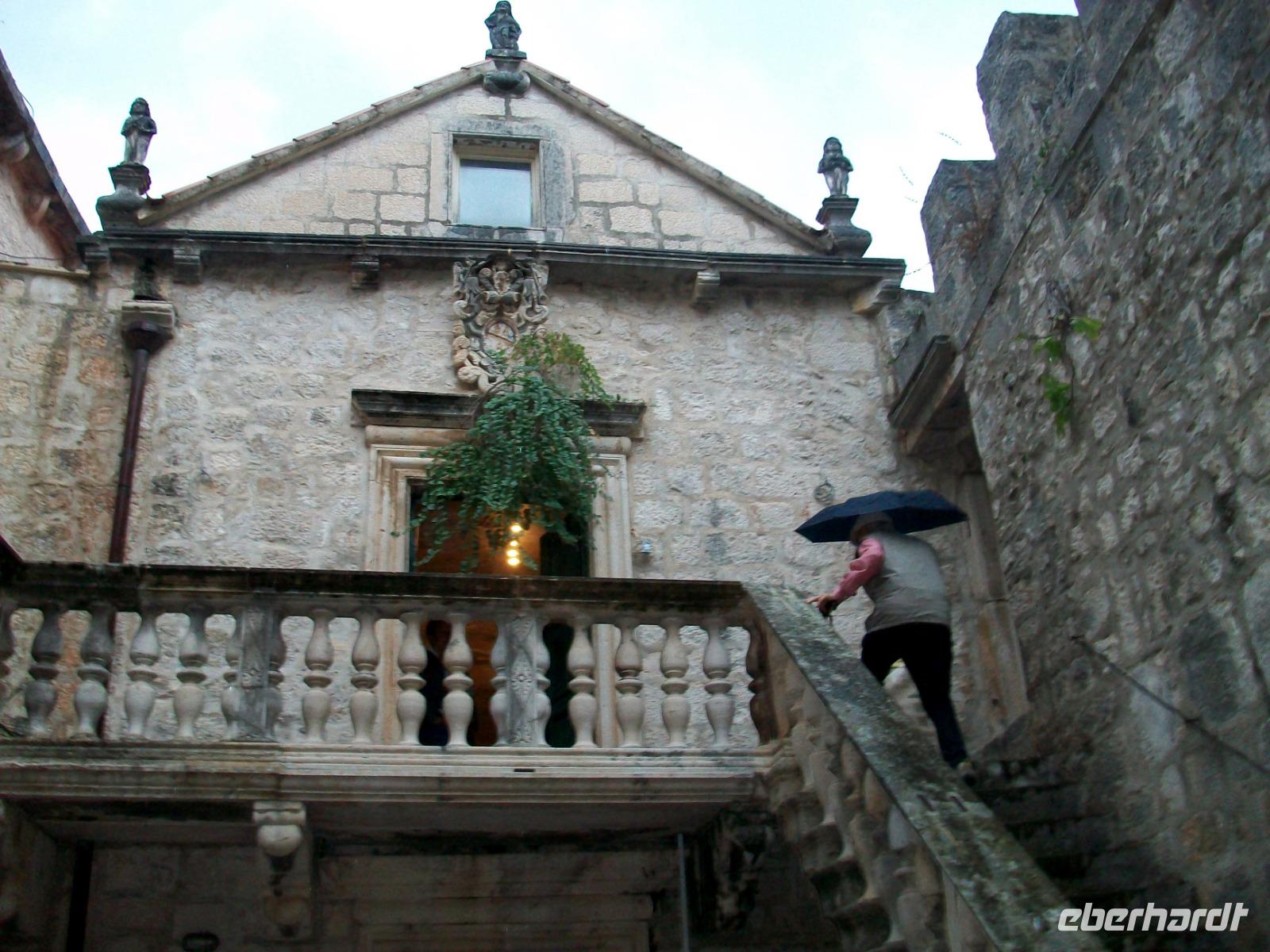 3.10.2019. Blitz und Donner zogen in dieser Nacht über uns hinweg, auch die weitere Prognose sieht nicht sehr günstig aus. Dennoch, am heutigen Tag werden wir unsere erste Insel auf dieser Reise kennenlernen. Dazu machen wir uns wieder etwas früher auf, es gibt viel zu entdecken! Wir sind erneut auf der Küstenstraße unterwegs; vor uns hat sich eine tiefdunkle Front aufgebaut und bald sind wir in einem Unwetter unterwegs. Es schüttet in Strömen, grelle Blitze und lauter Donner begleiten unseren Weg. Eigentlich hatten wir vor dem Ort Ston einen Besuch abzustatten, hier gewannen die Ragusaner einst das Salz, aber auch hier lässt der wolkenbruchartige Regen nicht nach, so dass wir uns schweren Herzens entscheiden müssen weiter zu fahren. Wir sind nun auf der Halbinsel Pelješac unterwegs; wir sehen die Weinfelder und Buchten mit der Muschelzucht. Am Horizont sind erste Auflockerungen zu sehen, das lässt hoffen. Als wir dann hoch über Orebic einen Fotostopp einlegen, lässt sich sogar die Sonne kurz sehen und bescheint unser Ziel: die Insel Korcula. Dann begeben wir uns wieder hinunter auf Meeresniveau und warten im Hafen auf die Fähre die uns hinüber zur Insel bringen wird. Nun scheint sich das Wetter doch bessern zu wollen und nach Überfahrt und einem kurzen Stopp am Hotel, kommt unsere Stadtführerin Neda, sie wird uns nun eine der ältesten und schönsten Orte der Adria zeigen: Korcula. Sicherheitshalber nehmen wir die Regenschirme mit, wir werden sie noch dringend brauchen!