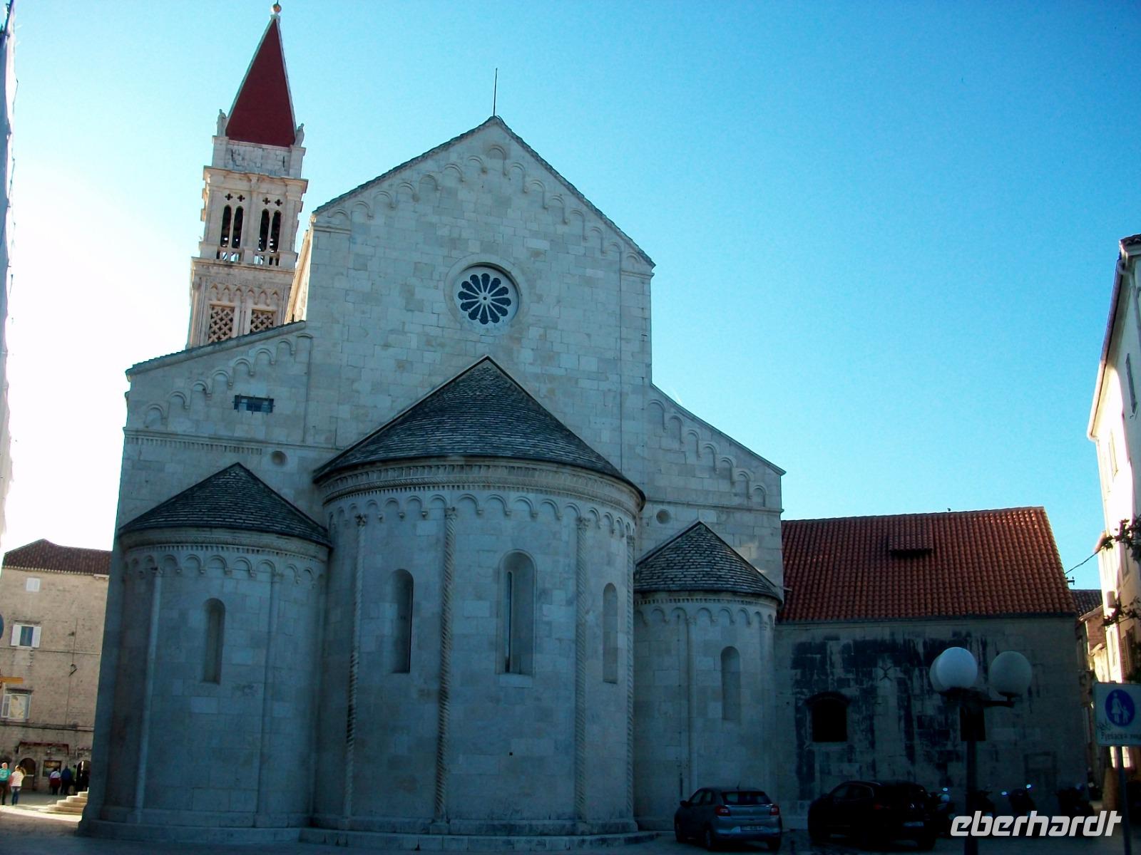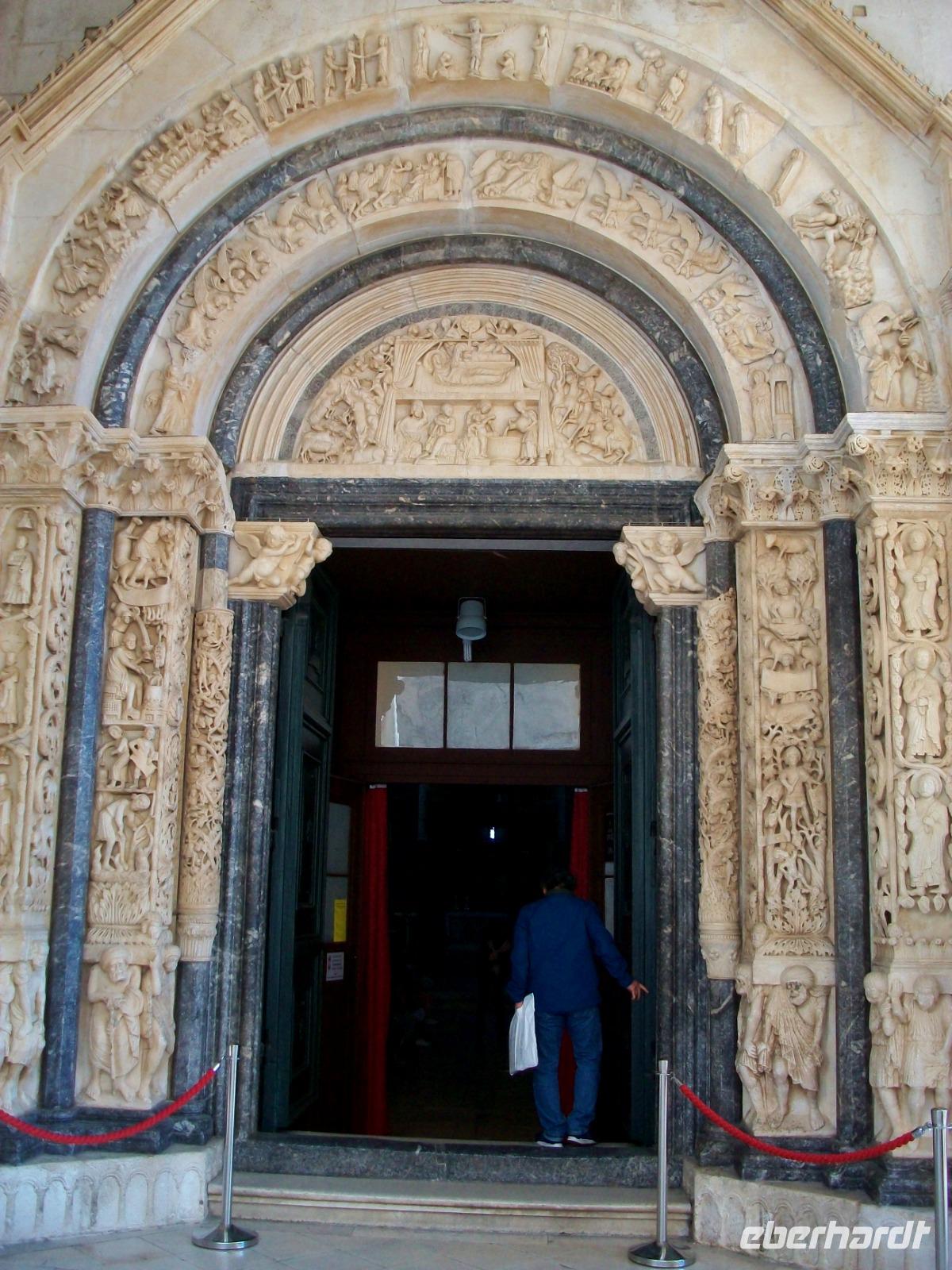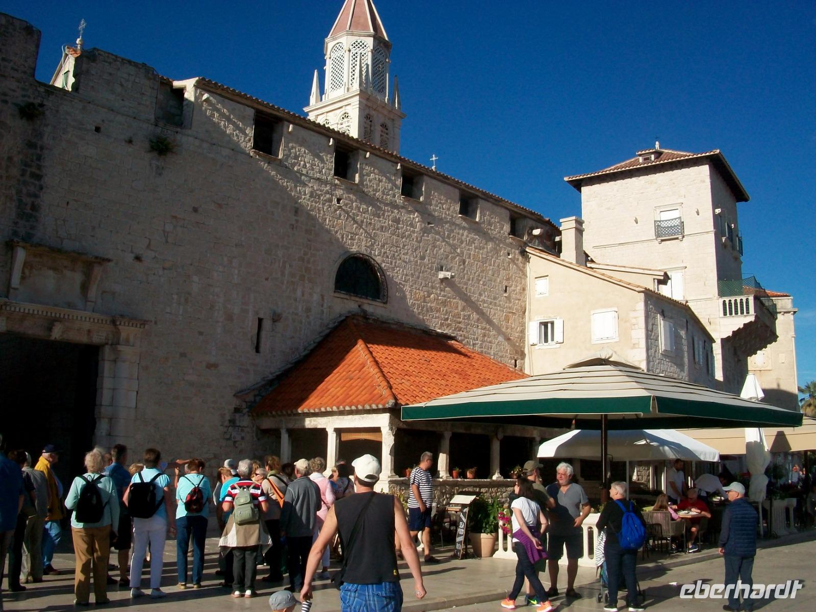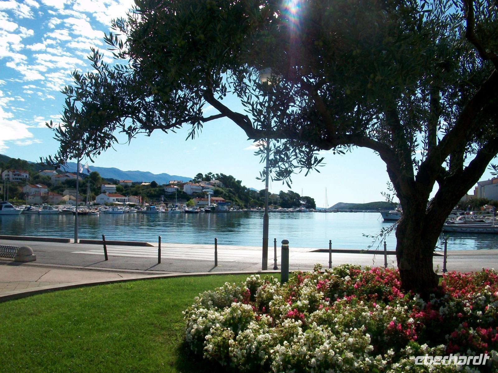 Heute haben wir uns viel vorgenommen; schöne Gegenden die wir durchfahren wollen und eine hochinteressante Stadt, aber der Reihe nach. Zunächst gelangen wir zur Fähre mit ihr verlassen wir die Insel Korcula. Dann fahren wir an zahlreichen Weingärten vorbei und wieder zur Uferstraße; bald queren wir noch einmal das Tal der Neretva mit den üppigen Fruchtanpflanzungen. Überall an den Bäumen hängen gelbe Tupfer, es sind die reifen Mandarinen die auf ihre Ernte warten. Nicht lange und wir sind wir im Hinterland angelangt; wir sehen hier die Hochtäler die aufgrund eines ausgeklügelten Bewässerungssystems ebenfalls dem Obst- und Gemüseanbau dienen und gelangen entlang des beeindruckenden Biokovo - Gebirges weiter durch eine faszinierende Landschaft. Am Nachmittag nehmen wir aber wieder Kurs in Richtung Adriaküste; von hoch oben schweben wir buchstäblich ein und von dieser Vogelperspektive aus sehen wir die blauschimmernde Wasserfläche, die grünen Inseln und die reizvollen Orte Mitteldalmatiens. Nach kurzer Fahrt gelangen wir hinab auf das Meeresniveau und zu einem weiteren besonderen Ort: Trogir. Hier werden wir von Dijana erwartet, sie führte uns schon in Split und die Besichtigung dieser Stadt wird mit ihr wieder zum Erlebnis.