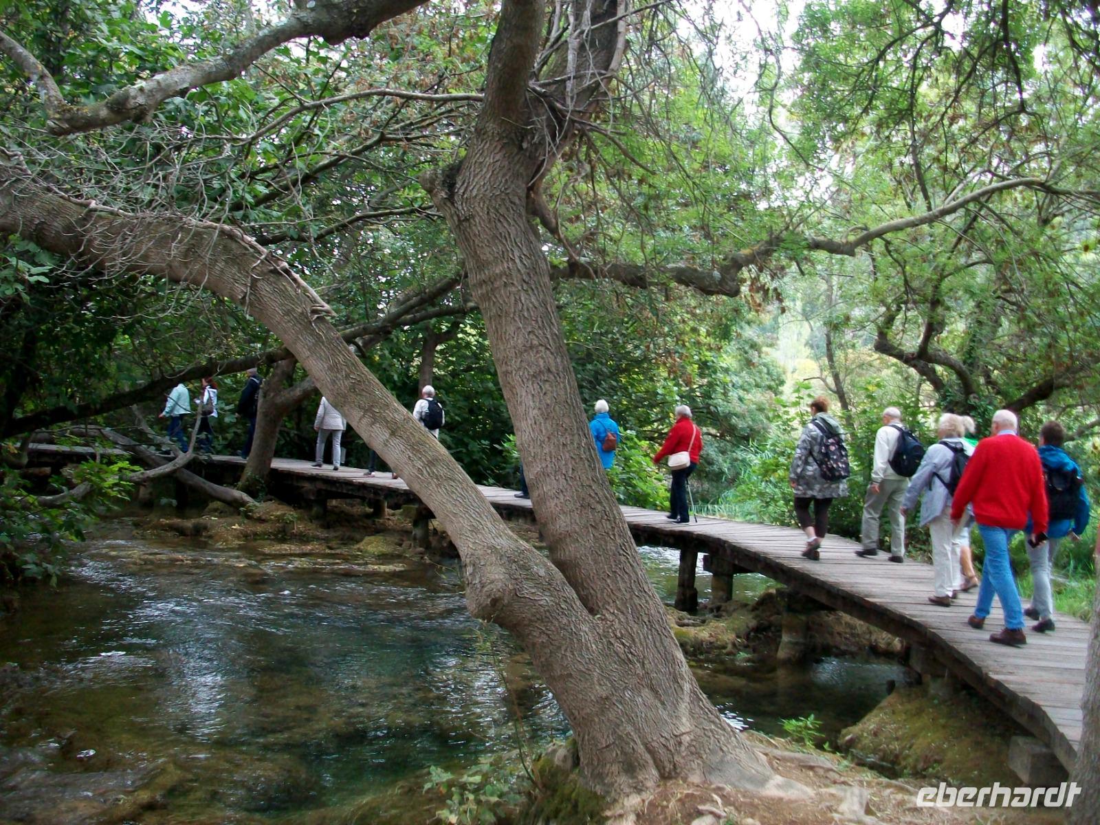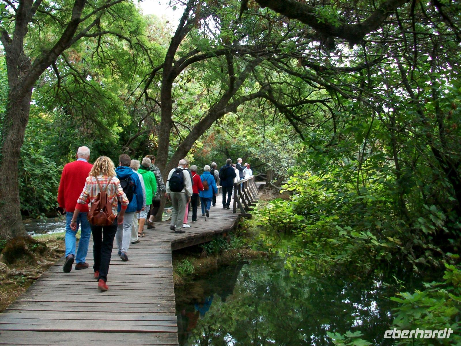 5.10.2019. Ein etwas zeitigeres Aufstehen sorgt dafür, dass wir am heutigen Vormittag eines der großen Naturwunder Kroatiens in Ruhe genießen können. Die Sonne lacht vom blauen Himmel herab als wir uns aufmachen um ein wenig ins Hinterland vorzustoßen. Am Eingang zum Krka - Nationalpark sehen wir: Wir sind heute die Ersten hier. Völlig ungehindert geht es hinab und mit unserer Führerin Veronika gelangen wir bald zu den spektakulären Ausblicken auf den Skardinski Buk, dem mächtigen Wasserfall. Wir spazieren entlang von sich drehenden Mühlsteinen, einer mittelalterlichen Waschmaschine um von hier aus direkt an das Wasser der Krka zu gelangen. Über gut ausgebaute Wege und Knüppeldämme geht es nun zu den zahlreichen Seitenarmen des Flusses der hier überall kleinere und größere Kaskaden bildet - faszinierend! Immer mittendrin im rauschenden Element gelangen wir hinunter zur Brücke und haben nun den gesamten Wasserfall und die Kalkterrassen vor unseren Augen. Das frühe Aufstehen hat sich gelohnt, unsere Gruppe ist hier noch allein, nur eine halbe Stunde später wird es hier ganz anders aussehen. Dann gelangen wir wieder hinauf und genießen mit dem Blick von oben noch etwas Freizeit auf dieses wirkliche Naturwunder.
