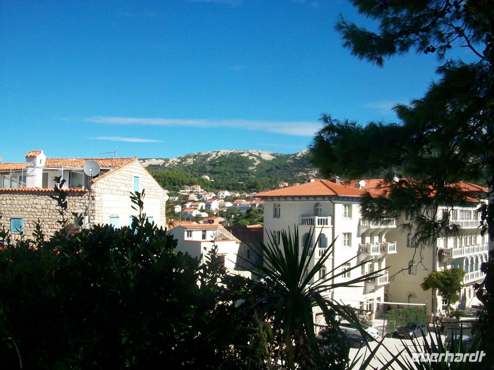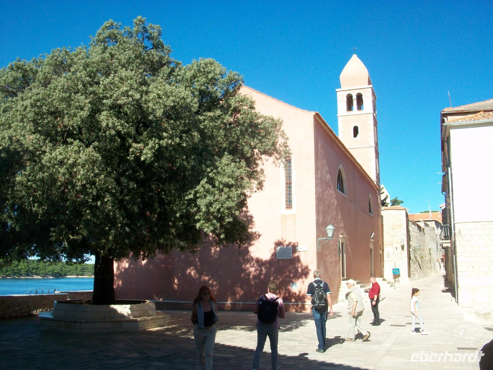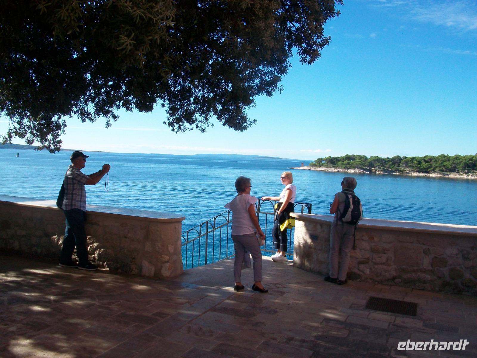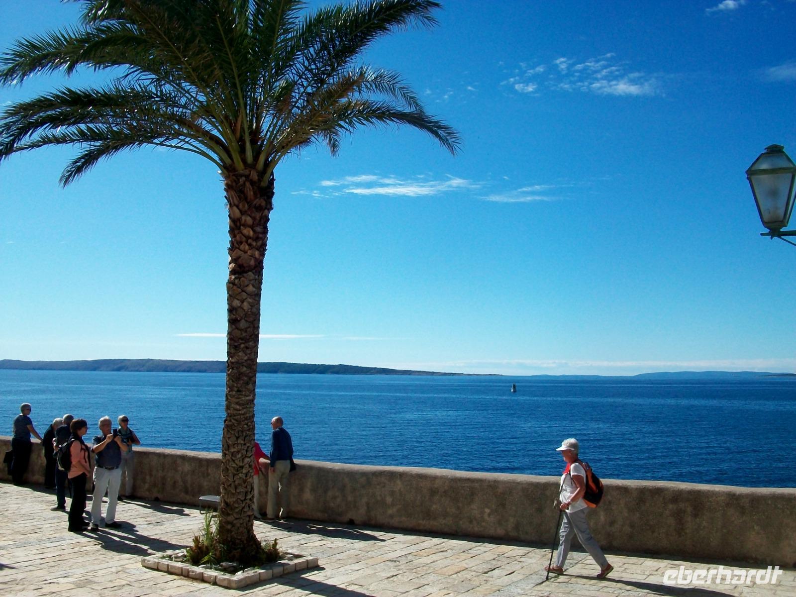 6.10.2019. Der Spätsommer hat sich hier auf der Insel noch einmal aufgemacht um uns einen letzten schönen Tag in Kroatien zu bescheren. Üppiges Grün des gepflegten Parks der unser Hotel umgibt begleitet uns auf den ersten Metern dieses vormittäglichen Rundgangs durch den Ort Rab. Uns begleitet Bobana, sie wird uns nun diese Perle des Kvarners, so wird der Ort oft genannt zeigen. Mit ihr gelangen wir hinunter zum Hafen und von hier nach rechts in die Altstadt. Über Treppen geht es hinauf zur oberen Gasse, alles ist außerordentlich gepflegt und sauber; die Einheimischen haben hier kleine Gärten angelegt und bunter Blumenschmuck ziert so manchen Balkon. Und dann ist da wieder die Historie: Wir tauchen erneut ab in vergangene Jahrhunderte und an der Freiheitseiche genießen wir das einmalige Panorama hinüber nach Suha Punta. Weiter geht es; vorbei an Kirchen und Klöstern, schließlich gelangen wir am Denkmal des Heiligen Marin vorbei und sind bald an belebteren Plätzen angelangt. In den Cafés treffen sich die Einheimischen zum munteren Gespräch und alle genießen in Ruhe den schönen Sonntagvormittag.