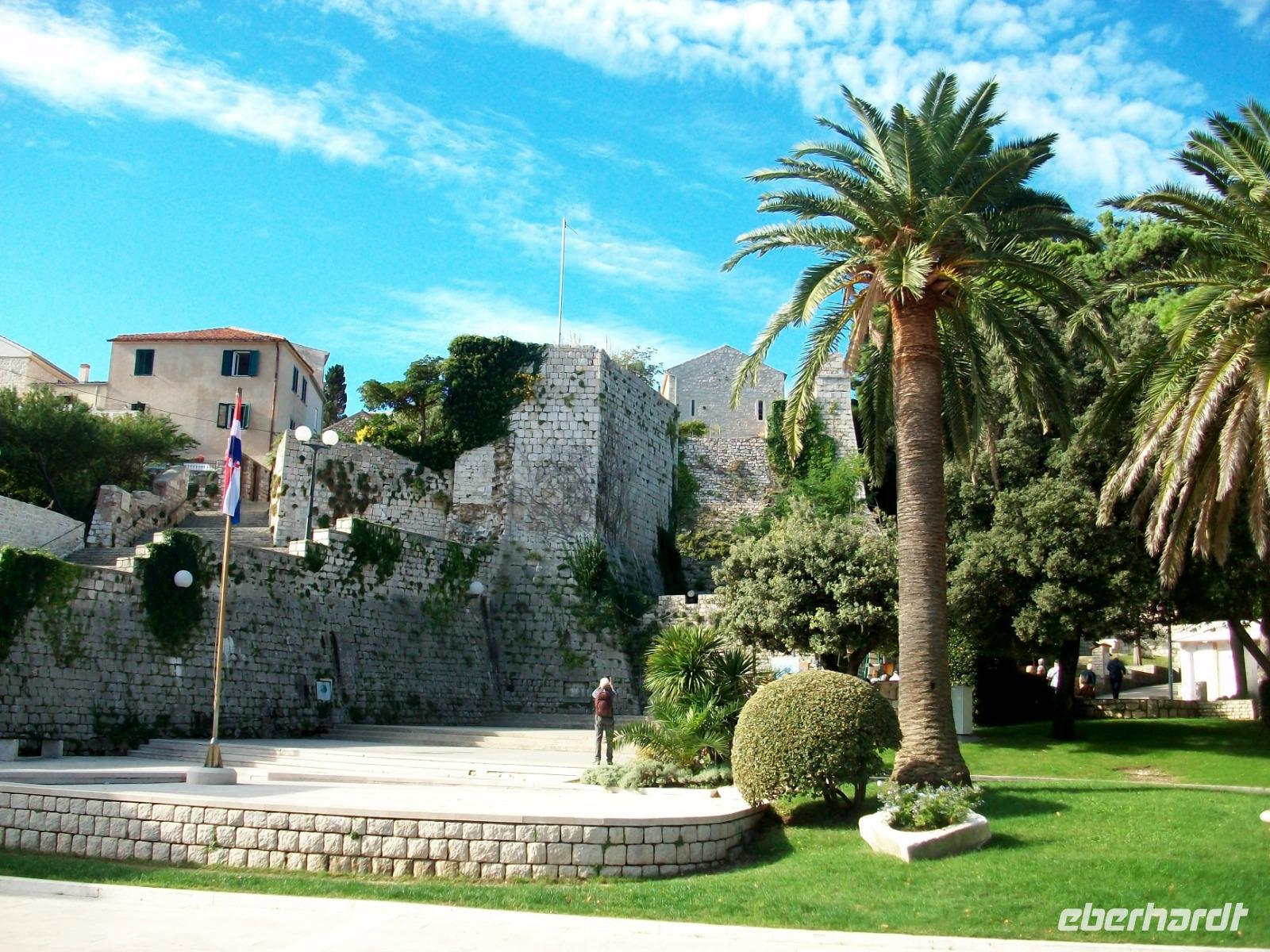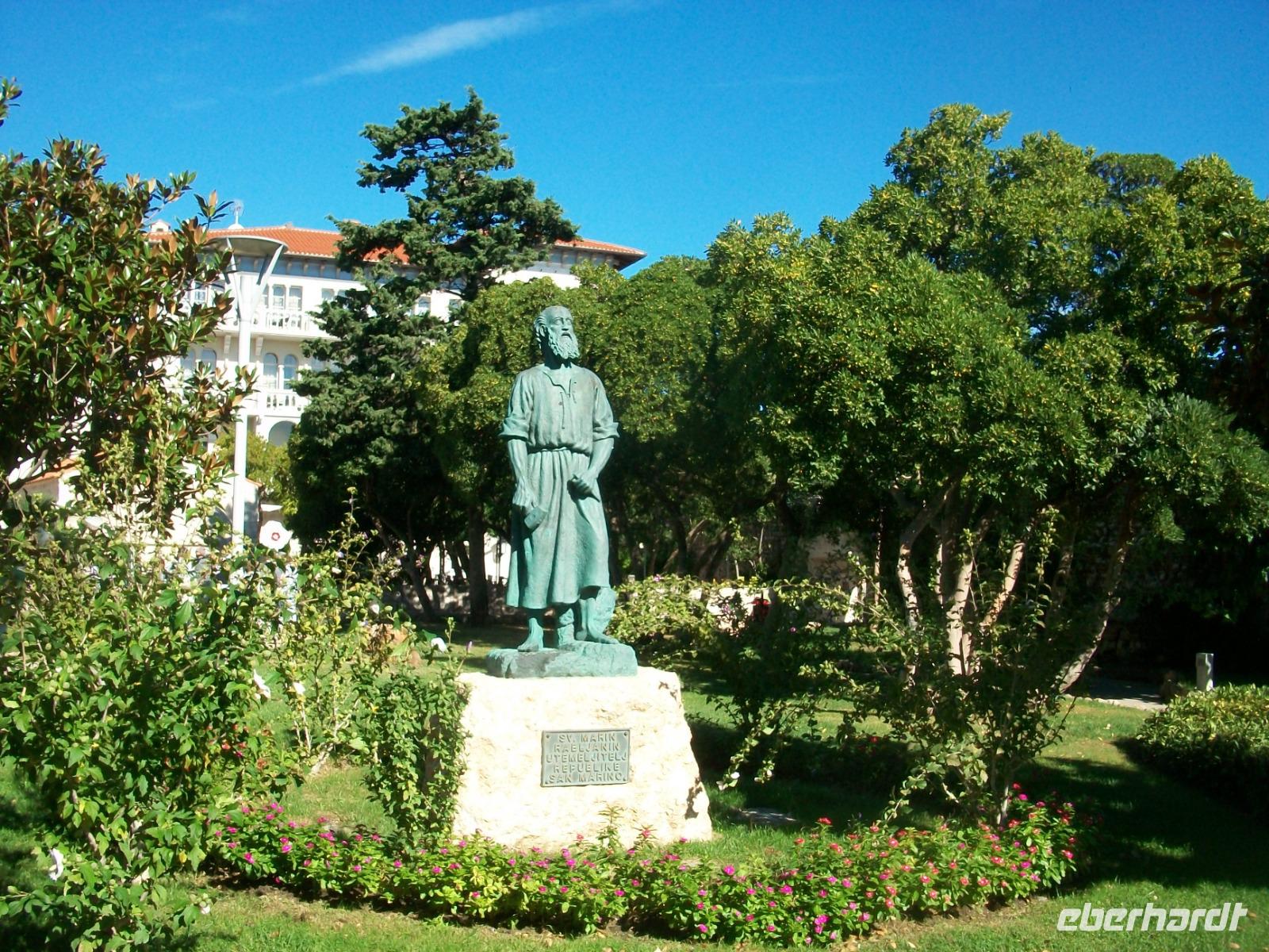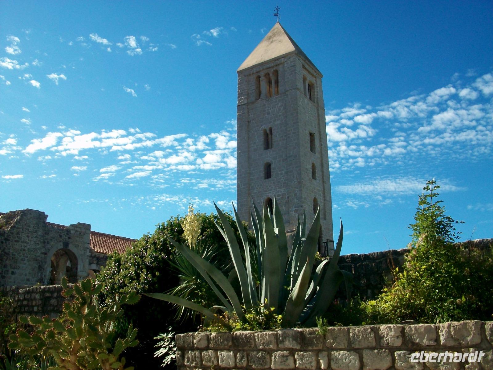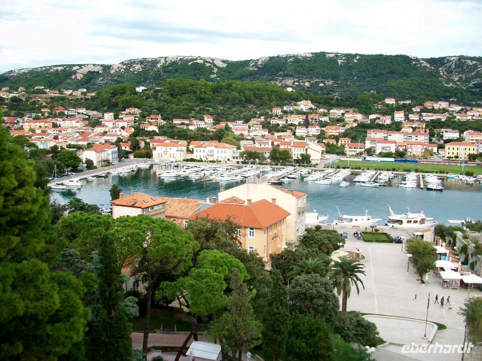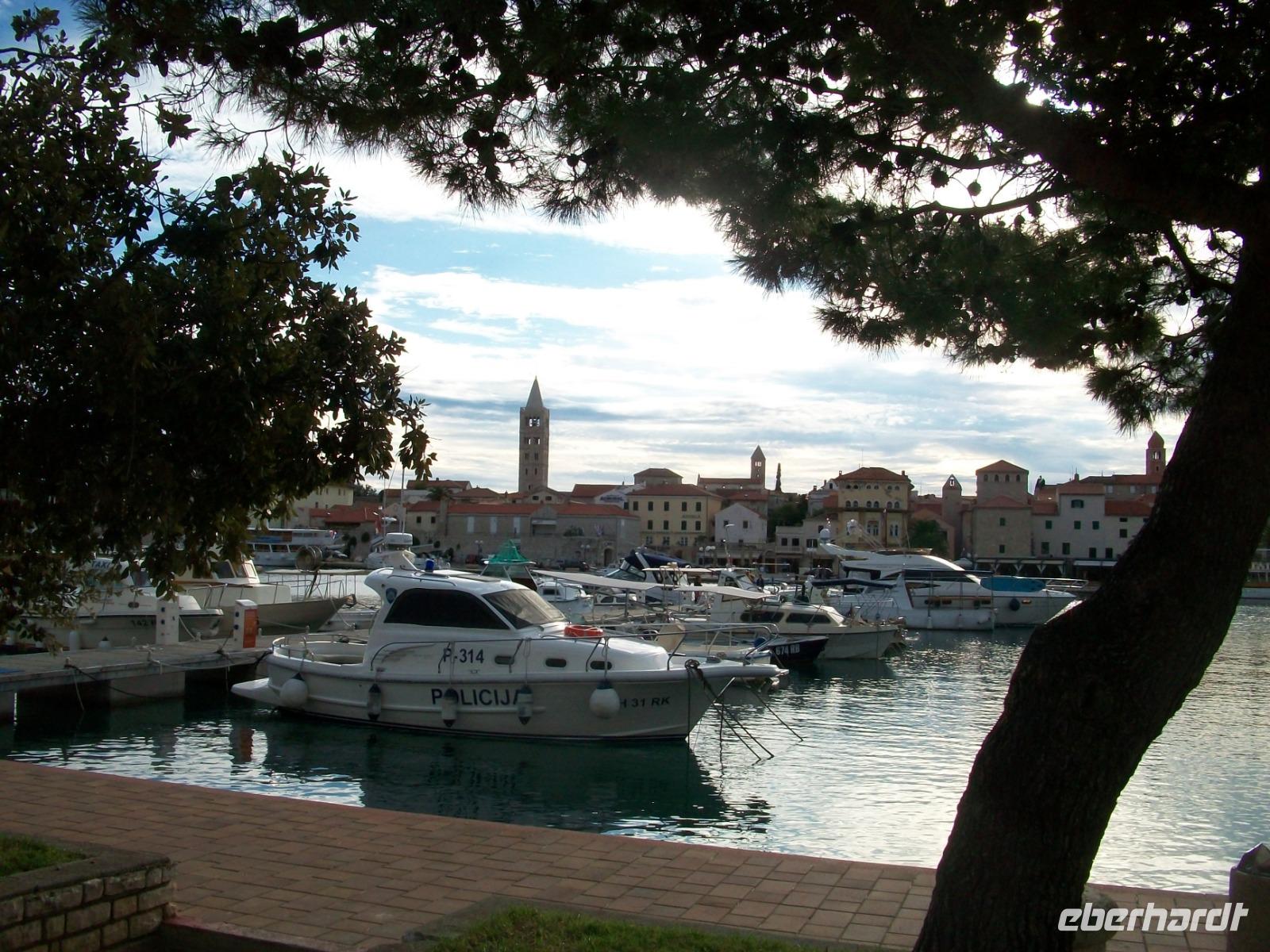6.10.2019. Der Spätsommer hat sich hier auf der Insel noch einmal aufgemacht um uns einen letzten schönen Tag in Kroatien zu bescheren. Üppiges Grün des gepflegten Parks der unser Hotel umgibt begleitet uns auf den ersten Metern dieses vormittäglichen Rundgangs durch den Ort Rab. Uns begleitet Bobana, sie wird uns nun diese Perle des Kvarners, so wird der Ort oft genannt zeigen. Mit ihr gelangen wir hinunter zum Hafen und von hier nach rechts in die Altstadt. Über Treppen geht es hinauf zur oberen Gasse, alles ist außerordentlich gepflegt und sauber; die Einheimischen haben hier kleine Gärten angelegt und bunter Blumenschmuck ziert so manchen Balkon. Und dann ist da wieder die Historie: Wir tauchen erneut ab in vergangene Jahrhunderte und an der Freiheitseiche genießen wir das einmalige Panorama hinüber nach Suha Punta. Weiter geht es; vorbei an Kirchen und Klöstern, schließlich gelangen wir am Denkmal des Heiligen Marin vorbei und sind bald an belebteren Plätzen angelangt. In den Cafés treffen sich die Einheimischen zum munteren Gespräch und alle genießen in Ruhe den schönen Sonntagvormittag.
