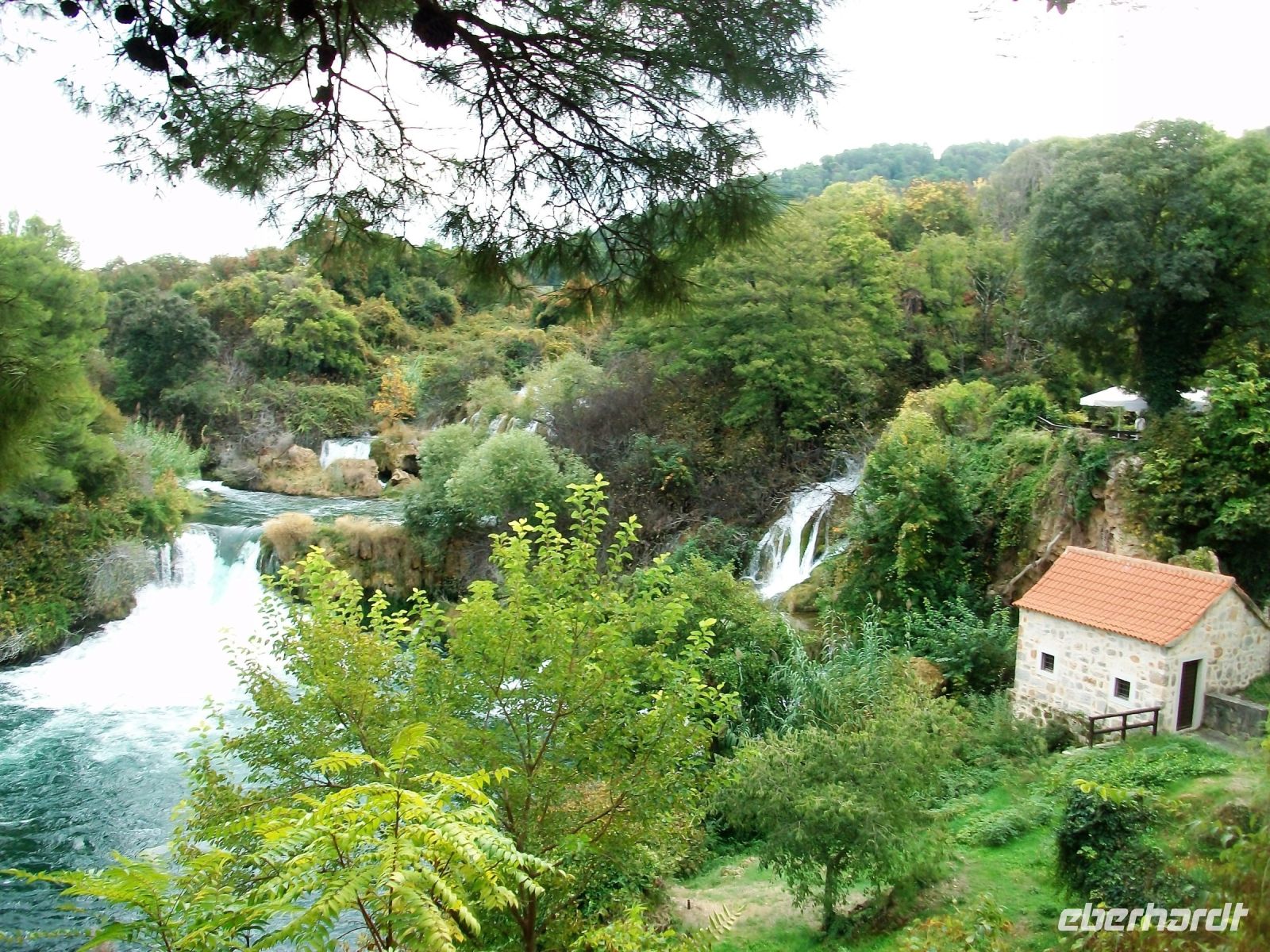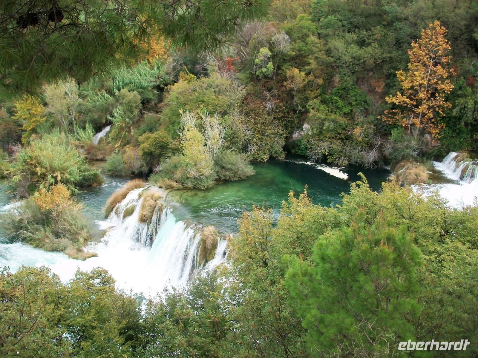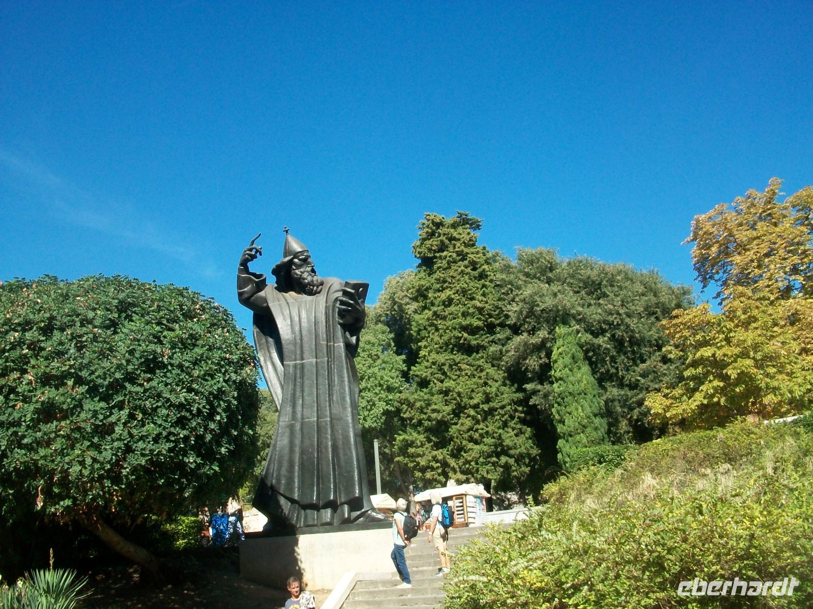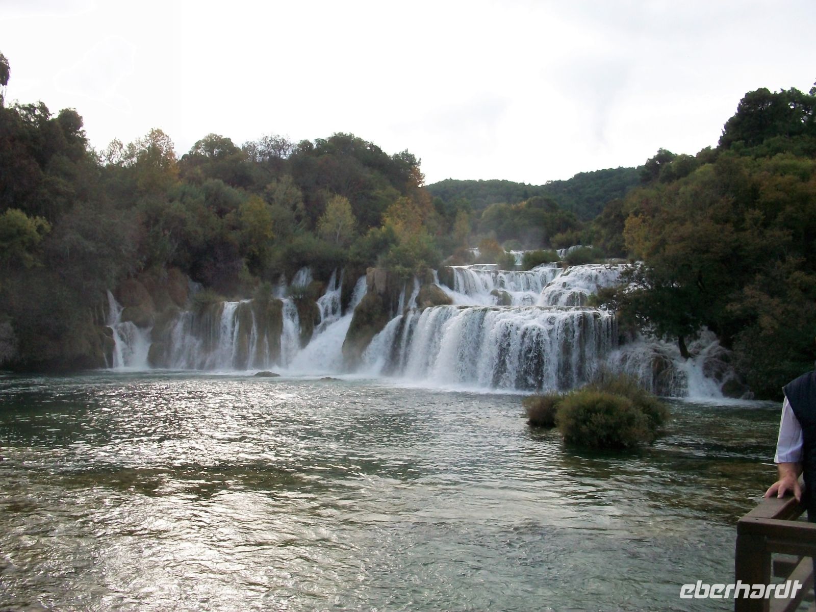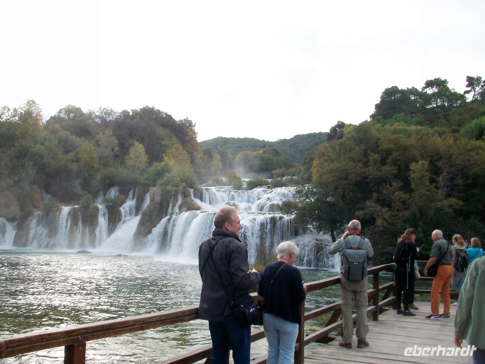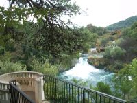 9.10.2022. Ein gutes Stück Weg liegt heute vor uns. Doch zunächst geht es zu einem weiteren Naturwunder unseres Gastlandes; auch hier tummelten sich Karl Mays Indianer: Es sind die Wasserfälle der Krka. Wir dringen von oben vor; eine Serpentinenstraße führt hinab und wir genießen schon bei dieser Busfahrt einmalige Ausblicke auf eine wunderschöne Fluss- und Seenlandschaft. Unten angelangt geht es zu Fuß weiter und schon bald dringt Rauschen an unsere Ohren. Vorbei an den Mühlsteinen gelangen wir auf die hölzernen Wege und können hier einmalige Impressionen genießen. Überall rauscht Wasser, Strudel bildend, über zahlreiche Kaskaden und wir sind mittendrin. Als wir unten an der Brücke anlangen, überwältigt der Blick zum Skradinski Buk, jener mächtigen Wasserfall welcher uns in mehreren Kaskaden schäumendes Wasser entgegensendet.