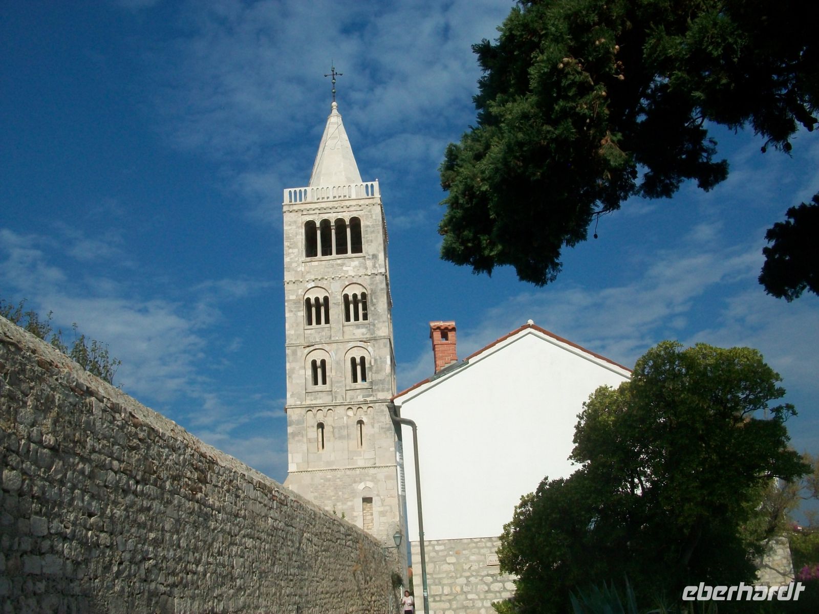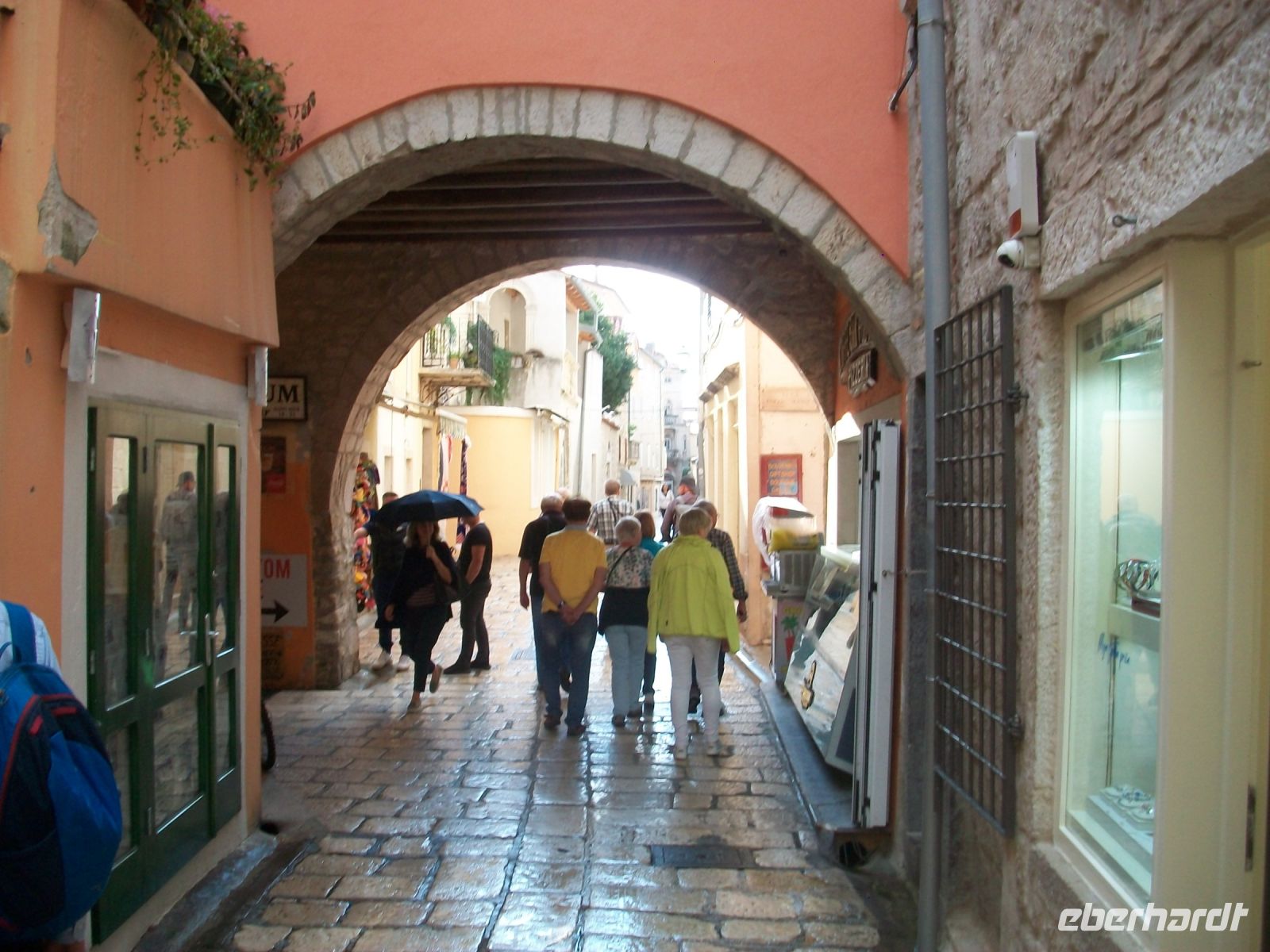10.10.2022. Während uns das Frühstück im Hotelrestaurant mundet, schweift der Blick über den Hafen immer wieder nach gegenüber. Die prächtige Stadtsilhouette mit den vier Kirchtürmen wird dezent von der Morgensonne bestrahlt; Möwen kreisen über dem Wasser der kleinen Bucht und wir rüsten uns um jenen besonderen Ort an diesem Vormittag zu besuchen: Rab. Als wir auf dem Weg in Richtung dieser schönen Altstadt sind, scheint die Sonne aber zu gleicher Zeit öffnet Petrus seine Schleusen und bremst unseren Tatendrang zunächst aus. Doch das ist bald vorbei und somit können wir in die Hauptgasse parallel des Wassers eintauchen. Auch hier glänzt der Fußweg; die verlegten Kalksteine wirken wie lackiert und unsere Tour geht entlang der alten Häuser mit Boutiquen und Restaurants bald zur oberen Gasse. Am Freiheitsplatz angelangt können wir die gegenüberliegende Inselspitze sehen, das Wasser der Adria ist leicht gekräuselt.