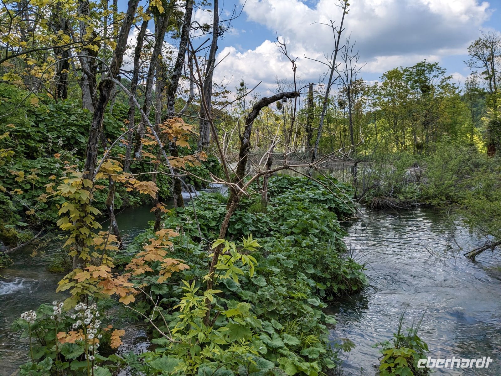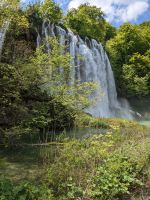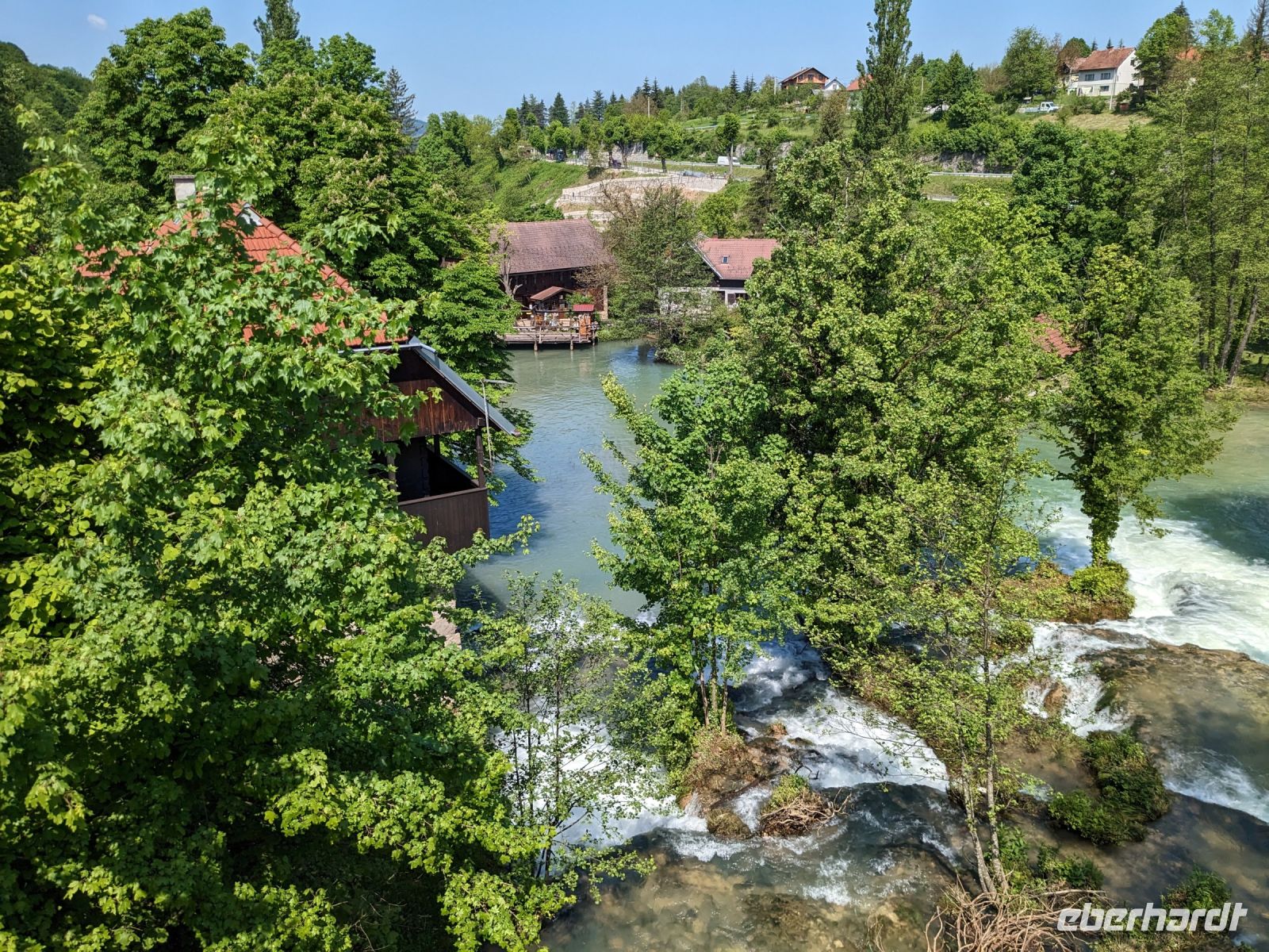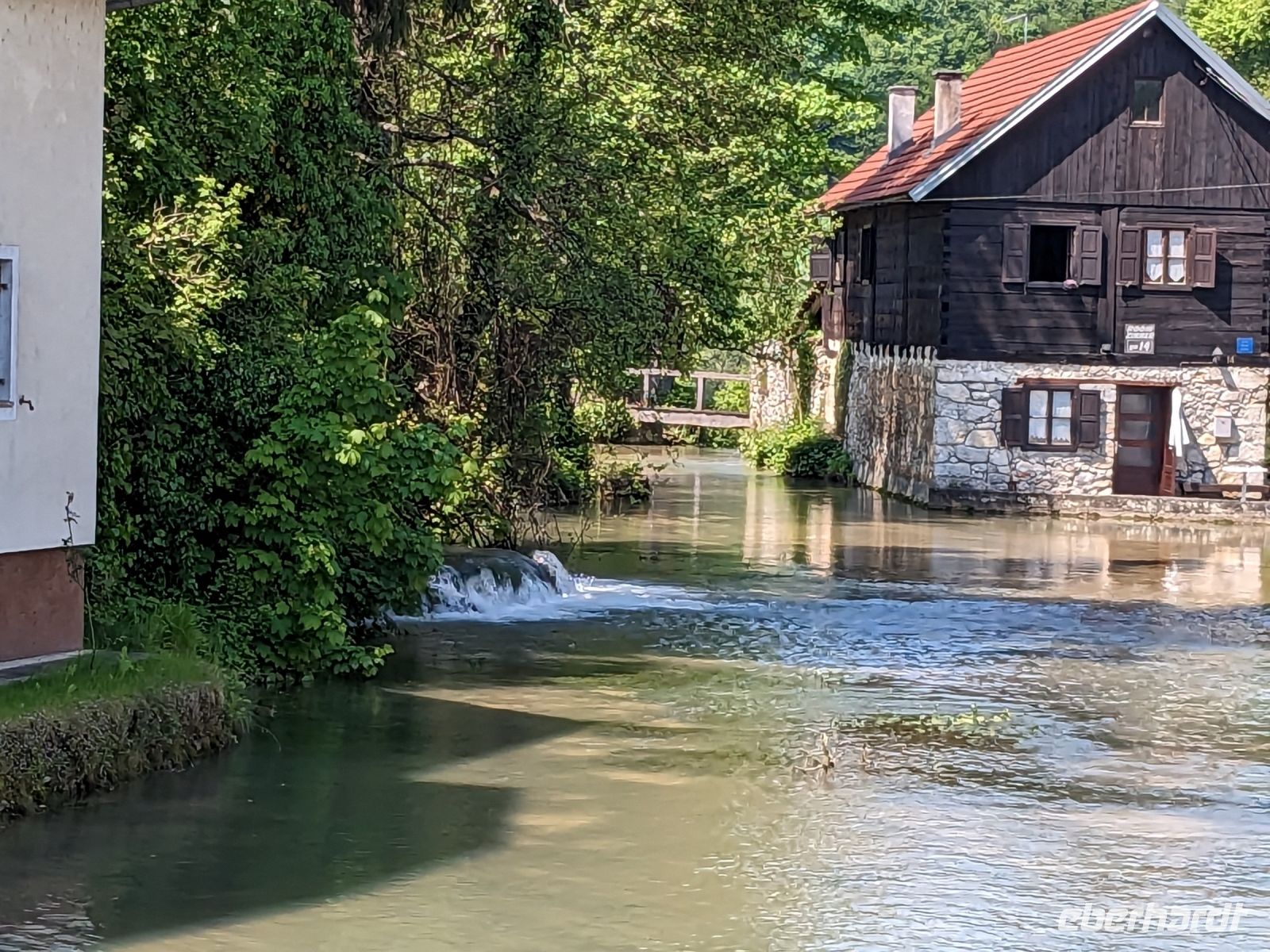 Unser heutiges Ziel waren die schon seit 979 zum UNESCO-Weltnaturerber zählenden Plitvicer Seen. Sie sind gut zwei Busstunden von der kroatischen Hauptstadt Zagreb entfernt und so hatten wir unterwegs noch Zeit für einen kleinen Zwischenstopp: in einem Vorort der Kleinstadt Slunj vereinigt sich das Flüsschen Slunjcica, hier in viele kleine Arme geteilt, mit der größeren Korana. Rastoke, wie diese Ortschaft genannt wird, geht vom Namen her sowohl auf die Flussverzweigung wie auch auf das stark kalkhaltige Wasser zurück, dessen Ablagerungen immer neue kleine Barrieren und Flussläufe schaffen: Wie ein „Vorgeschmack“ auf das viel bekanntere aber ähnlich entstandene Plitvicer Seengebiet wirkt der Besuch in der malerischen Ortschaft mit ihren vielen Wassermühlen.