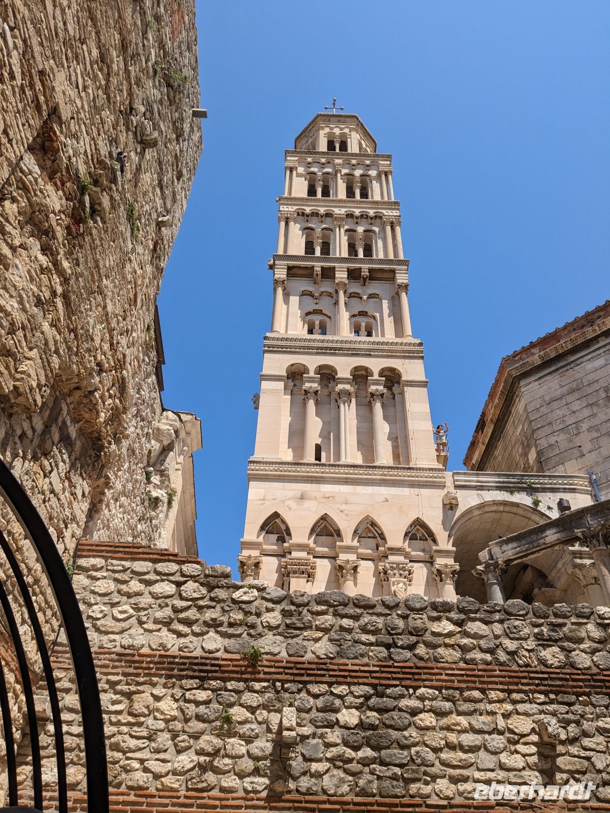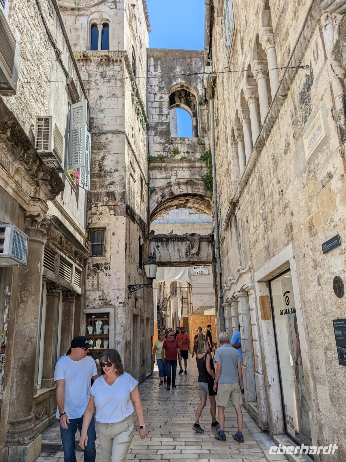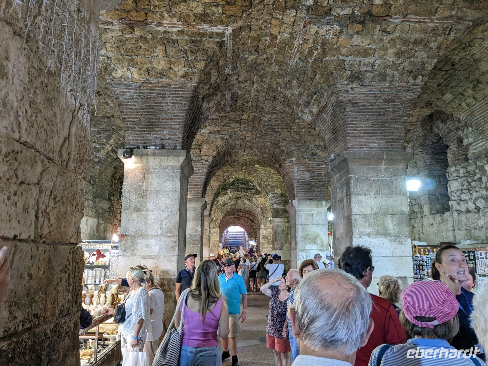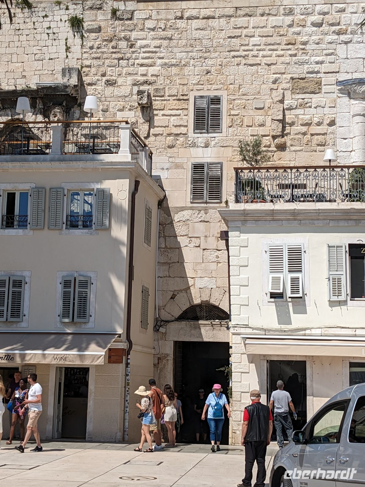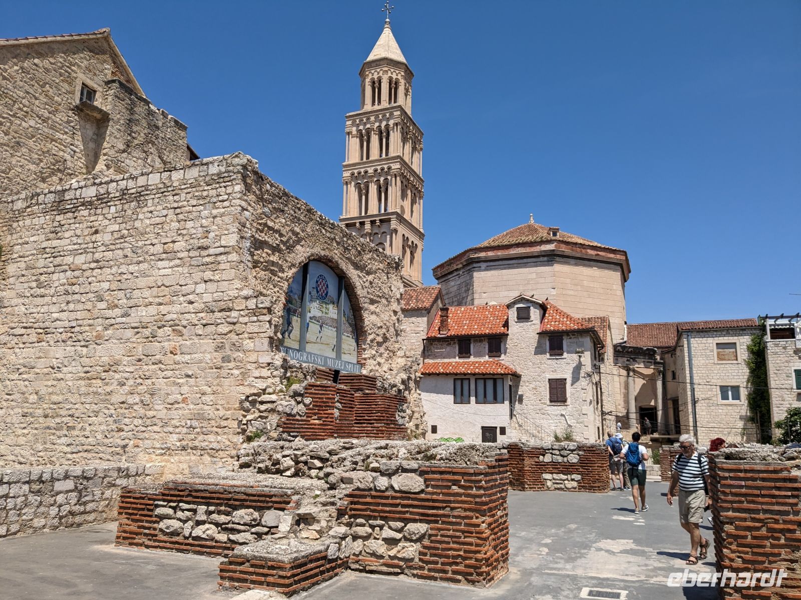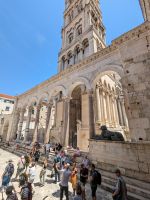 Wer hier an der „Riva“ aussteigt, bestaunt zunächst von der Uferpromenade aus eine hohe Mauer, teilweise mit eingelassenen halbrunden Säulen. Die Besonderheit der Altstadt von Split ist, dass man sie direkt in den riesigen alten Sommerpalast des römischen Kaisers Diokletian hineinbaute. Der dankte im Jahre 305 n. Chr. freiwillig ab und zog sich in diesen als Alterssitz gebauten Palast zurück. In den Jahren seiner Regierung, die von den letzten bedeutenden Verfolgungen des Christentums gekennzeichnet war, hatte er sich am Adriaufer nahe seiner Geburtsstadt Salona einen gewaltigen rechteckigen Palast von 180 mal 215 m Seitenlänge errichten lassen. Nach seinem Tod, während der Völkerwanderung und im Mittelalter benutzte man dann Teile des Palastes als Steinbruch und baute Wohnhäuser an die alten Mauern, so dass heute der alte Palast fast die gesamte Altstadt von Split beherbergt. Markanteste Details sind das Atrium, der ehemalige Palasthof, heute der kleine und mitunter für Freilichtaufführungen genutzte Hauptplatz der Altstadt und das ehemalige Mausoleum des Kaisers. Aus diesem antiken achteckigen Bauwerk, wurde im 7. Jahrhundert n. Chr. eine Kirche geweiht - heute als Kathedrale von Split eine der kleinsten Bischofskirchen der Welt. Ansonsten umschließen bis heute die. Mauern und Ecktürme des antiken Palastes die innere Altstadt und sogar die alten Tore in den vier Himmelsrichtungen haben noch immer ihre Funktion als Ein- und Ausgänge. Ein Höhepunkt unseres Rundganges war ein Ständchen eines Männerchores: in einem Kuppelraum mit besonders guter Akustik: vier zünftig und traditionell in Schwarz-Weiß gekleidete Herren erfreuten uns mit dem typischen dalmatinischen a-capella-Gesang. Dieser „Klapa“ genannte Gesang gehört übrigens seit der Jahrtausendwende zum immateriellen UNESCO-Weltkulturerbe! Außerhalb der alten Palastmauern besuchten wir noch den Narodni Trg den größten Platz in der Altstadt von Split, neben dem das „eiserne“ Stadttor aufragt und auf dem das alte Rathaus und einige Fassaden alter Adelspaläste zu sehen sind. Auch der gegenüber einem Stadttor stehenden Monumentalfigur des Nationalhelden Bischof Grgur von Nin, der sich sehr um die Entstehung des kroatischen Schrifttums verdient gemacht hatte, widmeten wir noch Aufmerksamkeit Nach der Stadtführung hatten wir Freizeit an der Hafenpromenade mit Muße für einen Bummel und einen Snack oder einen Kaffee.