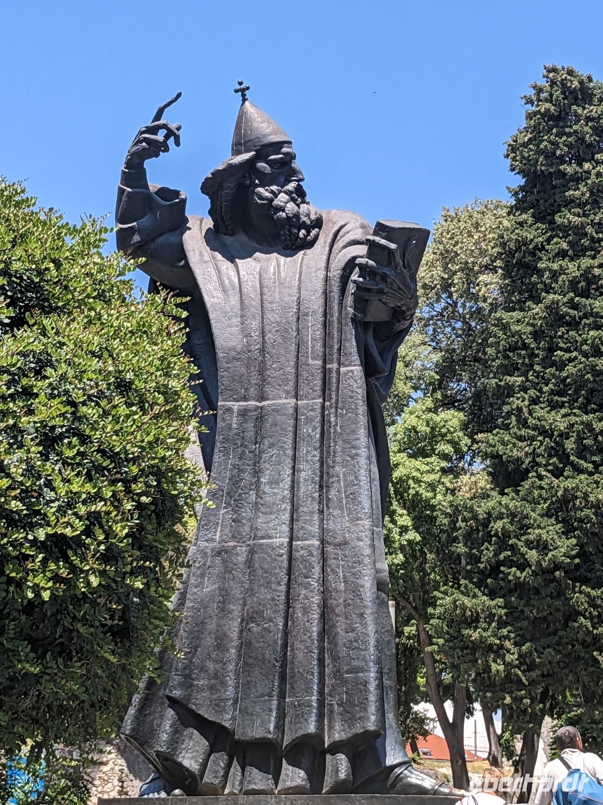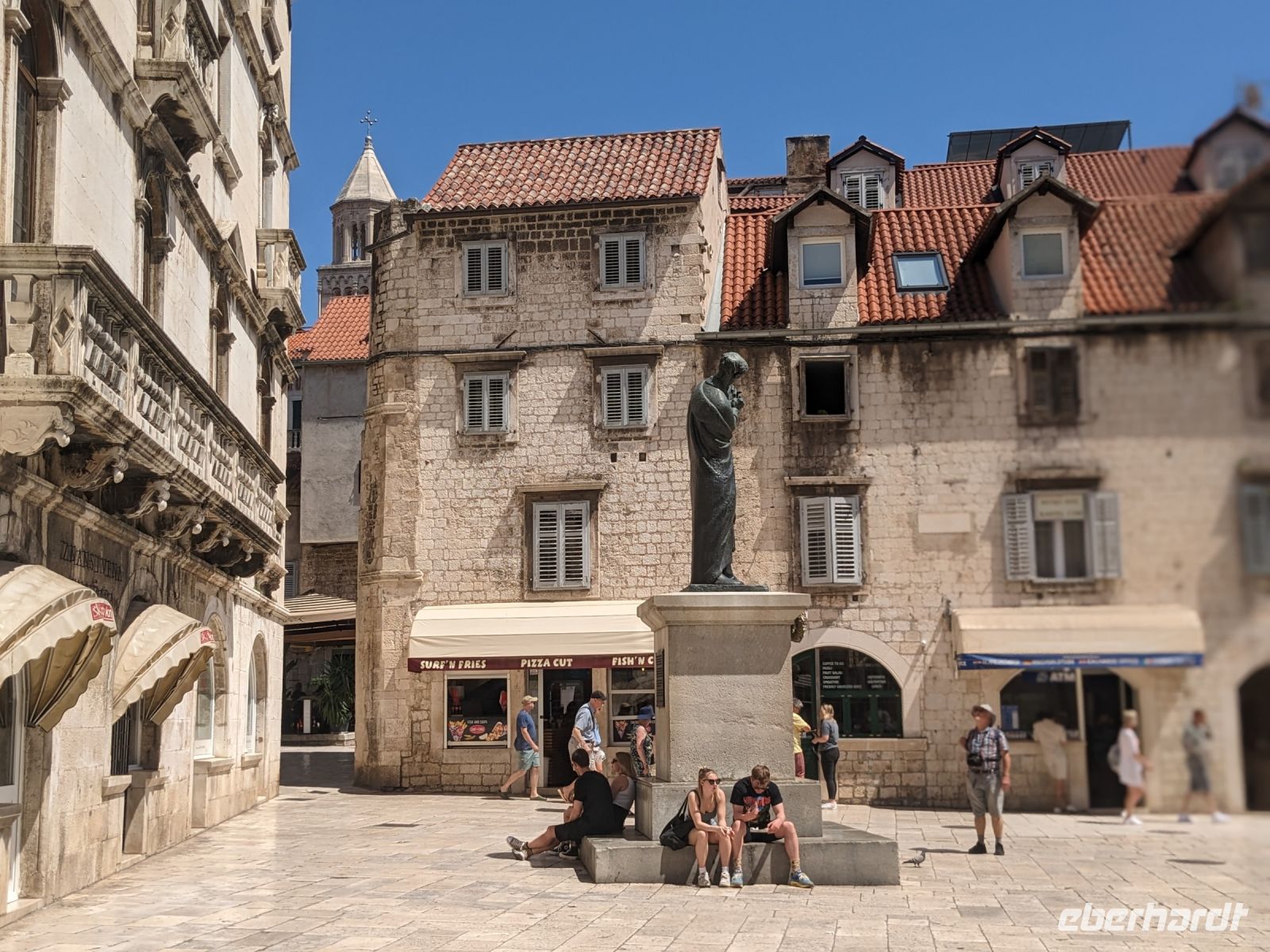Beim Herabsteigen zur Geschäfts- und Hauptgasse und zu den zentralen unteren Plätzen kamen wir an der Statue eines legendären, wichtigen Einwohners der Stadt vorbei. Der Steinmetz Marino musste einst als bekennender Christ vor der Verfolgung durch den Kaiser Diokletian – dessen Palast wir in Split gesehen hatten – flüchten und begründete in Italien auf dem Monte Titano im Jahr 301 eine kleine Stadt. Aus der erwuchs eine winzige Republik, die nach ihm benannt wurde und bis heute existiert: San Marino.