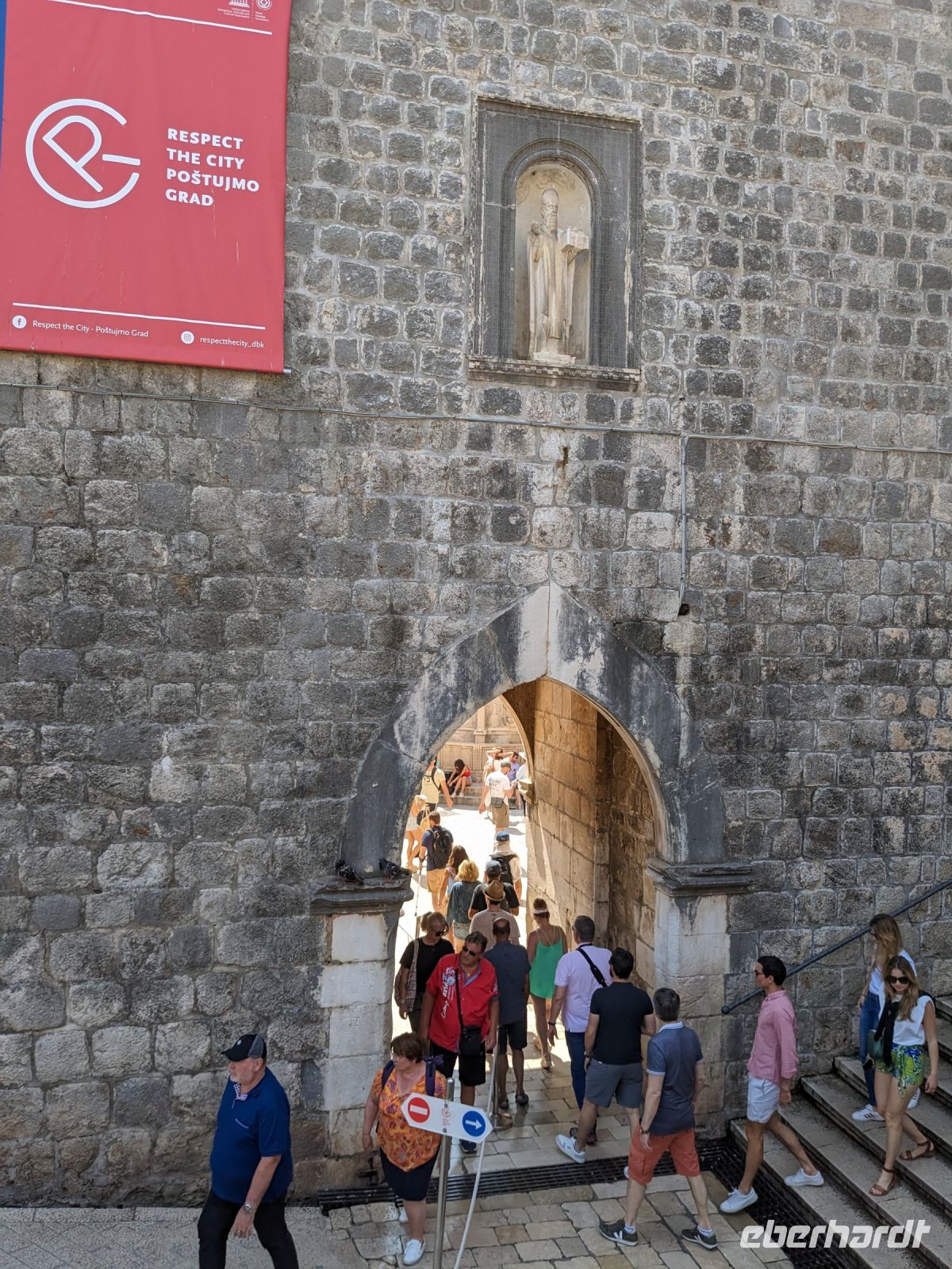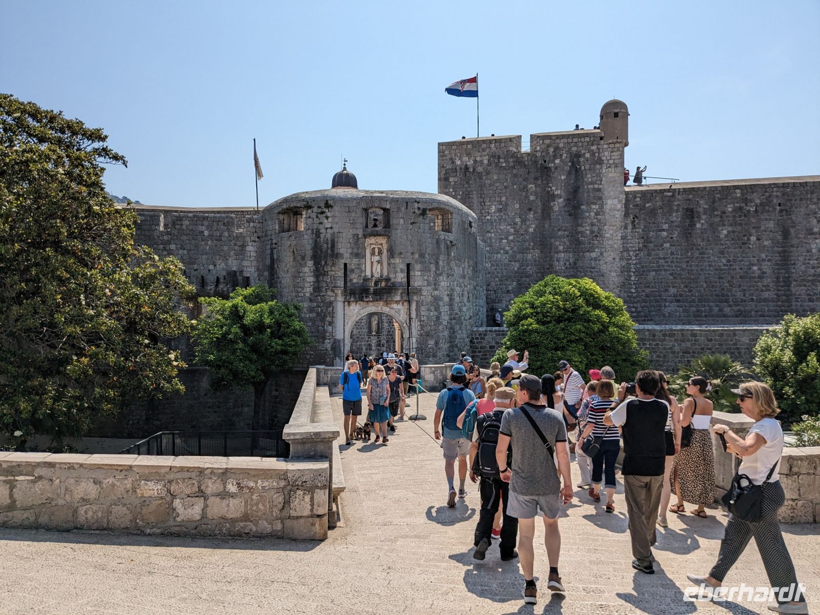 Heute hatte unser Busfahrer Pavel frei, denn wir fuhren mit dem Linienbus vom Hotel in die Altstadt von Dubrovnik. Wie viele andere bedeutende Stätten gehört sie ebenfalls schon seit 1979 zum UNESCO-Weltkulturerbe. Einst war sie vom 14. Jh. an als „Ragusa“ eine der sieben unabhängigen Seerepubliken des Mittelmeeres, bevor 1797 der französische Feldherr – damals noch nicht selbst ernannter Kaiser – Napoleon die drei verbliebenen Seerepubliken Genua, Venedig und Ragusa auflöste. Über Dubrovnik lässt sich vieles erzählen – einiges davon hörten wir auch von Indira, unserer charmanten Stadtführerin. Berühmte Schriftsteller wie James Joyce oder Jules Verne waren von Ragusa-Dubrovnik bezaubert – ersterer nannte den Ort „Paradies auf Erden“ und letzterer ließ einen Teil seines Romans „Mathias Sandorf“ hier spielen. Als einmalig erhaltenes Ensemble von Gebäuden diente Dubrovnik als Drehort mehrerer Episoden der HBO-Serie „Game of Thrones“ und für Teile von „Star Wars Episode VIII“.