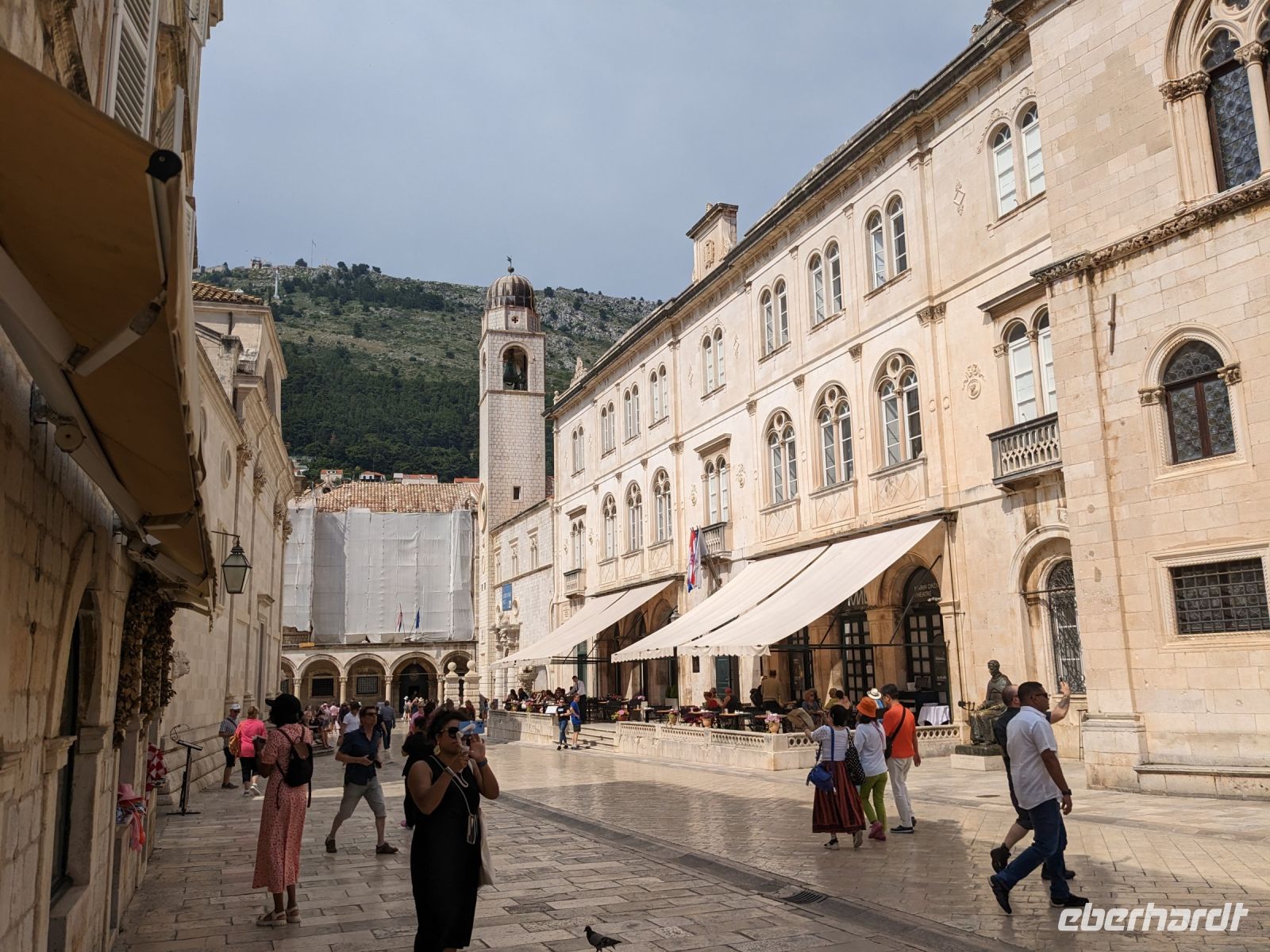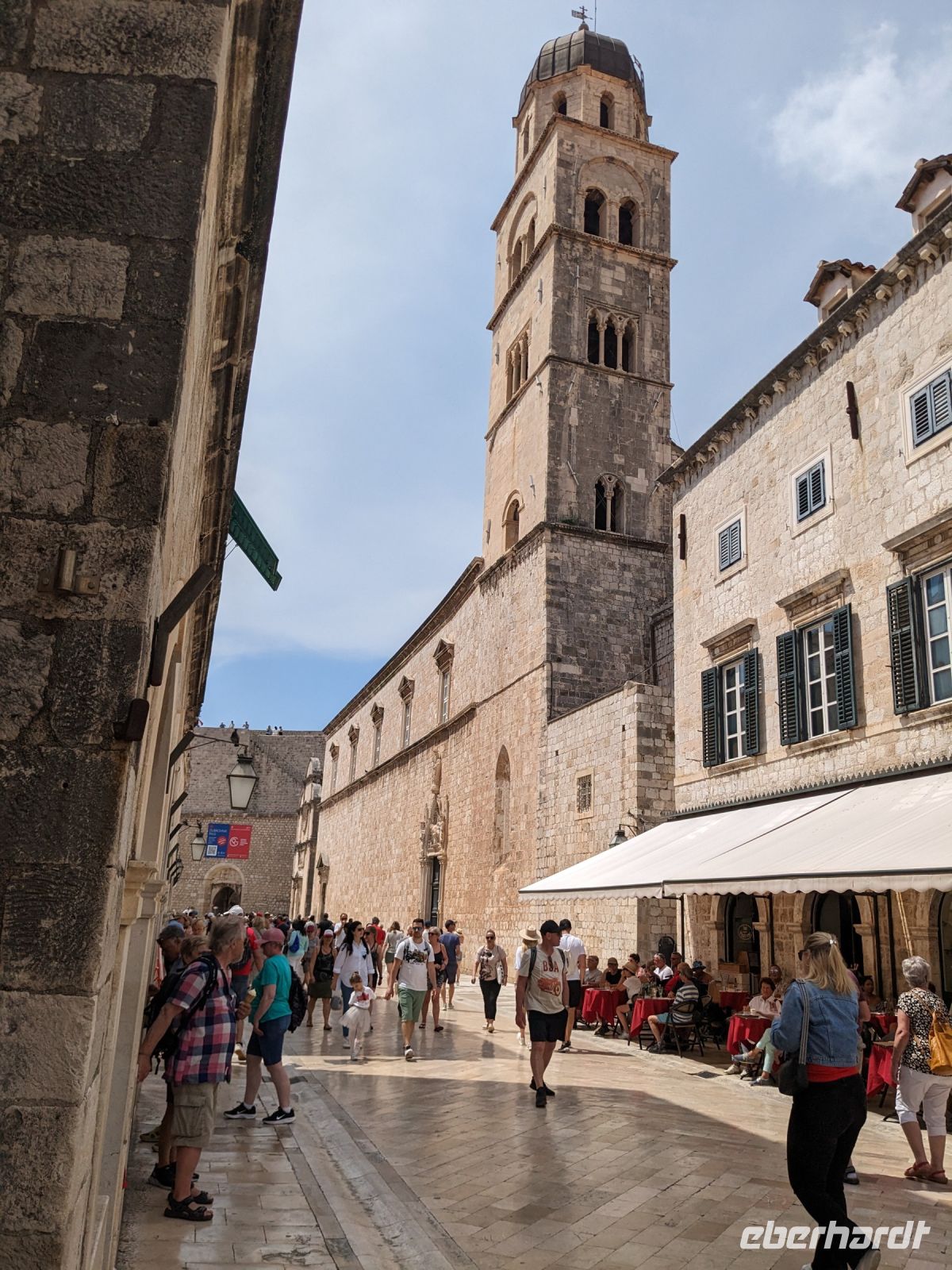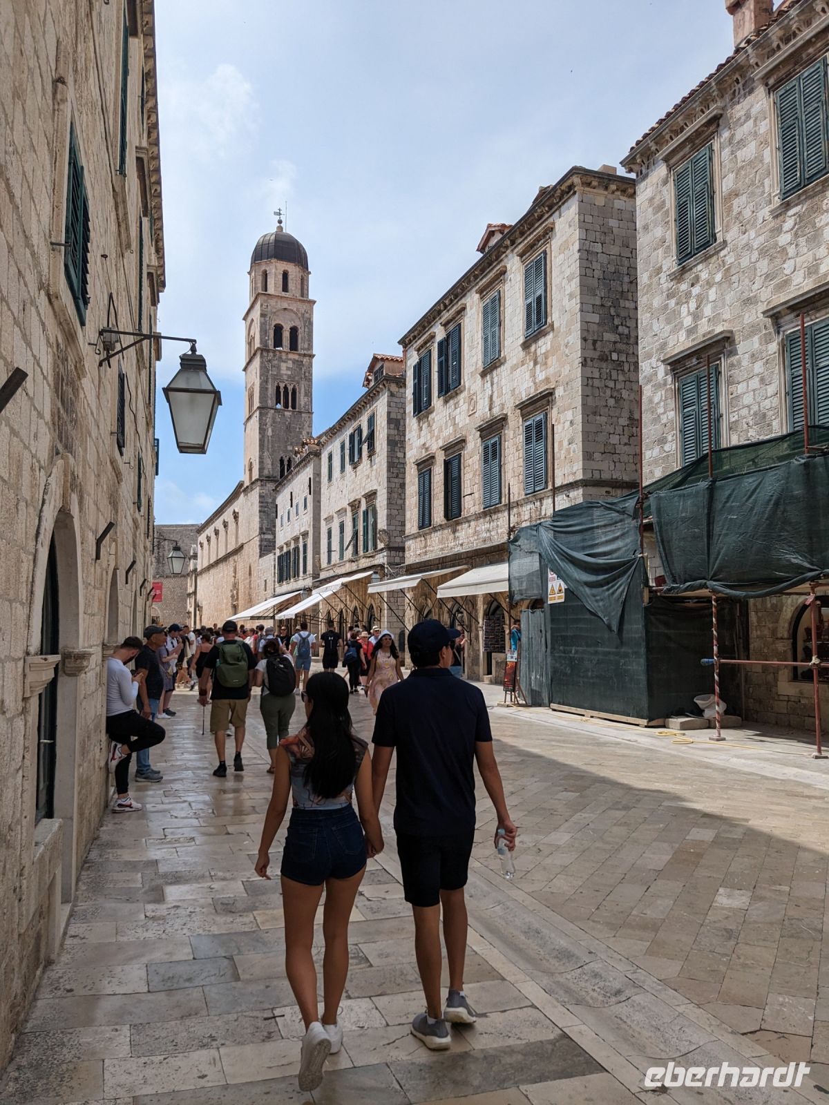 Die Altstadt ist noch komplett von ihrer historischen und in voller Länge begehbaren Wehrmauer umgeben und hat sich auf diese Art Jahrhunderte lang nie über die machtvollen Fortifikationen hinaus ausgedehnt. Dubrovniks Altstadtkern gilt als einer der wertvollsten Kunstschätze in Europa. Wir haben die „Perle an der Adria“ über die ehemalige Zugbrücke am Pile-Tor betreten und sind von dort gleich auf die breite die Fußgängerzone in der Altstadt, den Stradun, gelangt. Gegenüber dem Eingangstor befindet sich Dubrovniks größter öffentlicher Brunnen und daneben das alte Franziskanerkloster. Hier gibt es noch die historische Apotheke, eine der ältesten in Europa. Während unseres Stadtrundgangs entdeckten wir nicht nur die breite, von Geschäften gesäumte Fußgängerzone „Stradun“, sondern auch viele der schmalen Seitengassen mit zahlreichen bunten Geschäften, Souvenirläden und Gaststätten. Am Ende des Stradun stießen wir auf den Rektorenpalast, einst Herrschersitz der damaligen autonomen Republik Ragusa. Daneben liegt die Kathedrale „Maria Himmelfahrt“, heute zwar in einem Stilgemisch verschiedener Epochen, aber angeblich auf eine Kirchengründung des englischen Königs Richard Löwenherz zurückgehend, der sie als Dank für seine Genesung während des Kreuzzugs gestiftet haben soll.