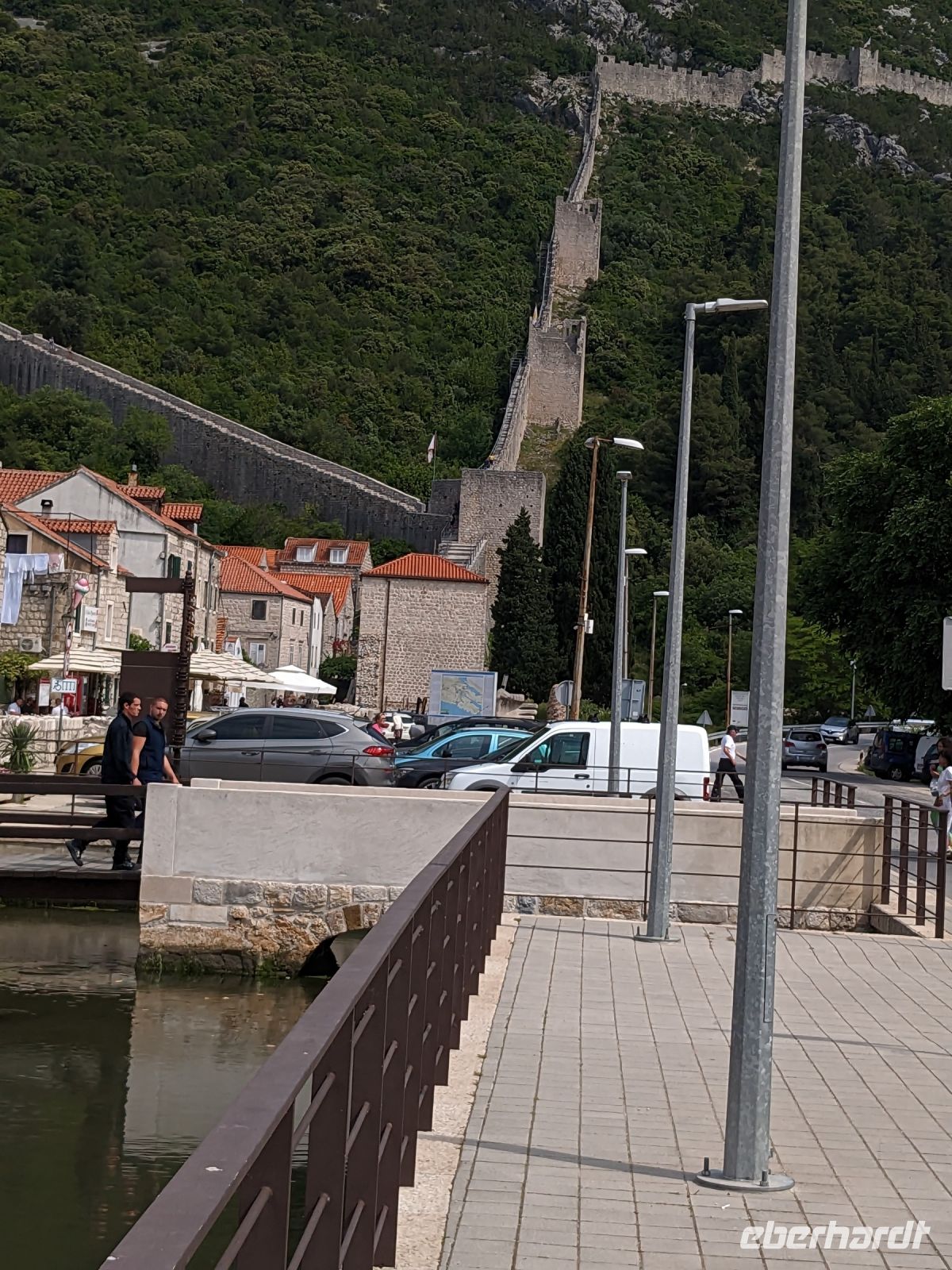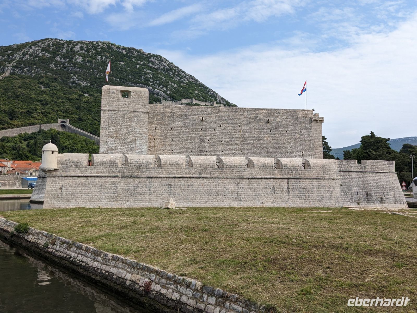 Heute mussten wir Abschied nehmen von Dubrovnik. Bei einem kleinen Umweg gelangten wir noch einmal an einen Ausblick, der eine Gesamtaufnahme der Altstadt ermöglichte. Danach ging es in Richtung unseres nächsten Höhepunktes, des Aufenthaltes auf der Insel Korcula. Dazu mussten wir in den Fährort Orebic, der am Ende der langgestreckten Halbinsel Pelješac liegt. Bei einem kleinen Umweg machten wir eine Fotopause an deren Anfang im Ort Ston, der einst die Grenzfestung der Seerepublik Ragusa-Dubrovnik war. Bis heute wird in der Bucht hier Muschel- und Austernzucht betrieben. Früher gewannen die Ragusaner hier auch ihr Salz und ein Teil der Salinen hat sich bis heute erhalten. Eine Wasserburg, bis heute trutzig und malerisch erhalten, schützte Salinen und Grenze und auch die mächtige Schutzmauer direkt im Berg zeugt davon, wie wichtig dieser Ort und das einst hier gewonnene „Weiße Gold“ für die Seerepublik war.