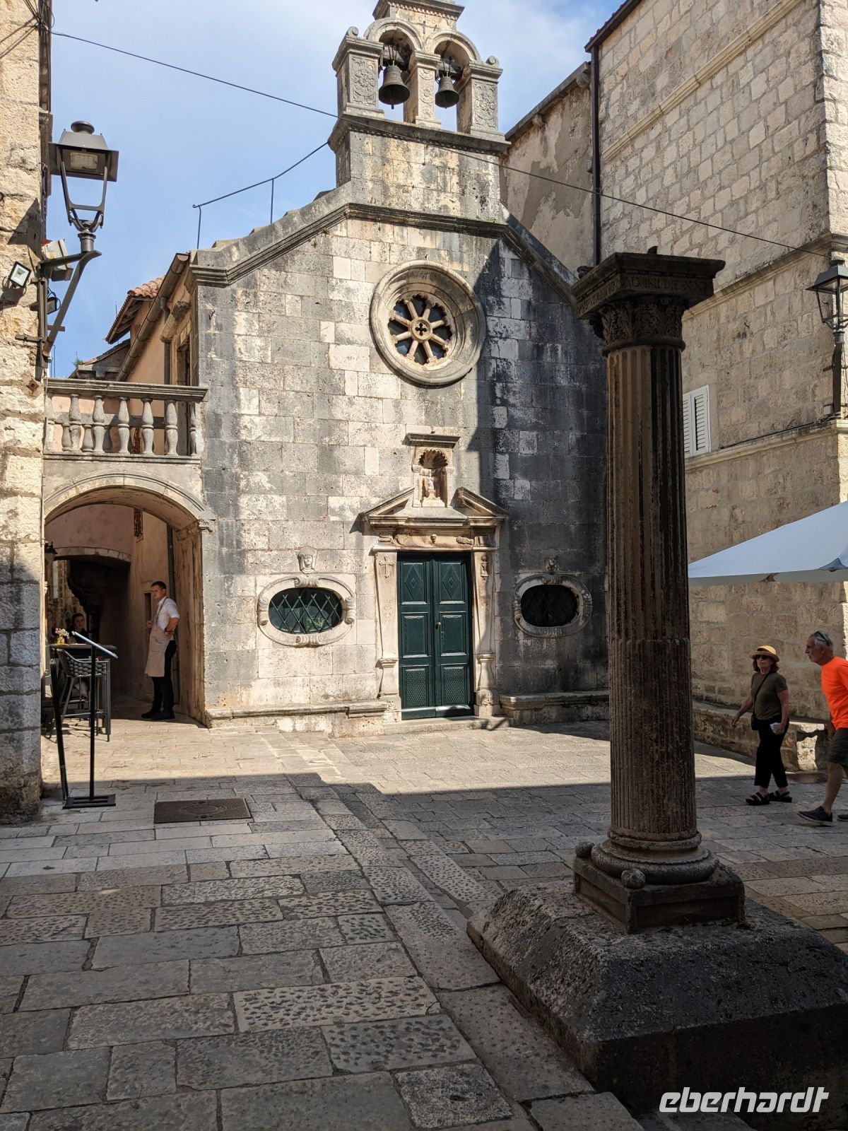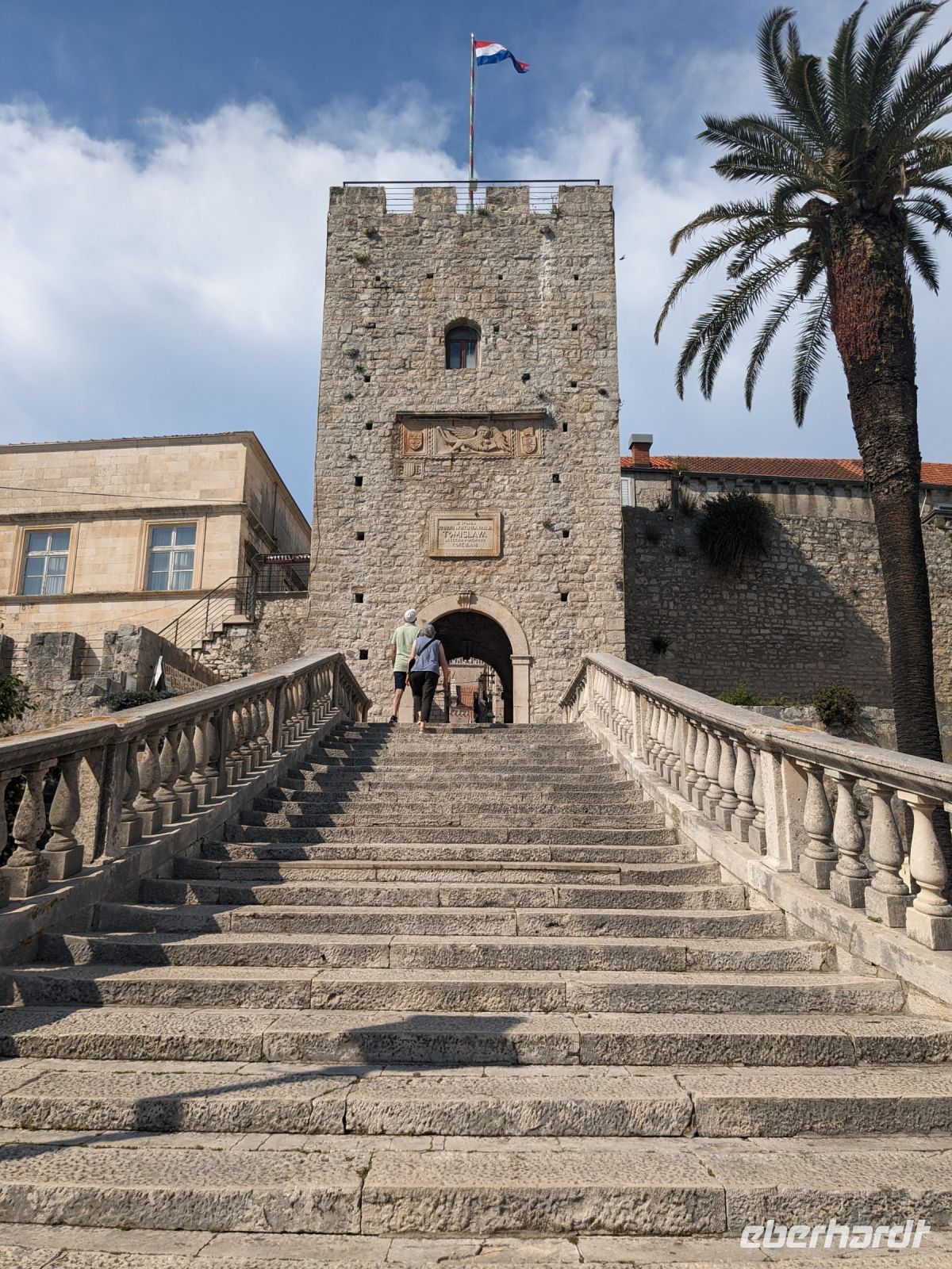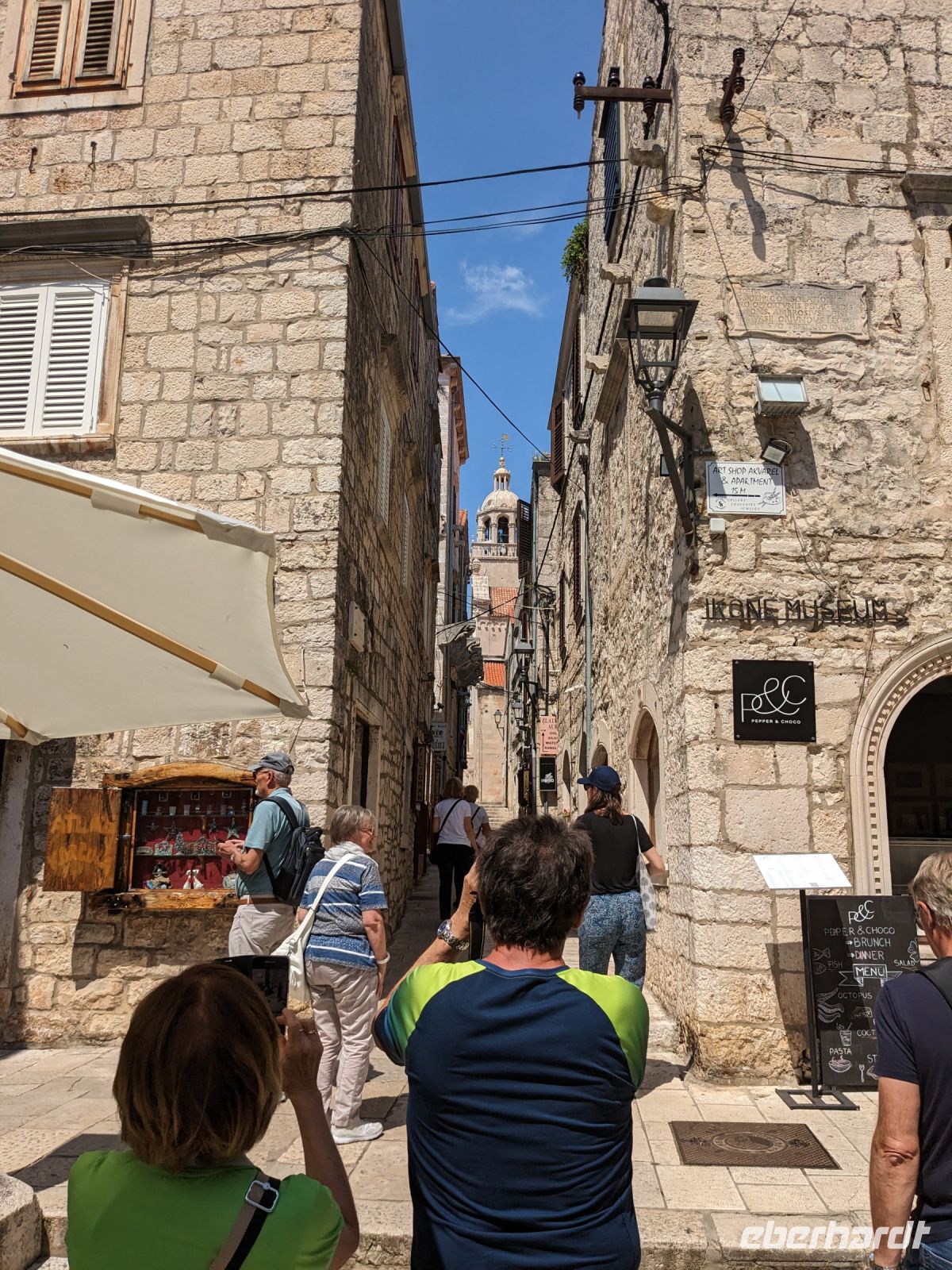 Unmittelbar hinter Ston ging es dann, vorbei an über die Halbinsel zum Ort Orebic. Hier zeigt sich noch eine recht unberührte Landschaft und vom alten Fähr- und Kapitänsort, zu Füßen des Sveti Ilija –Berges, hat man einen schönen Blick auf Stadt und Insel Korcula. Eine Fähre brachte uns zu unserem heutigen Ziel, der Stadt Korcula und Hauptort der gleichnamigen Insel. Mächtige Stadttürme, Befestigungen, enge Gassen und die Kathedrale des Heiligen Markus prägen das Stadtbild. Bei einer Stadtführung konnten wir das seit dem Mittelalter unveränderte Ambiente dieses wunderschöne Stadtensemble aus längst vergangenen Zeiten kennenlernen. Der Legende nach wurde hier Marco Polo geboren, der wohl berühmteste Weltreisende des Mittelalters. Hier begann sein turbulenter Lebensweg, an dessen Ende seine berühmten Reiseberichte über China und die Seidenstraße standen.