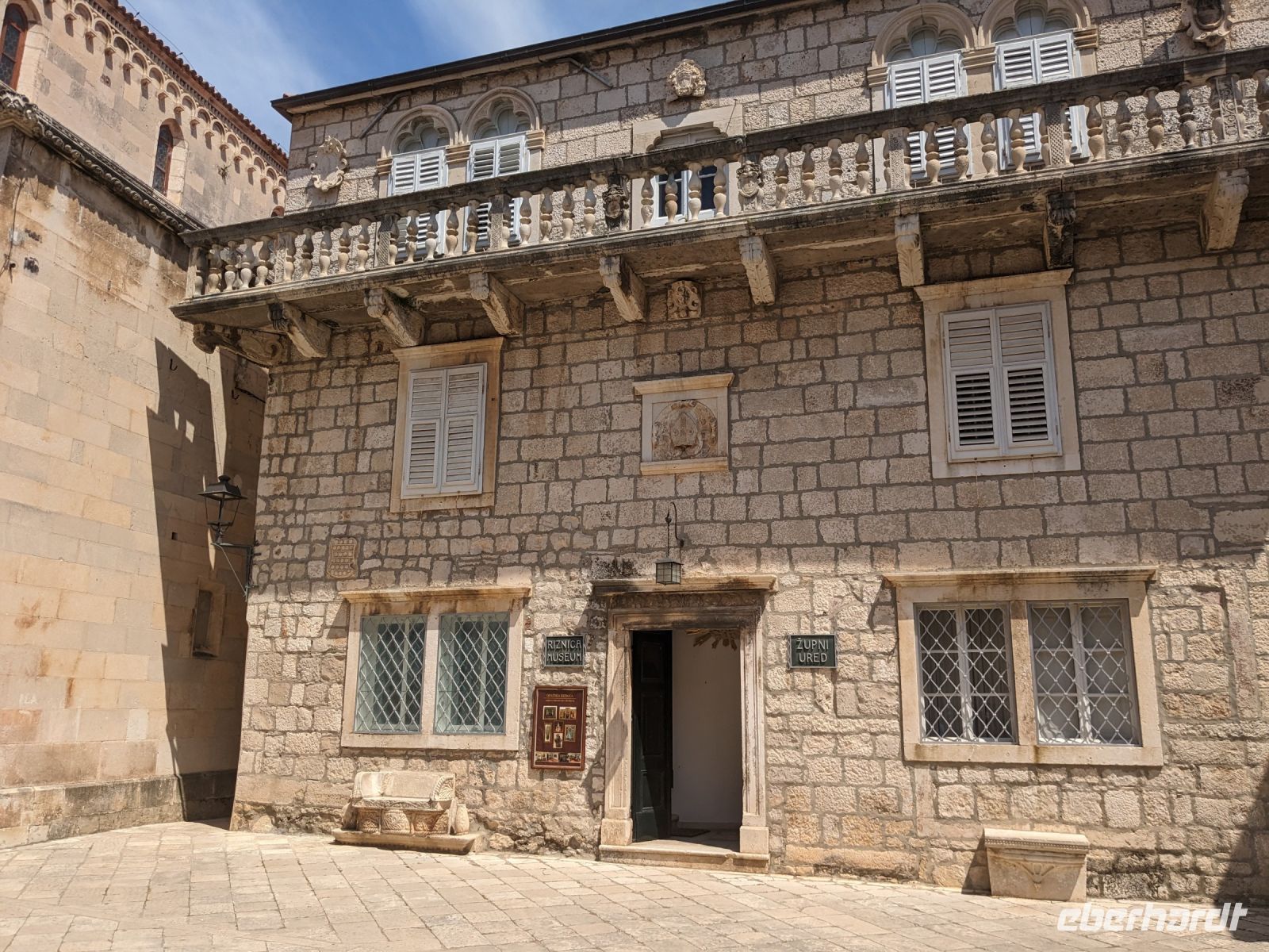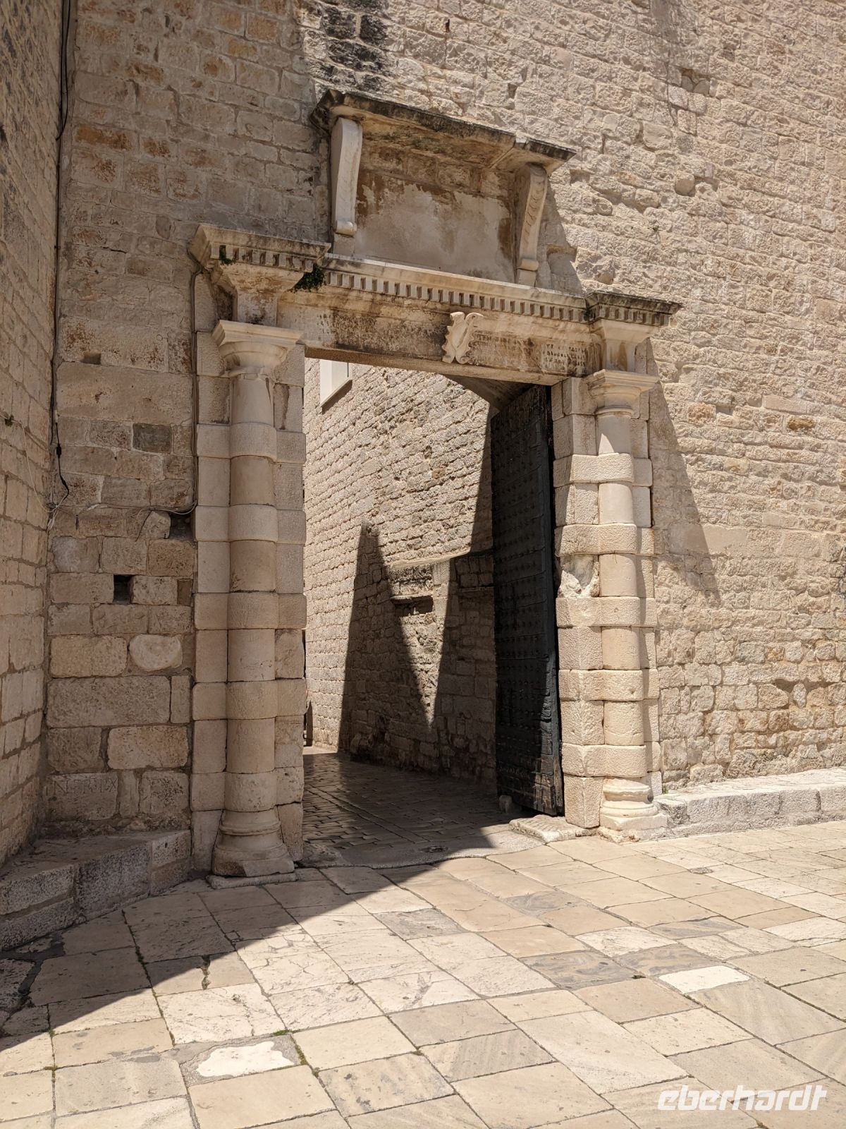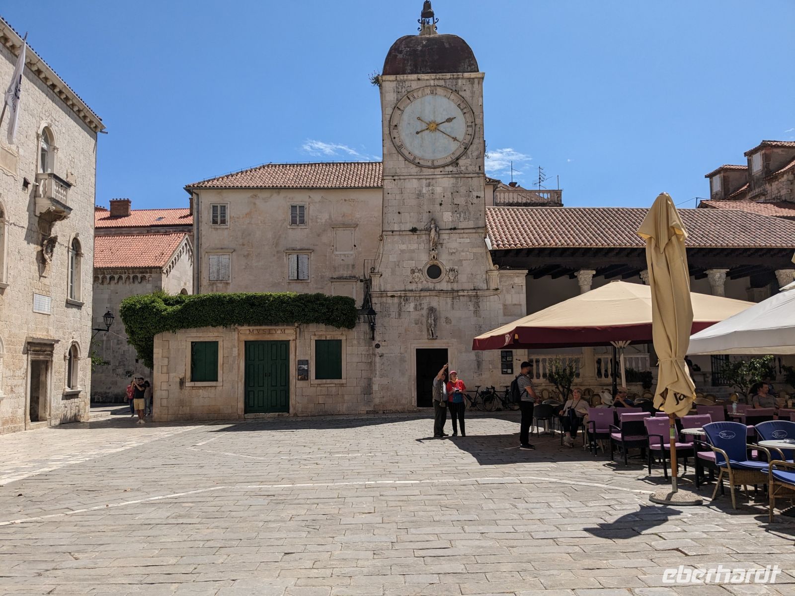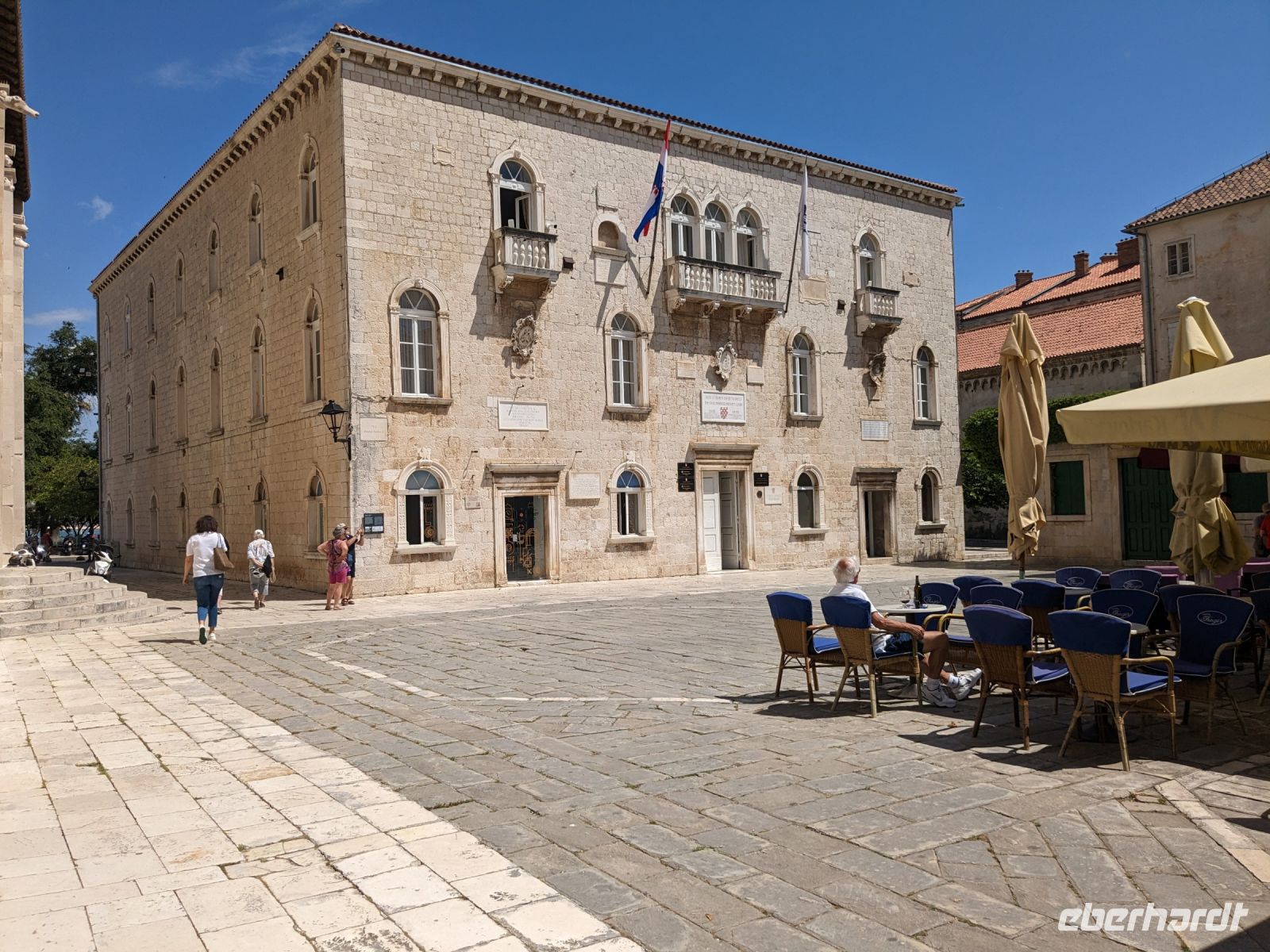 Schon seit 1997 zählt die auf einer Insel liegende Altstadt zum UNESCO-Weltkulturerbe. Obwohl die dalmatinische Küste an beeindruckenden Altstädten wahrhaftig nicht arm ist, zählt Trogir zu deren herausragenden Exemplaren. Angelegt auf einer kleinen Insel, die ein schmaler, wohl von Illyrern oder Römern künstlich angelegter flussartiger Kanal vom Festland trennt, präsentieren sich hier auf engstem Raum zahllose Sehenswürdigkeiten. Kenner und Kunsthistoriker behaupten, Trogirs Altstadt stelle einen der am besten erhaltenen romanisch-gotischen Stadtkerne im gesamten Mittelmeerraum dar. Dijana, die wir schon aus Split kannten, führte uns durch die Stadt. Nach ein paar Schritten am Kanalufer überquerten wir die Kanalbrücke und betraten die Altstadt durch das sogenannte Nordtor oder „Landtor“, das von der Statue des Stadtpatrons Ivan Ursini bewacht wird. Dass der Stadtkern autofrei sein musste, war leicht zu erkennen: kein Fahrzeug, Mopeds und die winzigen italienischen Dreirad-Lieferwagen vielleicht ausgenommen, würde durch die Tore passen und auch in den winzigen, verwinkelten Gassen, denen immer noch der Hauch des Mittelalters anhaftet, keinen Meter weit kommen. So waren wir schon nach kurzer Zeit auf dem Hauptplatz der Stadt, der vor einigen Jahren nach dem kürzlich heiliggesprochenen Papst Johannes Paul II. benannt wurde. Hier gab es Rathaus, Uhrturm, Stadtloggia und den alte Cipiko-Palast zu sehen. Letzterer ist ein Paradebeispiel eines spätgotischen Patrizier-Stadtwohnhauses aus dem 15. Jahrhundert. Alle Bauten – fast alle zwischen dem 12. und 16. Jh. errichtet - bilden hier in Trogir ein unvergleichliches Ensemble.
