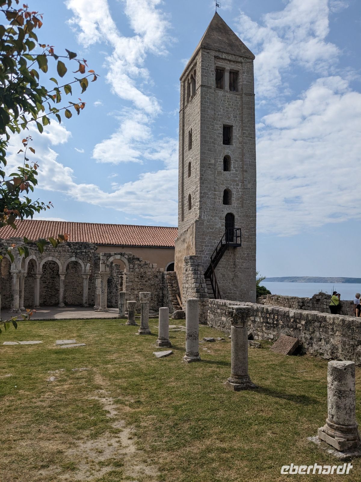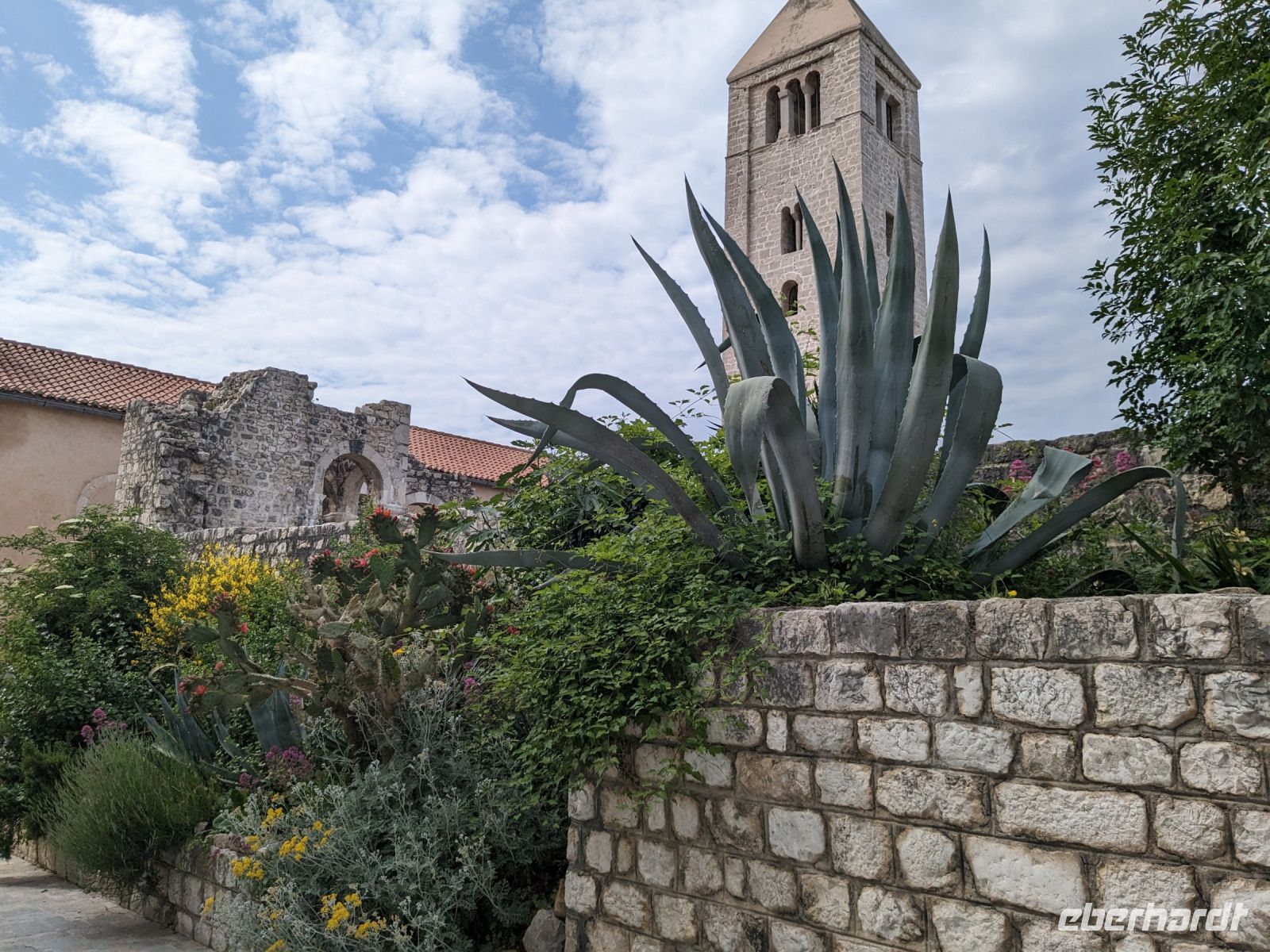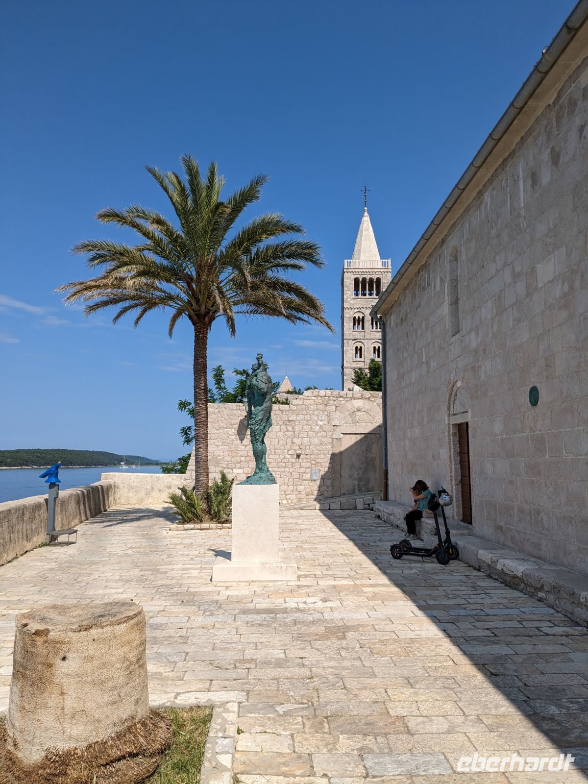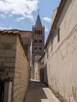 Der Vormittag war einer kleinen Inselrundfahrt gewidmet, deren Höhepunkt eine Stadtführung durch die Altstadt von Rab war. Die auf einer schmalen Halbinsel zusammengedrängte Altstadt verläuft sozusagen in zwei Ebenen und ist bekannt für ihre vier Kirchtürme, die die Silhouette der uralten kleinen Stadt dominieren. Den Ort entdeckt man am besten beim Durchschreiten seiner zwei Hauptgassen, die durch romantische Seitengassen und Treppengässchen verbunden sind. Auf der oberen Ebene befinden sich die alten Kirchen, deren vier Türme die Wahrzeichen und Landmarken Rabs bilden und die meisten alten Wohnhäuser, während die Geschäfte, Restaurants und andere touristische Anziehungspunkte auf der unteren Hauptgasse, den Plätzen und am Hafen zu finden sind. Wir erklommen die Höhe der Altstadt und sahen das alte Rab als erstes an. Seit der römische Kaiser Augustus den Ort zur Stadt erhob, siedeln hier Menschen in einem fruchtbaren und angenehmen Mikroklima, das Pflanzen aus verschiedenen Regionen gedeihen lässt. Seit der Ausbreitung des Christentums hatten sich in der Stadt zahlreiche Klöster und Kirchen etabliert, von denen verschiedene Reste und die vier markanten Glockentürme zeugen. Das Kloster Johannes des Evangelisten besitzt den ältesten, komplett romanischen Turm, die Marienkirche an der Spitze der Landzunge den vielleicht schönsten aus der Gotik. Von dem dort nahegelegenen Freiheitsplatz ergaben sich herrliche Blicke auf die Adria zu beiden Seiten der Stadt.