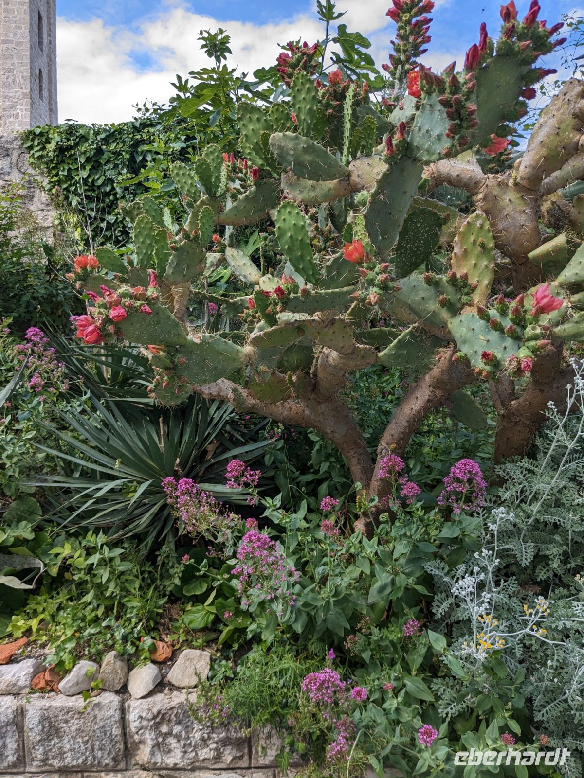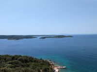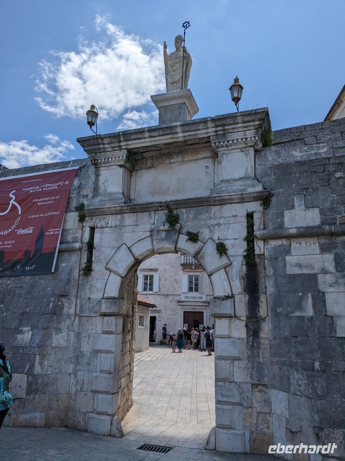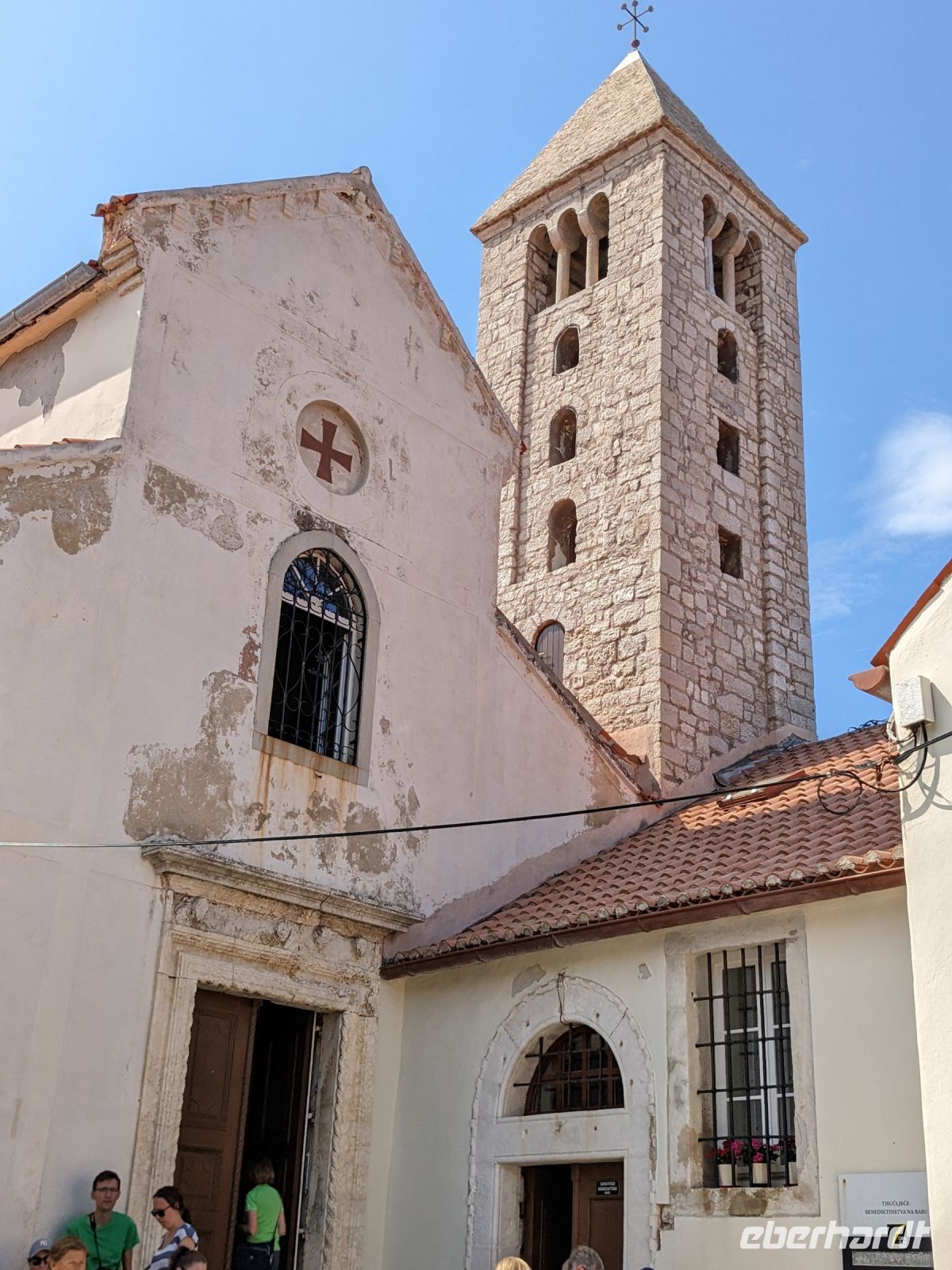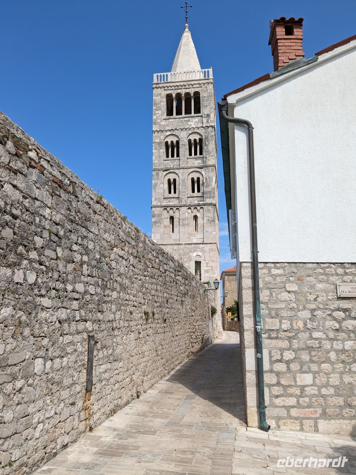 Der Vormittag war einer kleinen Inselrundfahrt gewidmet, deren Höhepunkt eine Stadtführung durch die Altstadt von Rab war. Die auf einer schmalen Halbinsel zusammengedrängte Altstadt verläuft sozusagen in zwei Ebenen und ist bekannt für ihre vier Kirchtürme, die die Silhouette der uralten kleinen Stadt dominieren. Den Ort entdeckt man am besten beim Durchschreiten seiner zwei Hauptgassen, die durch romantische Seitengassen und Treppengässchen verbunden sind. Auf der oberen Ebene befinden sich die alten Kirchen, deren vier Türme die Wahrzeichen und Landmarken Rabs bilden und die meisten alten Wohnhäuser, während die Geschäfte, Restaurants und andere touristische Anziehungspunkte auf der unteren Hauptgasse, den Plätzen und am Hafen zu finden sind. Wir erklommen die Höhe der Altstadt und sahen das alte Rab als erstes an. Seit der römische Kaiser Augustus den Ort zur Stadt erhob, siedeln hier Menschen in einem fruchtbaren und angenehmen Mikroklima, das Pflanzen aus verschiedenen Regionen gedeihen lässt. Seit der Ausbreitung des Christentums hatten sich in der Stadt zahlreiche Klöster und Kirchen etabliert, von denen verschiedene Reste und die vier markanten Glockentürme zeugen. Das Kloster Johannes des Evangelisten besitzt den ältesten, komplett romanischen Turm, die Marienkirche an der Spitze der Landzunge den vielleicht schönsten aus der Gotik. Von dem dort nahegelegenen Freiheitsplatz ergaben sich herrliche Blicke auf die Adria zu beiden Seiten der Stadt.