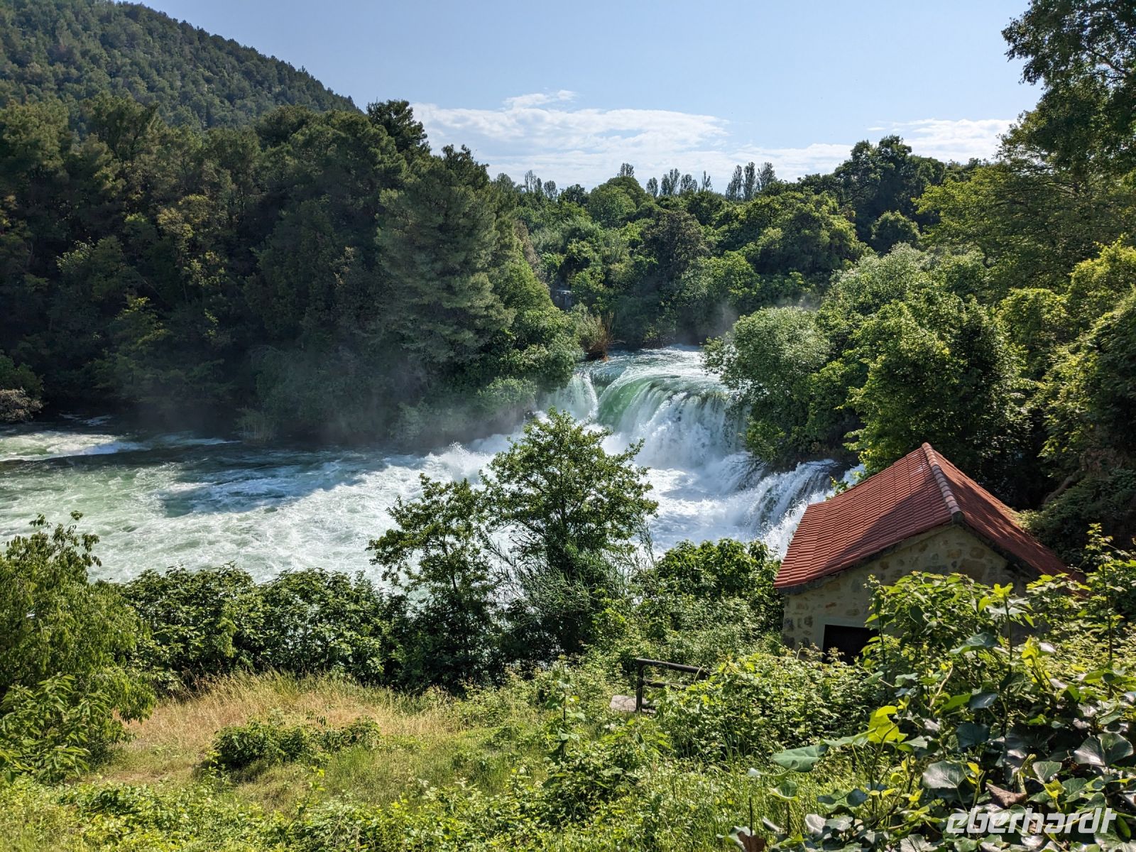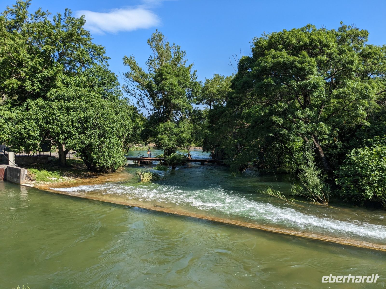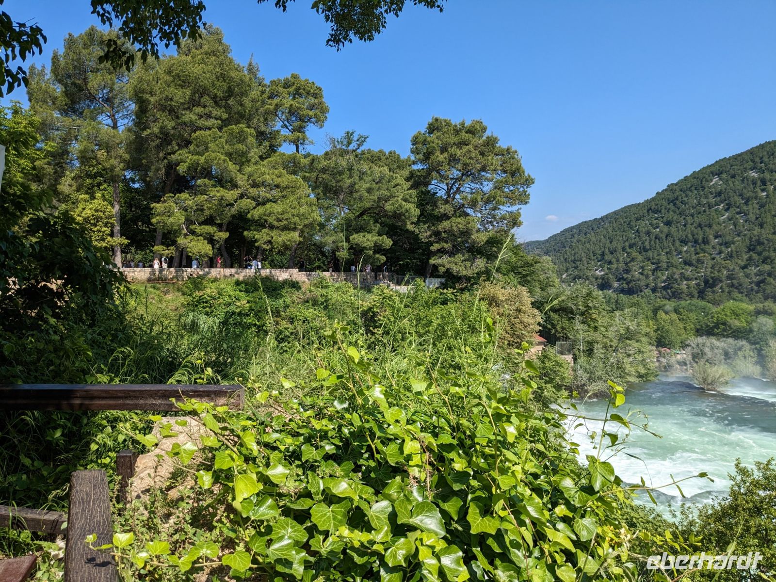 Die Krka, ein sehr markanter Fluss, der seine intensive grüne Farbe vom gelösten Kalk enthält, hat sich den Nationalpark sozusagen selbst geschaffen – ähnlich wie in Plitvice. Der Fluss ist mit knapp 73 km nicht sehr lang, hat dafür aber großes Gefälle, das sieben spektakuläre Wasserfälle enthält. An den beiden schönsten davon konnten wir entlang spazieren und dabei unter anderem eine der alten Wassermühlen ansehen, die früher am Fluss betrieben wurden. Der Hauptteil des Parks, in dem wir uns aufhielten, wurde auch während der Zeit der Donaumonarchie mehrfach von gekrönten Häuptern besucht, worauf eine angeblich für den Kaiser und seine Frau Sissy errichtete Kanzel, von der aus man den spektakulärsten Teil des Krka-Falles besehen kann, hinweist. Diese aufregende Landschaft hat ebenfalls durch die hier gedrehten Indianerfilme der „Winnetou“-Reihe nach Vorlagen von Karl May europaweite Bekanntheit erlangt. Nach unserem kurzen Spaziergang hatten wir noch genügend Zeit, uns umzusehen, bevor wir an der Bushaltestelle wieder von unserem Bus abgeholt wurden.