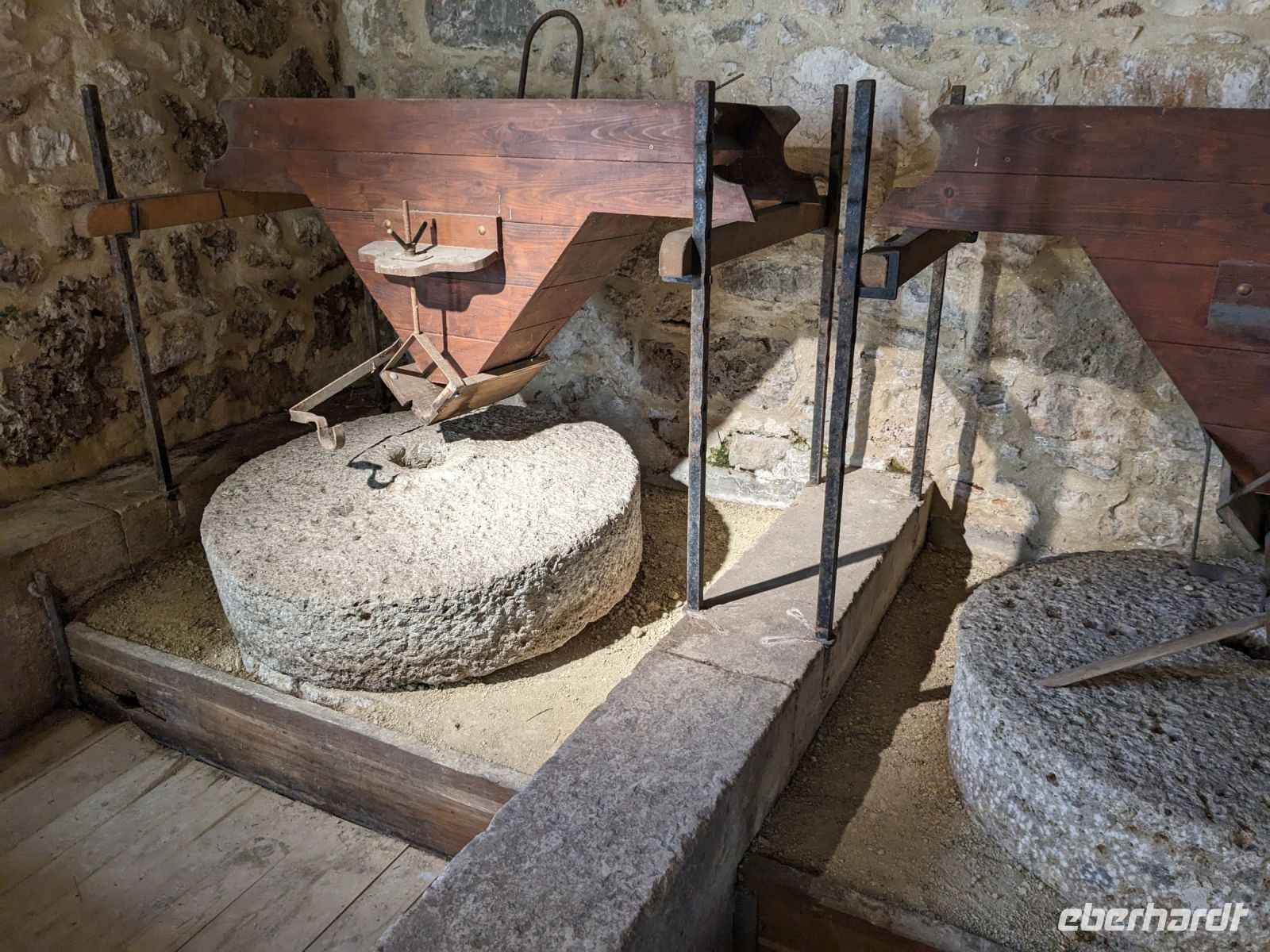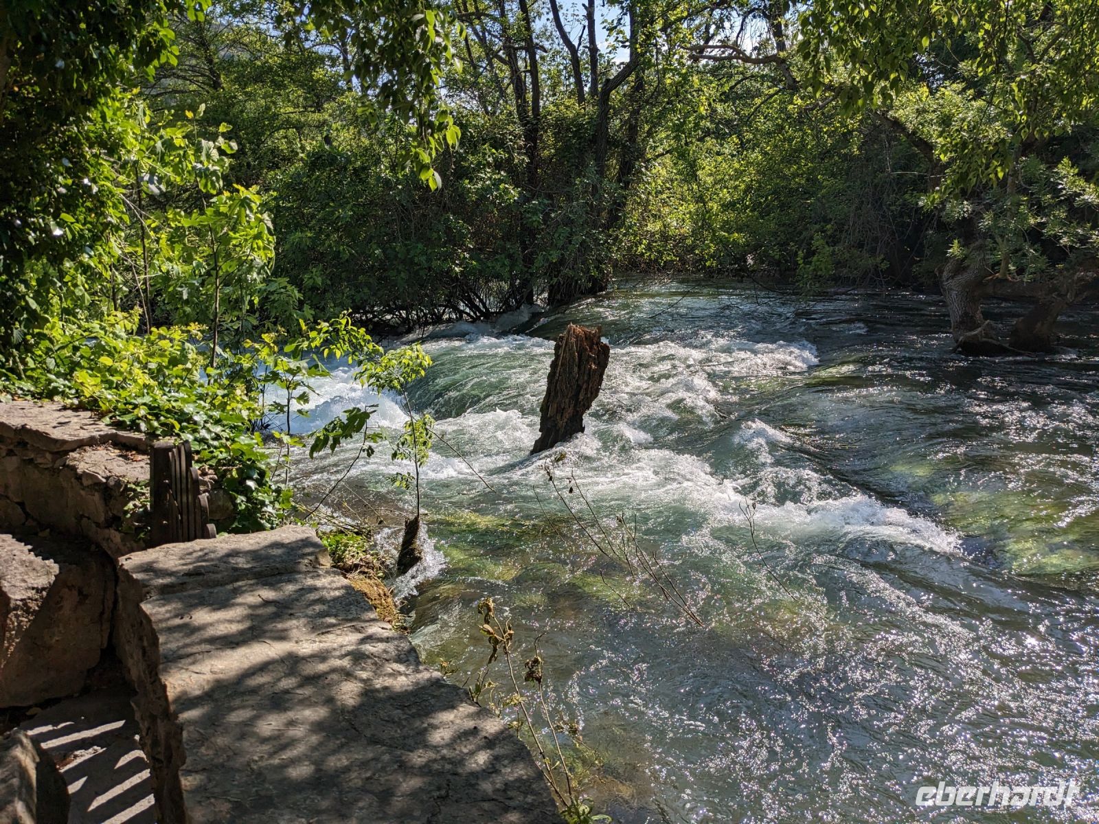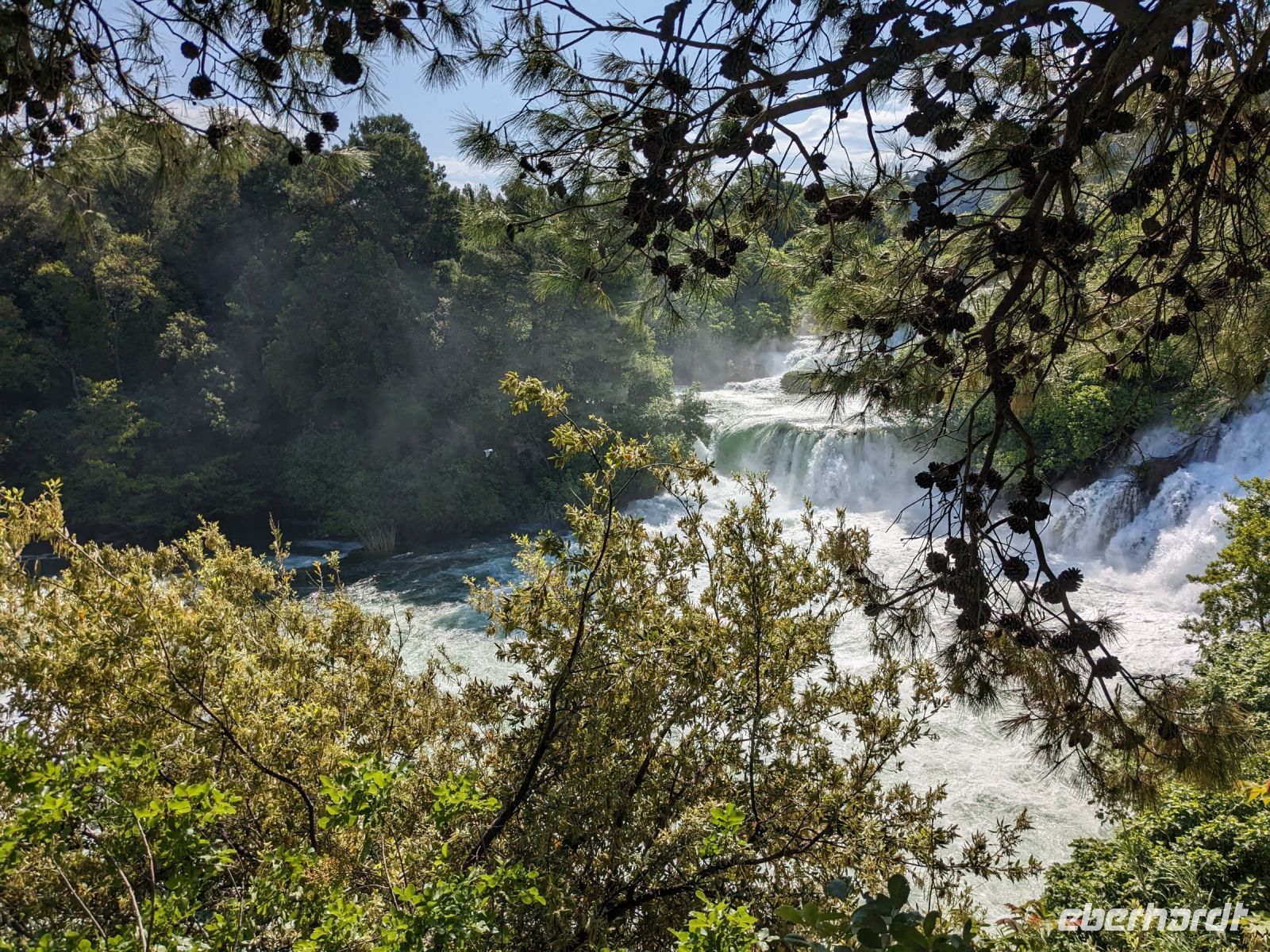 Die Krka, ein sehr markanter Fluss, der seine intensive grüne Farbe vom gelösten Kalk enthält, hat sich den Nationalpark sozusagen selbst geschaffen – ähnlich wie in Plitvice. Der Fluss ist mit knapp 73 km nicht sehr lang, hat dafür aber großes Gefälle, das sieben spektakuläre Wasserfälle enthält. An den beiden schönsten davon konnten wir entlang spazieren und dabei unter anderem eine der alten Wassermühlen ansehen, die früher am Fluss betrieben wurden. Der Hauptteil des Parks, in dem wir uns aufhielten, wurde auch während der Zeit der Donaumonarchie mehrfach von gekrönten Häuptern besucht, worauf eine angeblich für den Kaiser und seine Frau Sissy errichtete Kanzel, von der aus man den spektakulärsten Teil des Krka-Falles besehen kann, hinweist. Diese aufregende Landschaft hat ebenfalls durch die hier gedrehten Indianerfilme der „Winnetou“-Reihe nach Vorlagen von Karl May europaweite Bekanntheit erlangt. Nach unserem kurzen Spaziergang hatten wir noch genügend Zeit, uns umzusehen, bevor wir an der Bushaltestelle wieder von unserem Bus abgeholt wurden.