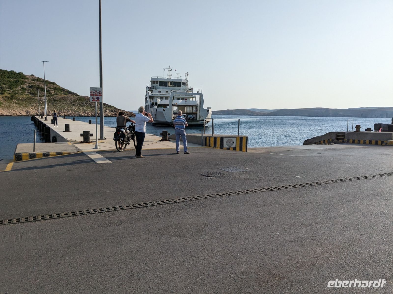 Unsere Stadtführerin Meri empfing uns gleich am Hafen am Busparkplatz, und sogleich begannen wir mit dem Stadtrundgang. Gar nicht weit vom Hafen, am Rande des antiken römischen Forums steht die Kathedrale der heiligen Anastasia, eine romanische Basilika aus dem 13. Jahrhundert. Am Ende der Kirche, wie in Erdbebengebieten typisch leicht vom Baukörper entfernt steht der zugehörige, wesentlich neuere Kampanile, der Glockenturm. Gleich danach beeindruckten uns am Hafen zwei moderne Kunstwerke: Der Architekt Nikola Bašic schuf 2005 am Hafen eine bisher einzigartige Meeresorgel, die allein durch Wellenbewegung sonderbare, angenehme Musik erzeugt, indem durch das Schwappen der Meereswellen Luft in verschiedene Orgelpfeifen gepresst wird, die in Röhren in der Hafenmauer eingelassen sind. Daneben hat derselbe Architekten drei Jahre später als „Begrüßung der Sonne“ eine Darstellung der Planeten des Sonnensystems in den richtigen Verhältnissen der Planetengröße und ihrer Umlaufbahnen erstellt. Dominiert von der „Sonne“ einem Kreis mit über 20 m Durchmesser aus 300 mehrschichtigen, begehbaren Glasplatten, fangen deren photovoltaische Elemente Sonnenlicht ein, speichern es und geben es nach Sonnenuntergang in bunten Lichtspielen wieder ab. Direkt als „Gegensatz“ zu dieser Moderne fanden wir uns kurz darauf in der Antike wieder – die erhaltenen Reste des gewaltigen römischen Forums bilden noch heute einen der größten Plätze in ganz Kroatien. Stolz des Stadtzentrums aber und eines der Wahrzeichen Zadars ist die Kirche des Heiligen Donat im historischen Zentrum. Die römisch-katholische Rundkirche stammt aus dem 9. Jahrhundert n.Chr. und gilt als repräsentativster kroatischer Bau aus altchristlicher Zeit. Auch hier in Zadar blieb nach dem Ende der Stadtführung Freizeit für eigene Erkundungen. Durch das venezianische „Hafentor kehrten wir dann zum Bus zurück, der uns weiter nach Norden brachte. Diesmal mussten wir die Küstenstraße N 8 nehmen, die „Jadranska Magistrala“. Nach einer kurzen Rast im kleinen Badeort Karlobag am Fuße des Velebit-Gebirges erreichten wir im Fährort Jablanac-Stinica die Abendfähre zur Insel Rab, auf der wir die zwei letzten Nächte in Kroatien verbringen würden.