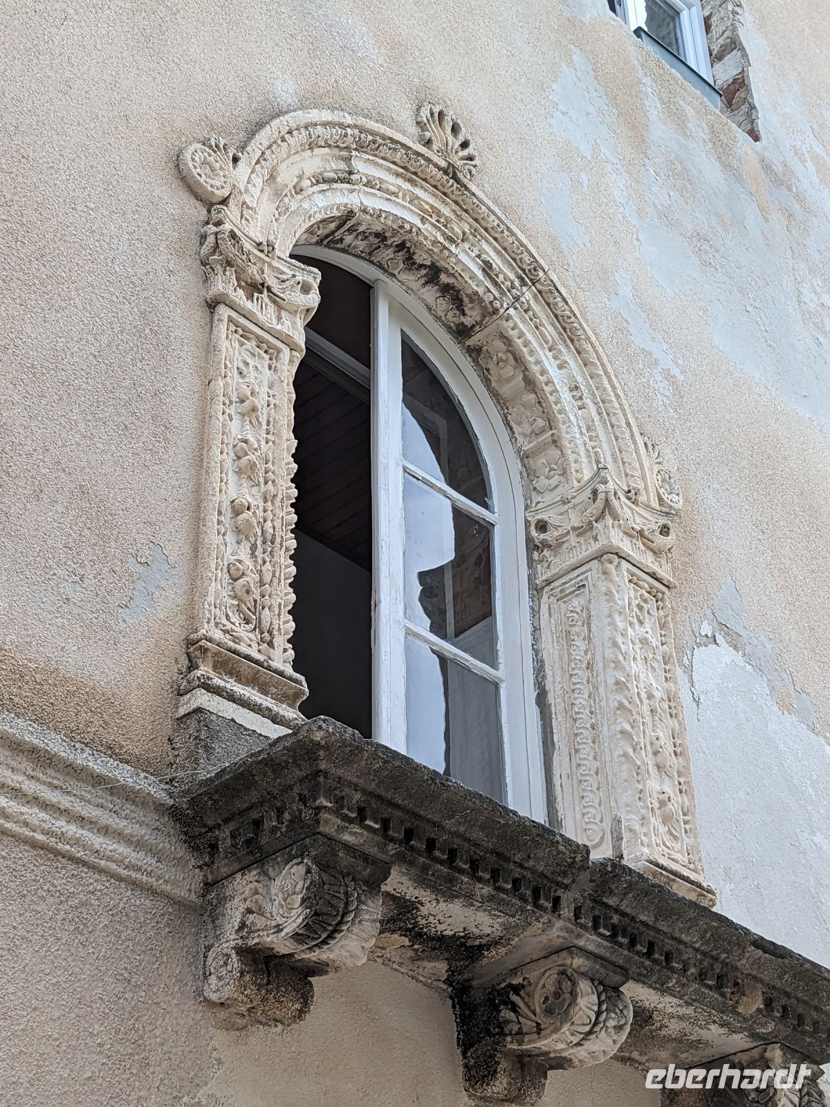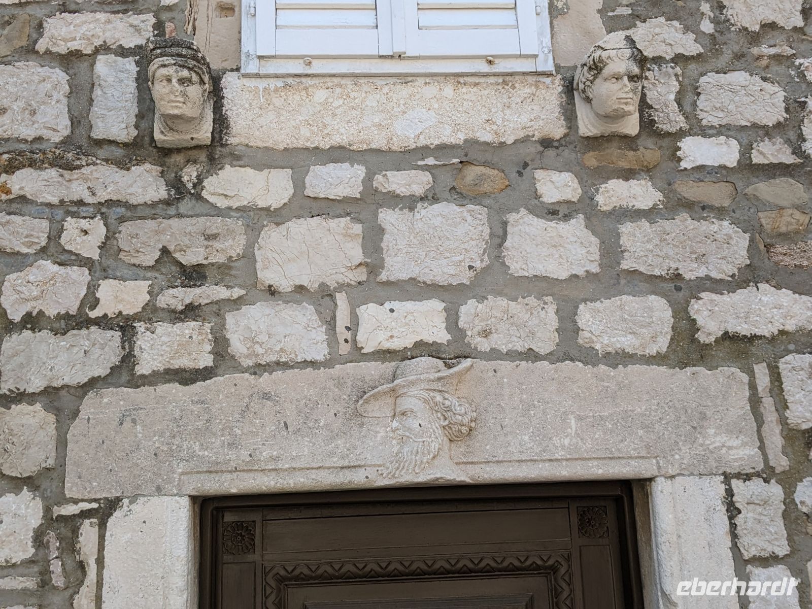 Auch andere Besonderheiten der Altstadt von Trogir sind äußerst sehenswert - etwa die außerhalb der Mauern gelegene Festung Kamerlengo, die originelle kleine Loggia außen an der Stadtmauer neben dem südlichen See- oder Hafentor, in der früher alle die übernachten mussten, die es bis zur Schließung der Tore nicht mehr in die Stadt geschafft hatten oder die Reste eines seltenen griechischen Tempels. Selten deshalb, weil er dem wenig bekannten Gott Kairos gewidmet war, dem „Gott des richtigen Augenblicks“.