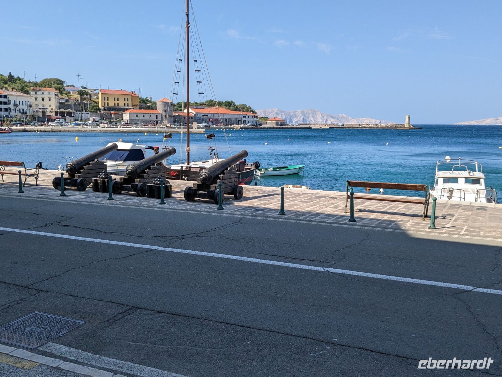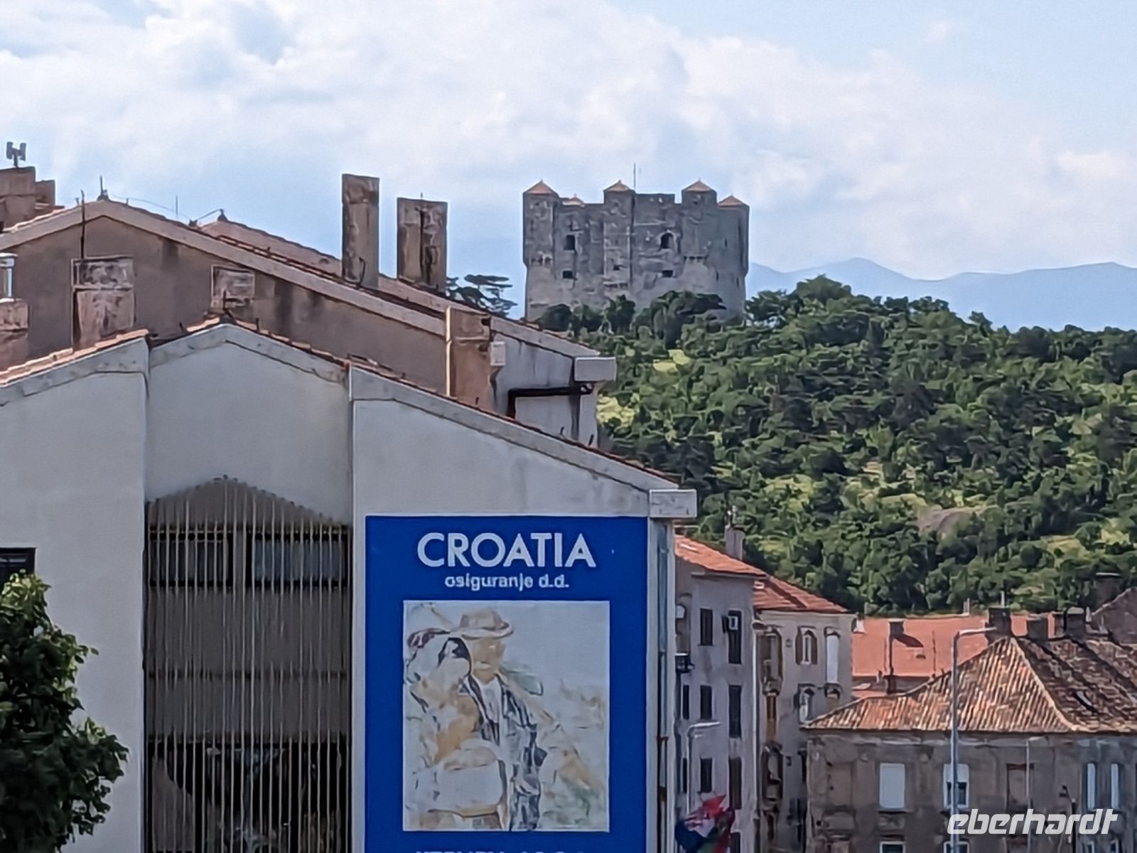 Am Morgen nahmen wir die Frühfähre zurück zum Festland und fuhren auf der „Jadranska magistrala“, der Adriamagistrale, weiter nach Norden. Nach kurzer Zeit erreichten wir den kleinen Hafenort Senj, der wegen seiner Bedeutung eine Fotopause wert war. Das Städtchen, einst Grenzstadt der Österreicher gegen das osmanische Reich wird überragt von der kleinen viereckigen Burg Nehaj, was soviel wie „Fürchte nichts!“ bedeutet, denn die Burg wurde im 16. Jahrhundert als Bollwerk und Sperrriegel an der wichtigen Adriastraße gegen das vordringende Reich der Osmanen errichtet und nie erobert! Auch die Kanonen an der Hafenpromenade und die Wehrürme am Hafen deuteten die Wehrhaftigkeit der Stadt an.