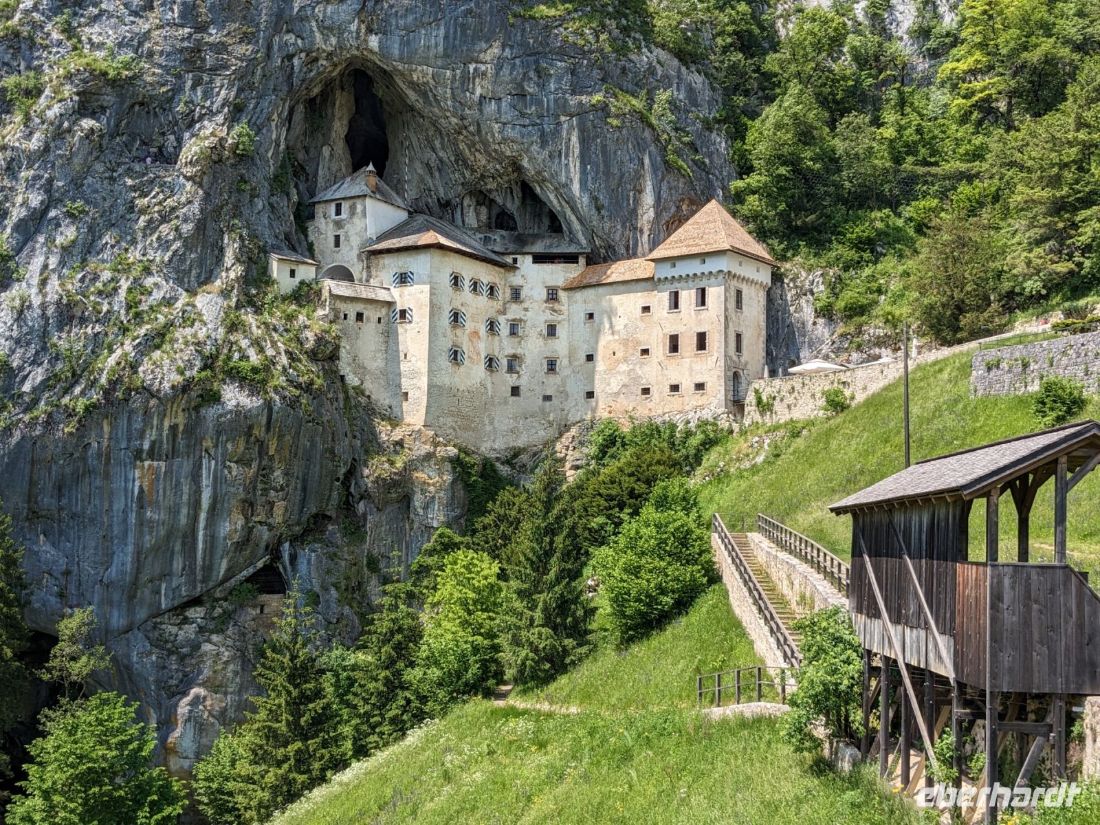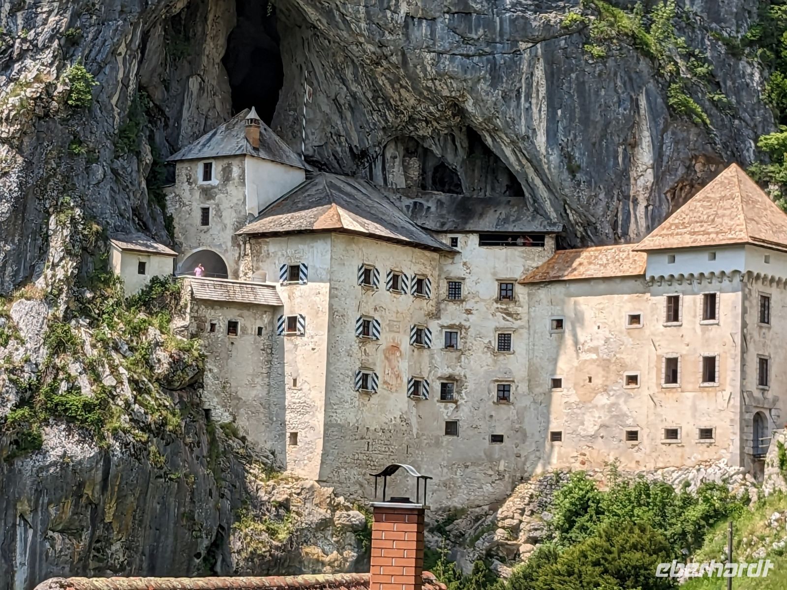Nach dieser Pause erreichten wir bald das letzte Stück kroatischer Autobahn und fuhren dann über die Fernstraße über die Grenze Sloweniens und zum Anschluss zur slowenischen Autobahn. Ganz im Sinne der Eberhardt „Richtig Reisen“-Philosophie legten wir für die Mittagspause noch einen kleinen Umweg ein: Diesen Aufenthalt machten wir in der interessanten Landschaft des slowenischen Karst, der auch die weltbekannten „Adelberger Grotten“ beherbergt. Hier liegt eine der interessantesten Burgen Europas: „Predjamski Grad“ (Vorhöhlenburg) wurde von den Österreichern früher „Höhlenburg Luegg“ genannt. Bereits im 12. Jh. wurde sie in eine gewaltige Karsthöhle gebaut – damit ist sie die einzige Burg Europas in einer Höhle. Ihr malerisches Aussehen war gewiss diesen kleinen Umweg wert, der uns nur ein paar Minuten zusätzlich zur Mittagspause kostete. Wo sieht man schon einmal eine Burg in einer Höhle über einem Abgrund mit gurgelnd im Boden verschwindendem Karstfluss? Die heutigen Gebäude stammen aus dem 16. Jahrhundert und sind mit einer interessanten Legende über einen ihrer Besitzer, den (Raub)Ritter Erasmus von Luegg verbunden. Der erlangte Berühmtheit dadurch, dass er bei einer langen Belagerung dem Kaiser trotzte, sich durch das Karsthöhlensystem heimlich versorgen ließ und nur mit List bzw. Verrat besiegt werden konnte.…