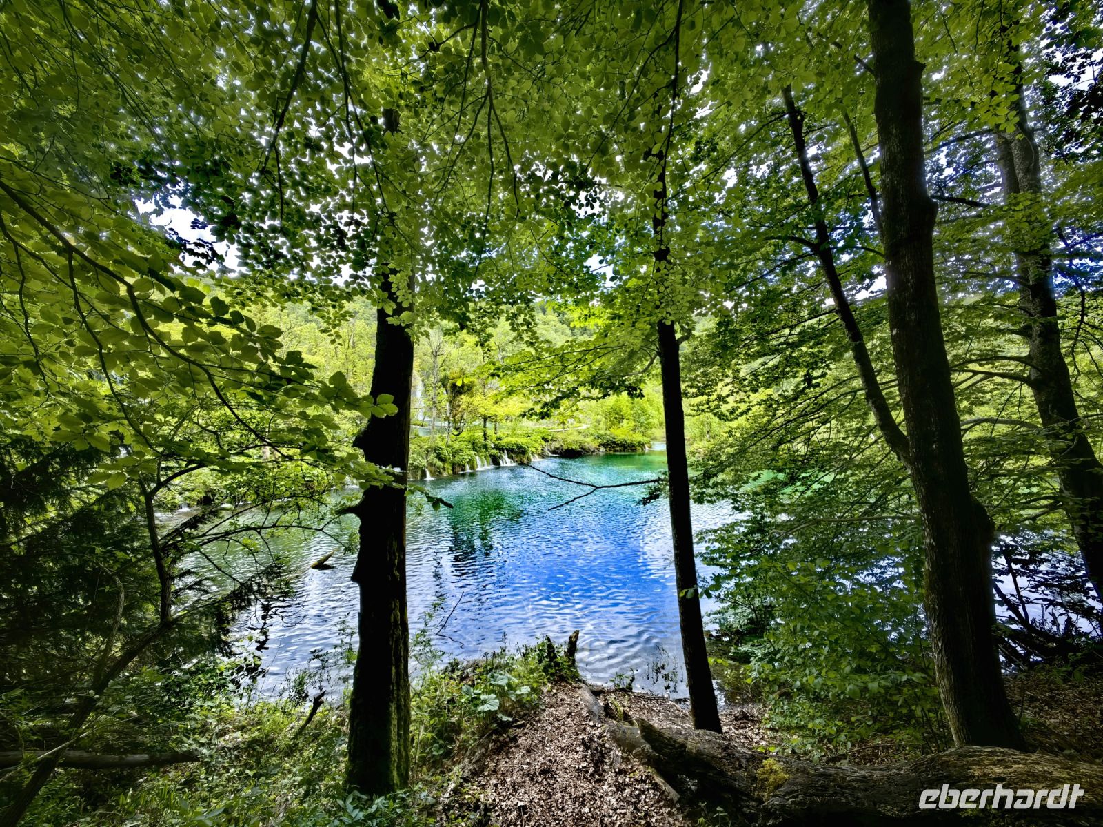 Wir laufen vorbei an blühendem Bärlauch, fahren mit dem Boot auf die andere Seite des unteren Sees und setzen unsere erste Runde fort. Uns begeistert das tiefe Türkisblau des Wassers, was im Licht glitzert und an den vielen Wasserfällen können wir uns gar nicht satt sehen. Die üppige Flora und Fauna umgibt uns und über die Holzstege laufen wir vorbei an den fischreichen Seen und entdecken sogar einen Feuersalamander, der sich am Wegesrand sonnt. Nach etwa zwei Stunden beenden wir die erste Runde und einige Gäste beschließen, zurück zum Hotel zu laufen und sich auszuruhen.