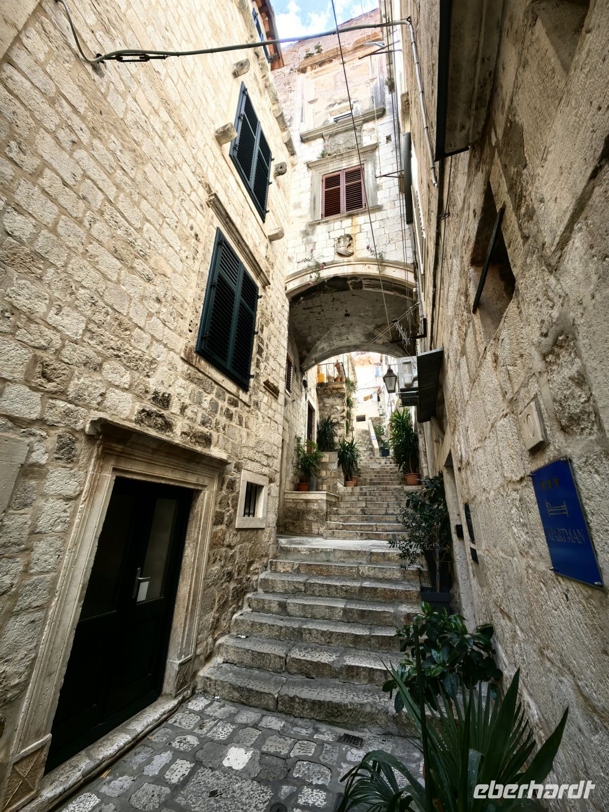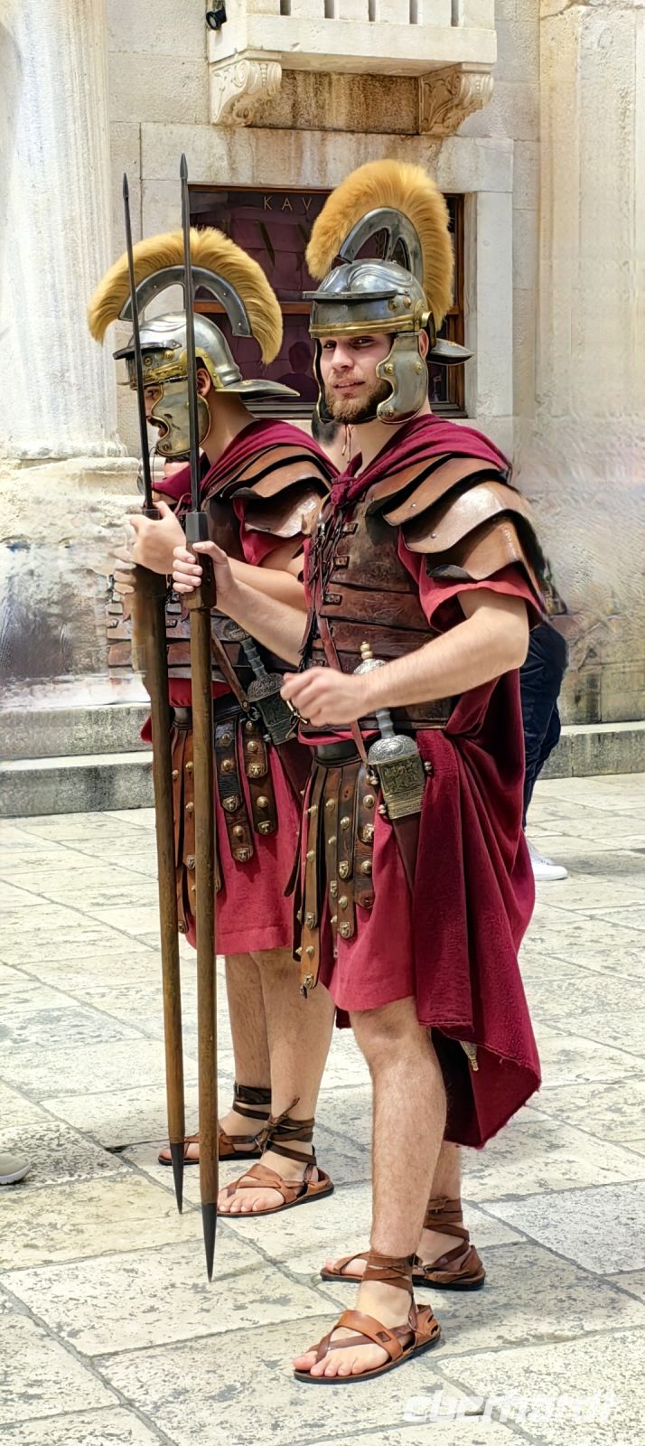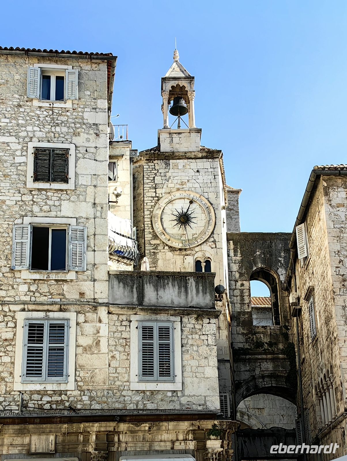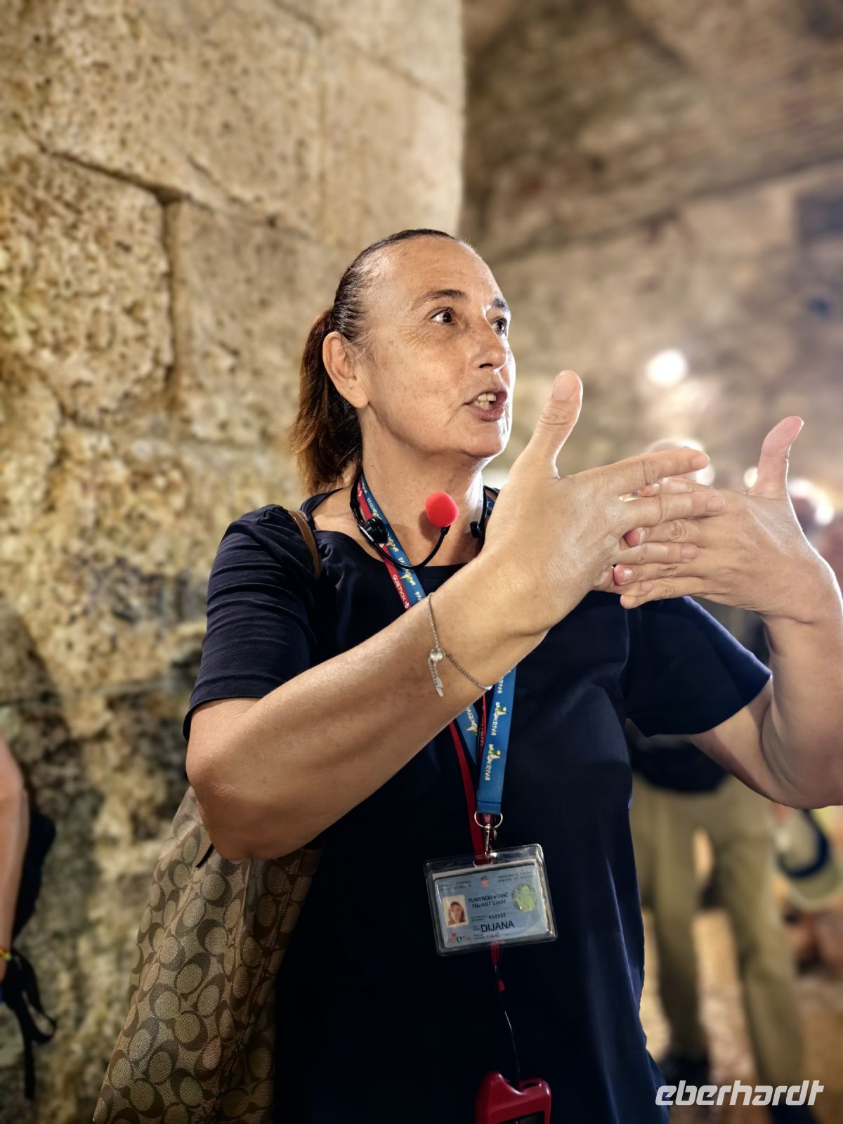 Zur Mittagszeit erreichen wir Split und unsere Stadtführerin Dijana nimmt uns mit auf eine Reise ins dritte Jahrhundert. Diokletian, der römische Kaiser und Erbauer des gleichnamigen Palastes, herrschte hier einst mit eiserner Hand. Viele Christen flohen vor ihm, erwartete sie beim Bekenntnis zu ihrem Glauben der sichere Tod. Auch vor seiner eigenen Familie machten seine Grausamkeiten keinen Halt und als er feststellte, daß Frau und Tochter den christlichen Glauben praktizierten, ließ er sie töten. Diese rohe Herrschaft bescherte ihm viele Feinde und daher wurden große Teile seines Palastes nach seinem Ableben zerstört. Die erhaltenen Fragmente fügen sich heut in die von engen Gassen geprägte Altstadt Splits ein. Wir bummeln durch die verwinkelten Ecken und finden viele kleine pittoreske Details und Fassaden.
