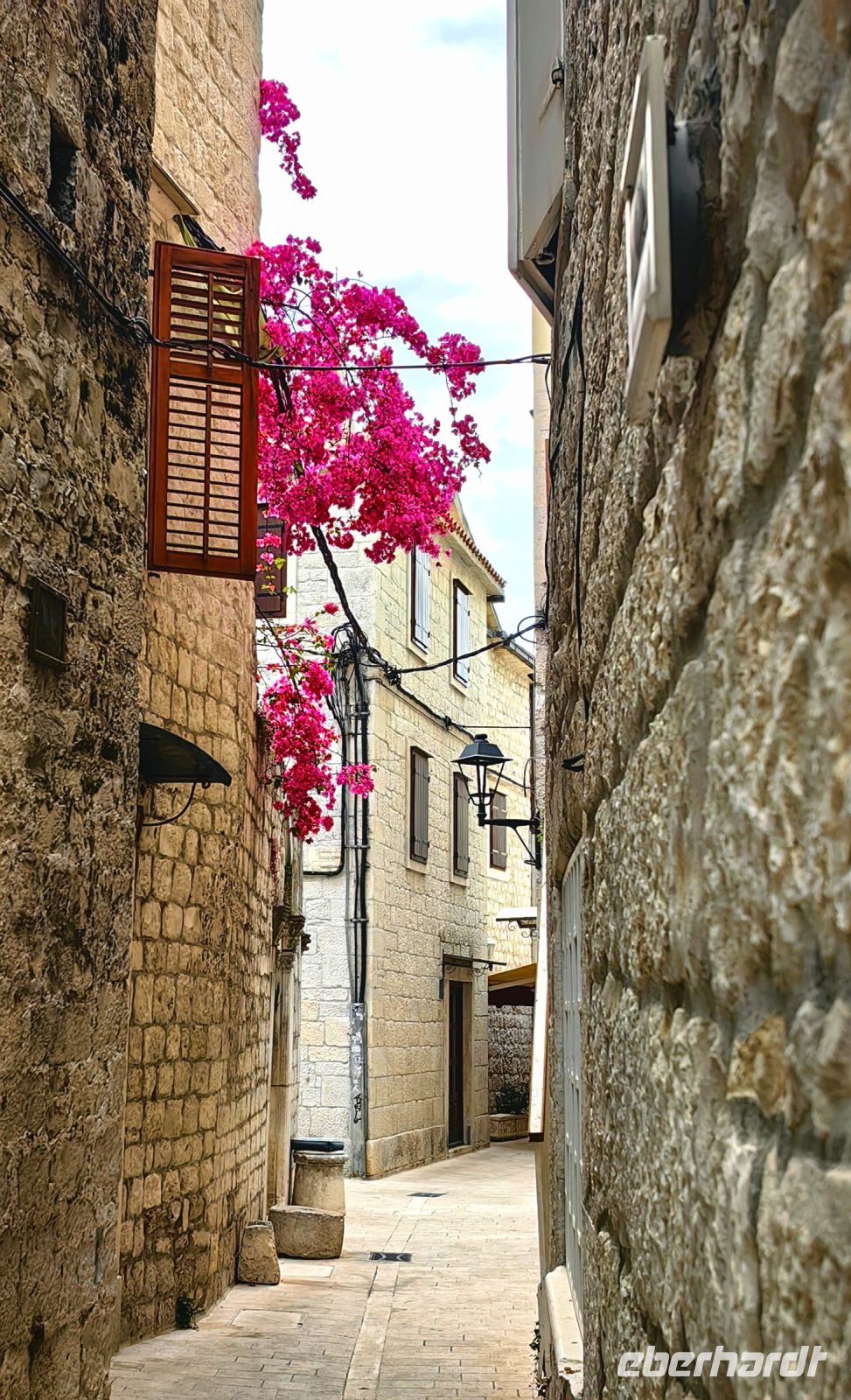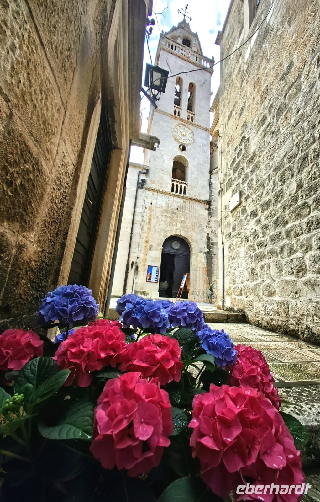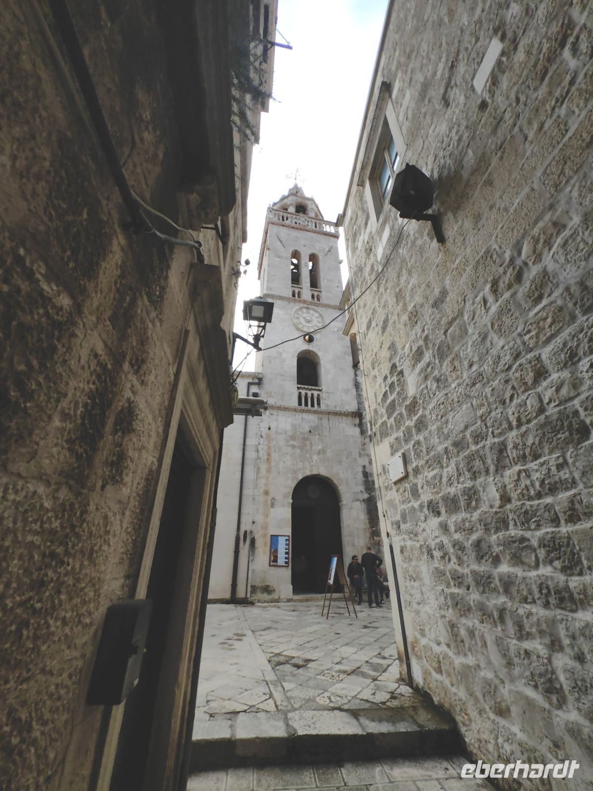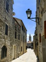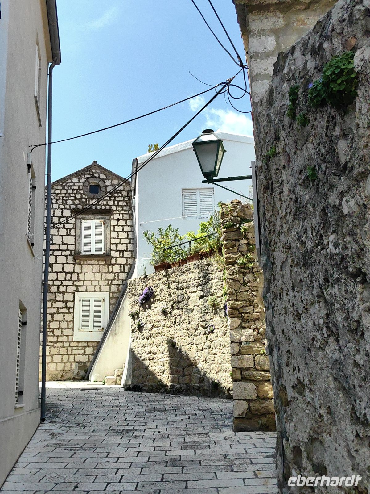 Auch hier auf der Insel finden sich Reste von illyrischen, römischen und griechischen Siedlungen und die Stadt entwickelte sich im Laufe der Jahrhunderte zum administrativen Zentrum der Insel. Die Stadtmauer aus dem 13. Jahrhundert ist heute in Teilen noch erhalten und durch das damalige Eingangstor muß man auch heute noch die Treppen empor in die Altstadt steigen. Sofort sieht man die Mischung einer vor allem von der Renaissance und teilweise vom Barock geprägten Architektur mit engen Gassen, steilen Treppchen, verwinkelten Kirchen und kleinen Lädchen.