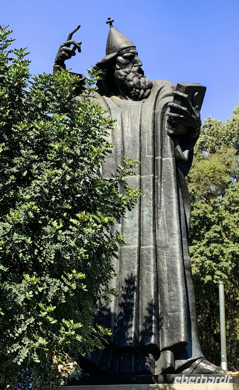 Am Ende unserer Führung stehen wir vor dem überlebensgroßen Denkmal des Gregor von Nin (kroatisch Grgur Ninski), der von 900 - 929 Bischof der Stadt Nin war und dem man zuschreibt, er habe sich dafür eingesetzt, die Gottesdienste der damaligen Zeit nicht wie üblich in Latein, sondern in der slawischen Sprache zu halten und dem ebenfalls besondere Verdienste bei der Förderung der glagolitischen Sprache nachgesagt werden.