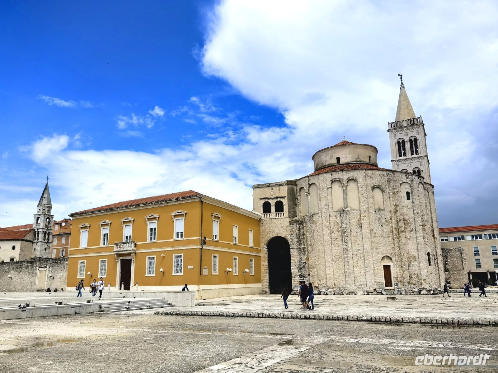 Auf den Spuren der Geschichte wandeln wir weiter und sehen die Reste des Forum Romanum, welches vom 1. Jahrhundert vor Christus bis zum 3. Jahrhundert nach unserer Zeitrechnung erbaut wurde und heute mitten im Zentrum der Altstadt liegt. Innerhalb des damaligen Forums steht die St. Donatus Kirche, die das Wahrzeichen von Zadar ist. Die St. Anastasia Kathedrale besichtigen wir ebenfalls. Sie wurde leider während der Belagerung der Stadt durch die Kreuzfahrer und die Venezianer schwer beschädigt und man brauchte das gesamte 13. Jahrhundert, um sie wiederherzustellen. Neu eingeweiht wurde sie 1285, als Vorbild hatte die Kirche Santa Maria della Piazza in Ancona gedient. Die letzten Arbeiten wurden in Zadar erst 1324 fertig und das Erdgeschoß und der erste Stock des Glockenturms kamen erst 1452 hinzu, der gesamte Turm wurde erst viel später, nämlich 1893 im neuromantischen Stil fertig gestellt.